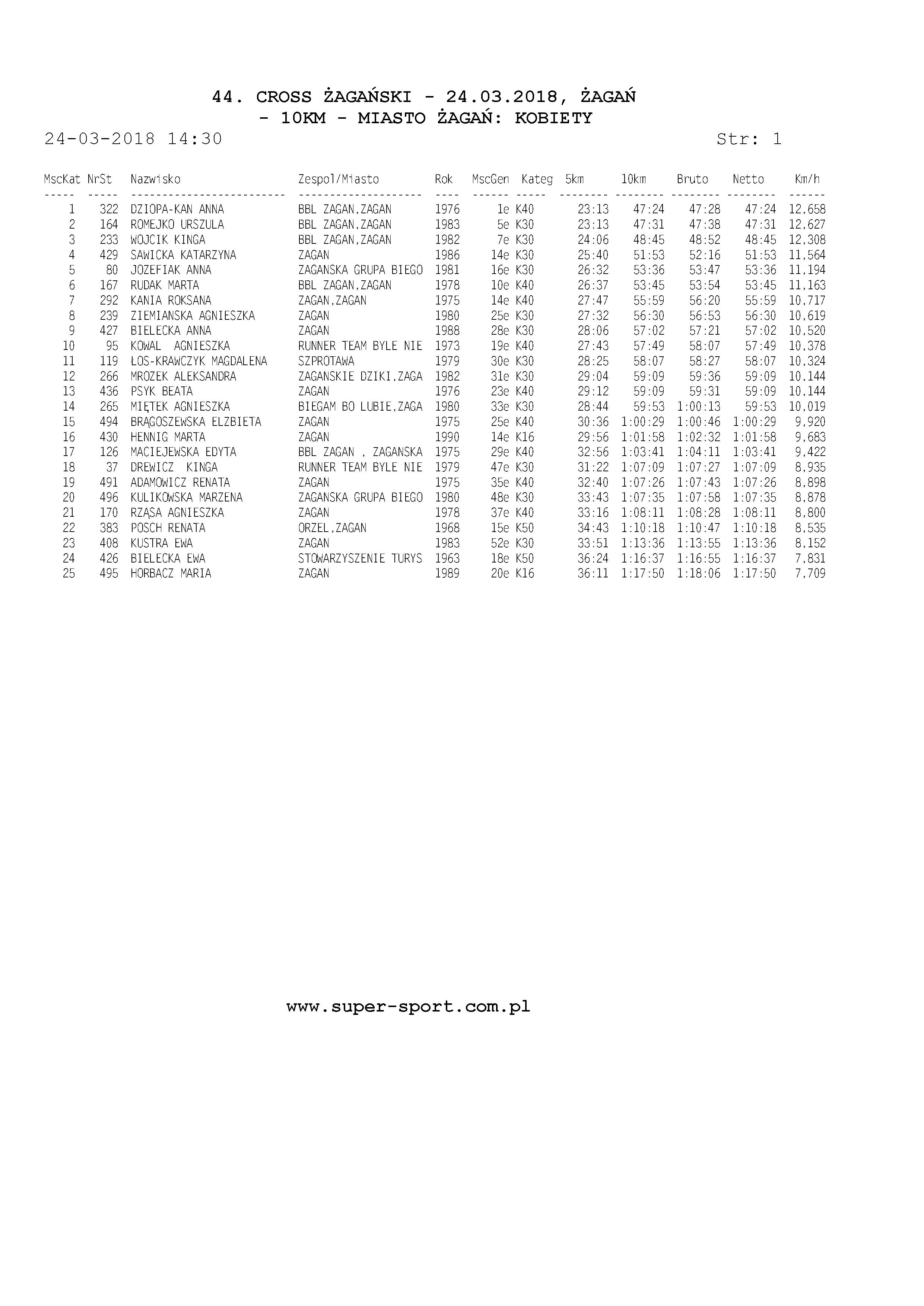 W grupie open kobiet reprezentujących Żagań najlepsza była Anna Dziopa-Kan z BiegamBoLubię – 47,24, druga Urszula Romejko z Urzędu Miasta Żagań i BBL – 47,31, trzecia Kinga Wójcik z BBL, strażniczka miejska – 48,45.
