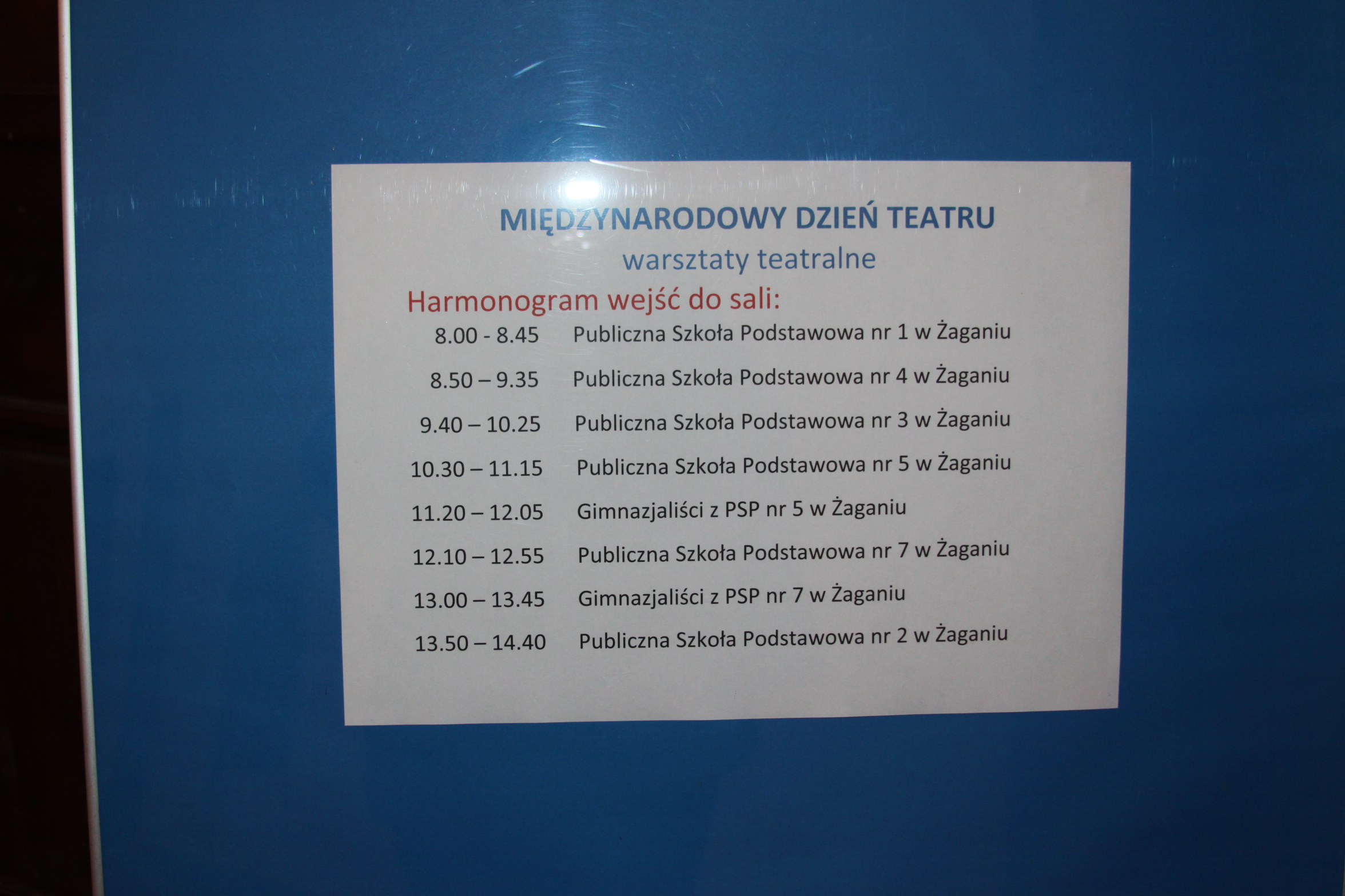 We wtorek 27 marca przypadła 57. rocznica Międzynarodowego Dnia Teatru. Z tej okazji uczniowie żagańskich szkół bawili się na warsztatach teatralnych z aktorem, dramaturgiem, reżyserem i dyrektorem Teatru Trójkąt Arturem Belingiem z Zielonej Góry.