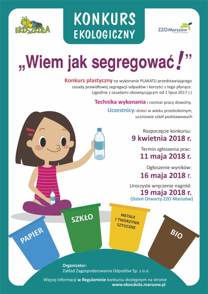 ZZO Marszów zaprasza przedszkola i szkoły podstawowe do wzięcia udziału w konkursie ekologicznym “Wiem jak segregować”. Dzieci mają za zadanie stworzyć indywidualną pracę plastyczną (plakat) przedstawiającą zasady prawidłowej segregacji odpadów i korzyści z tego płynące.