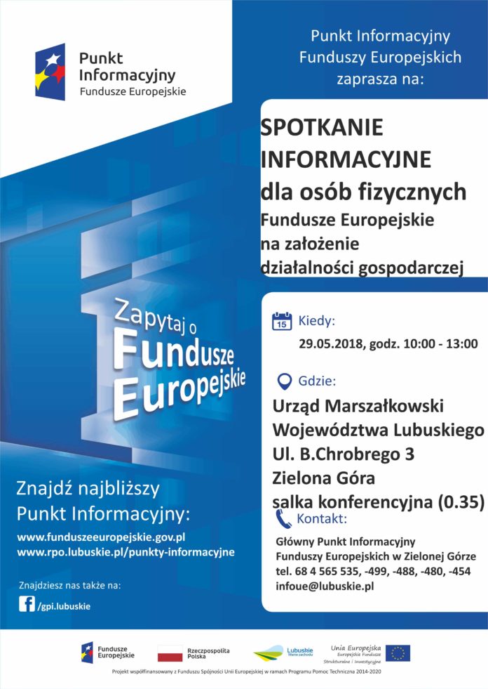 Główny Punkt Informacyjny Funduszy Europejskich w Zielonej Górze, działający w Urzędzie Marszałkowskim Województwa Lubuskiego, zaprasza na spotkanie informacyjne dotyczące możliwości pozyskania wsparcia na założenie działalności gospodarczej, które odbędzie się 29 maja 2018 r. w godzinach 10:00 – 13:00 w Zielonej Górze.