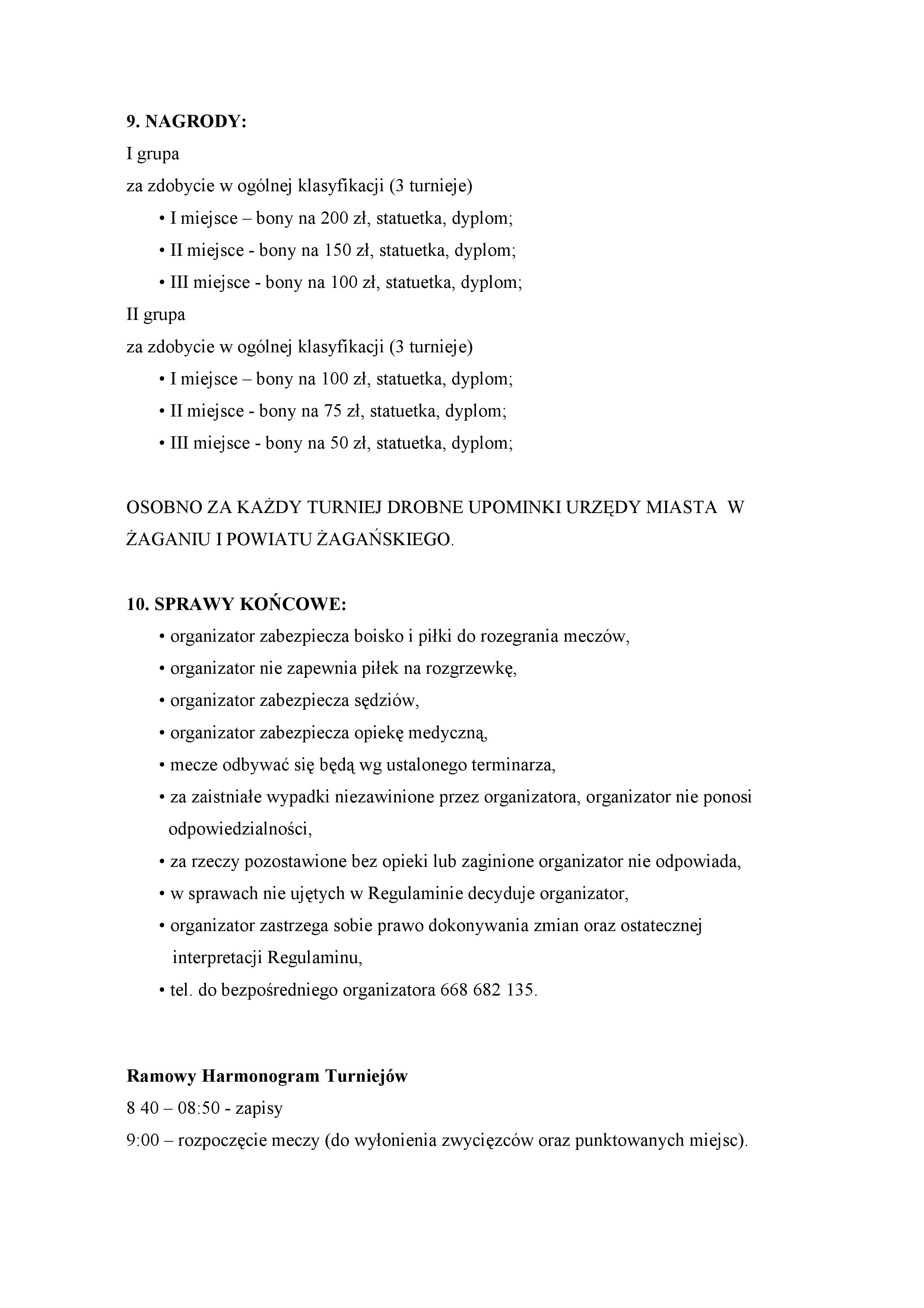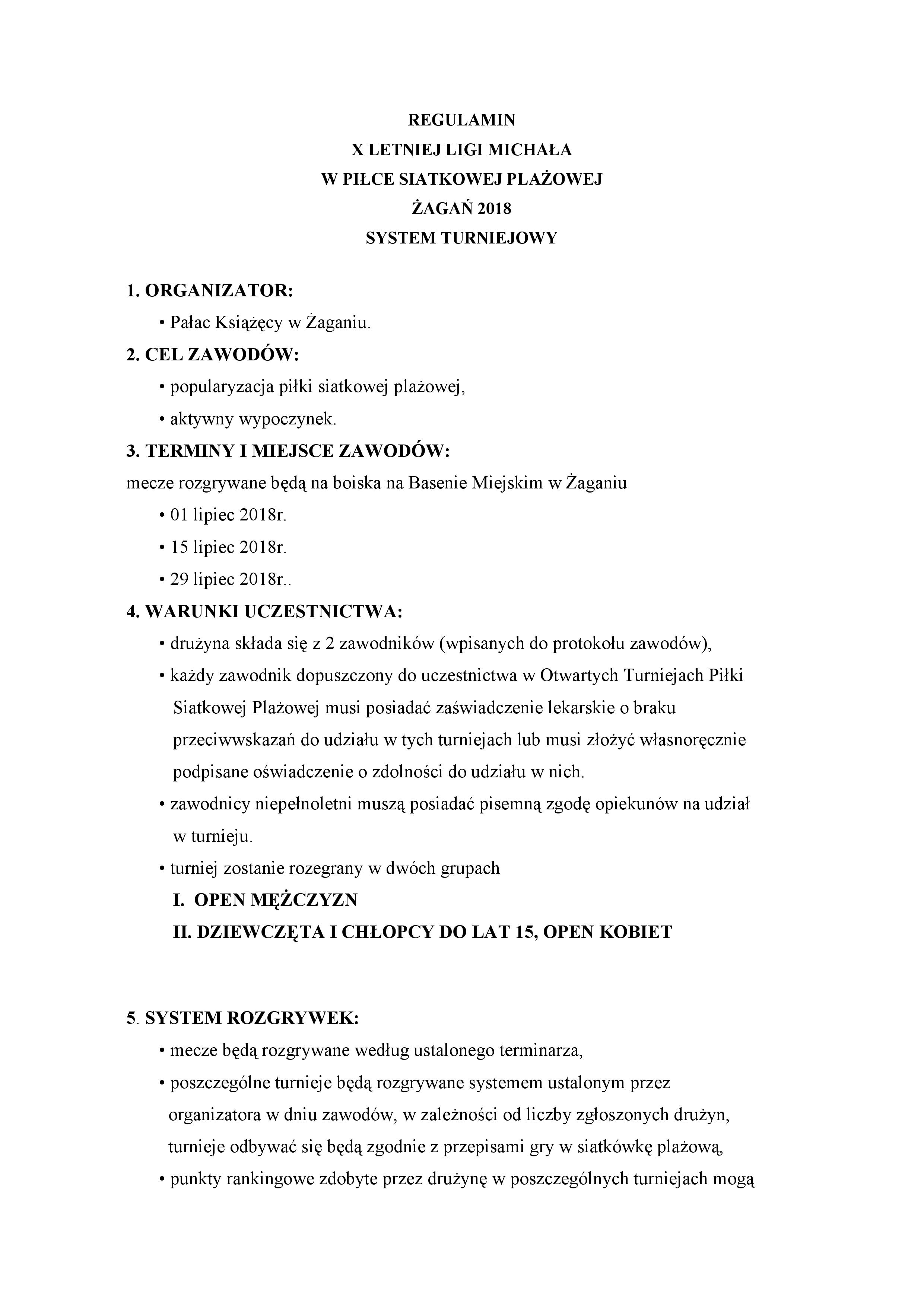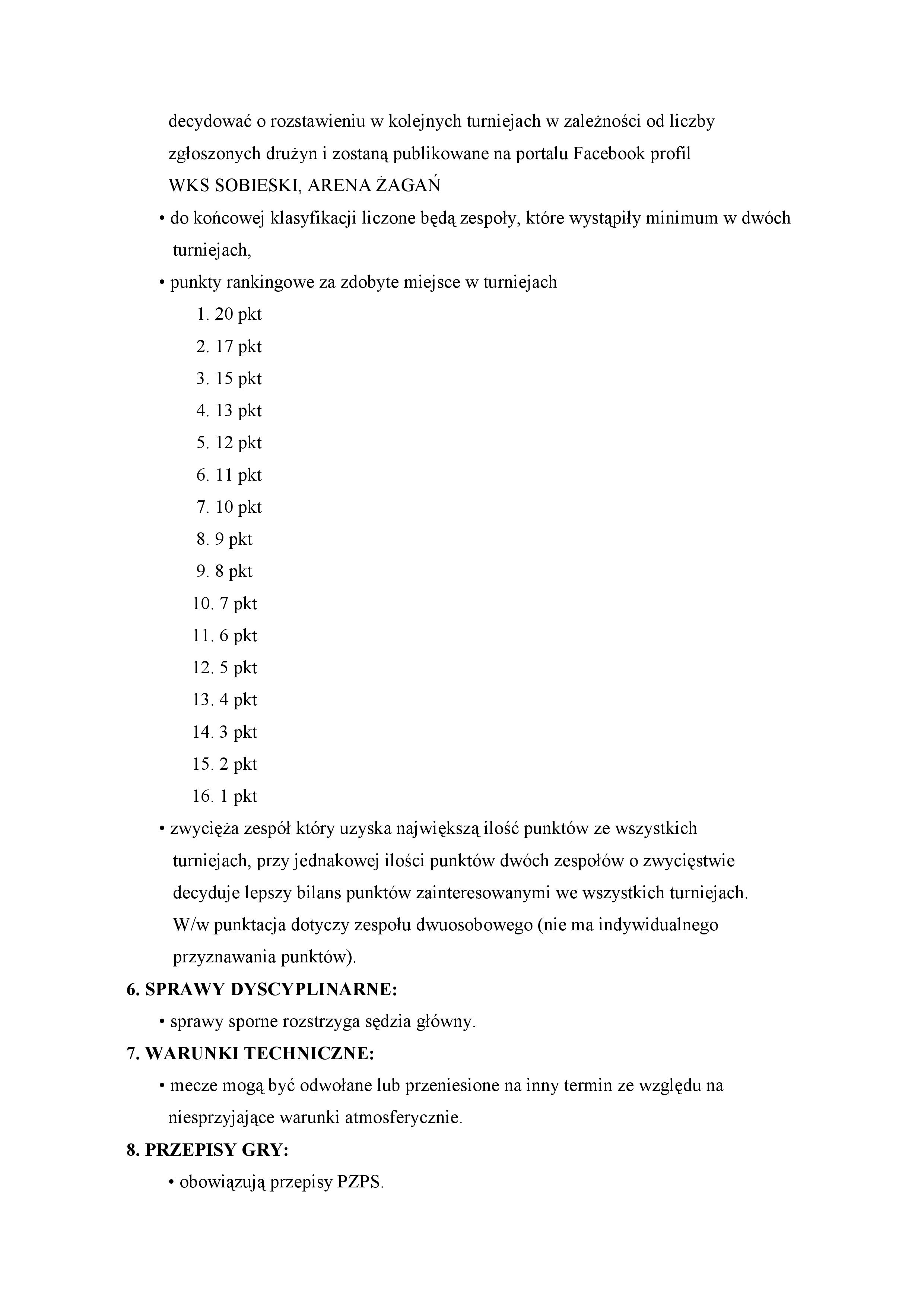 Każda drużyna składa się z dwóch zawodników (wpisanych do protokołu zawodów), każdy zawodnik musi posiadać zaświadczenie lekarskie o braku przeciwwskazań do udziału w turniejach lub musi złożyć własnoręcznie podpisane oświadczenie o zdolności do udziału. Niepełnoletni muszą posiadać pisemną zgodę opiekunów. Turniej zostanie rozegrany w dwóch grupach: pierwsza open mężczyzn, druga open dziewcząt i chłopców do lat 15 oraz kobiet. Regulamin imprezy poniżej lub na stronie www.arena.zagan.pl