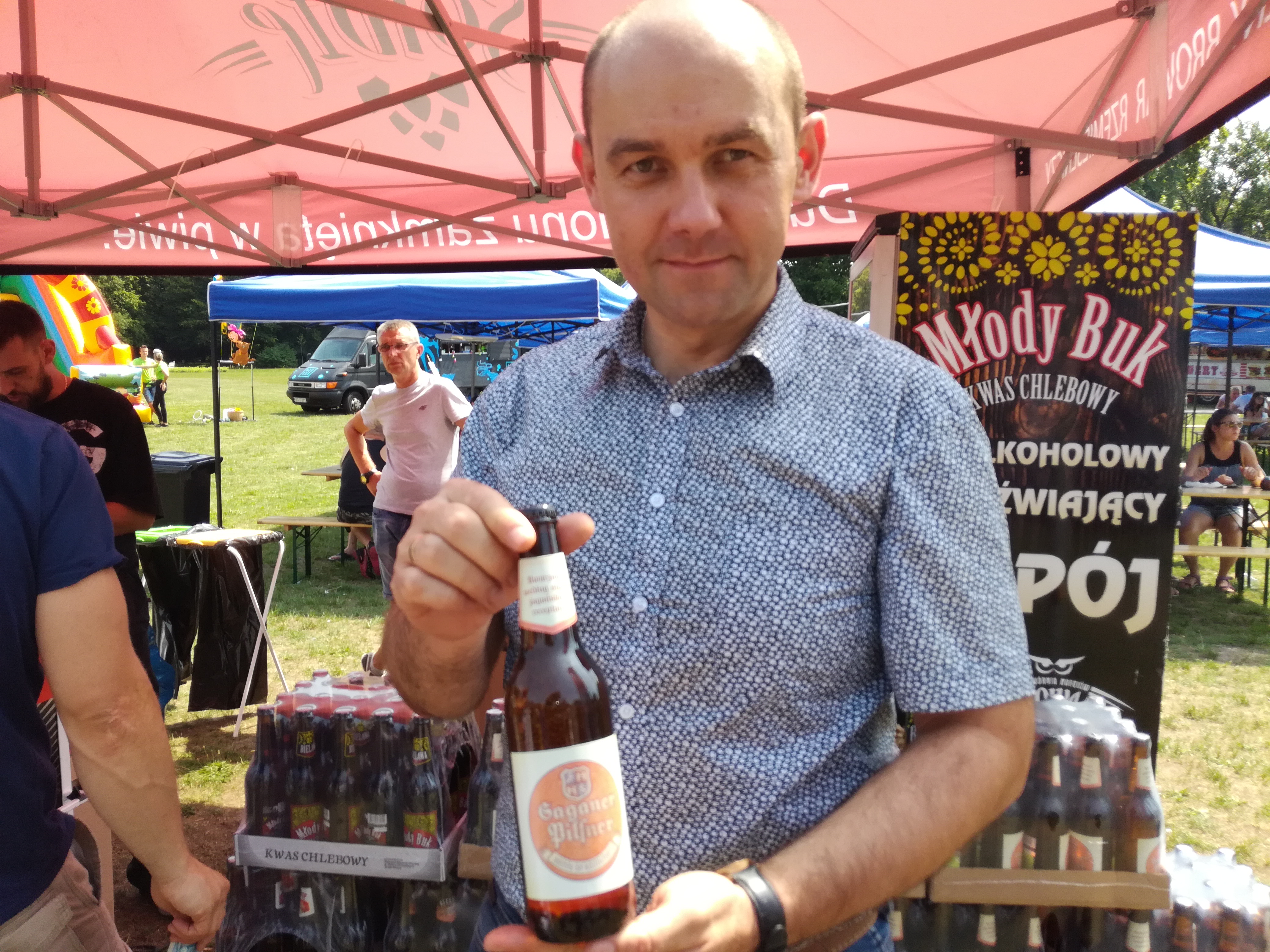 Paweł Lóssa pokazuje żagańskie piwo.