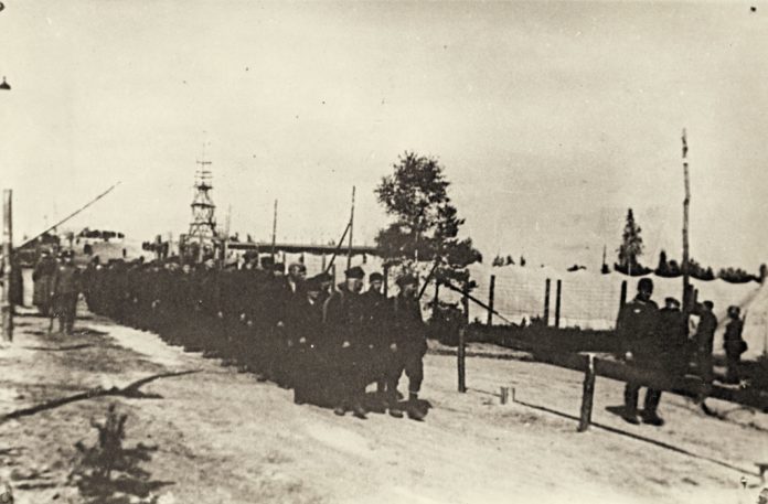 Kolumna jeńców polskich udających się do pracy poza teren obozu w Kunau. Zdjęcie ze zbiorów MOJ w Żaganiu.