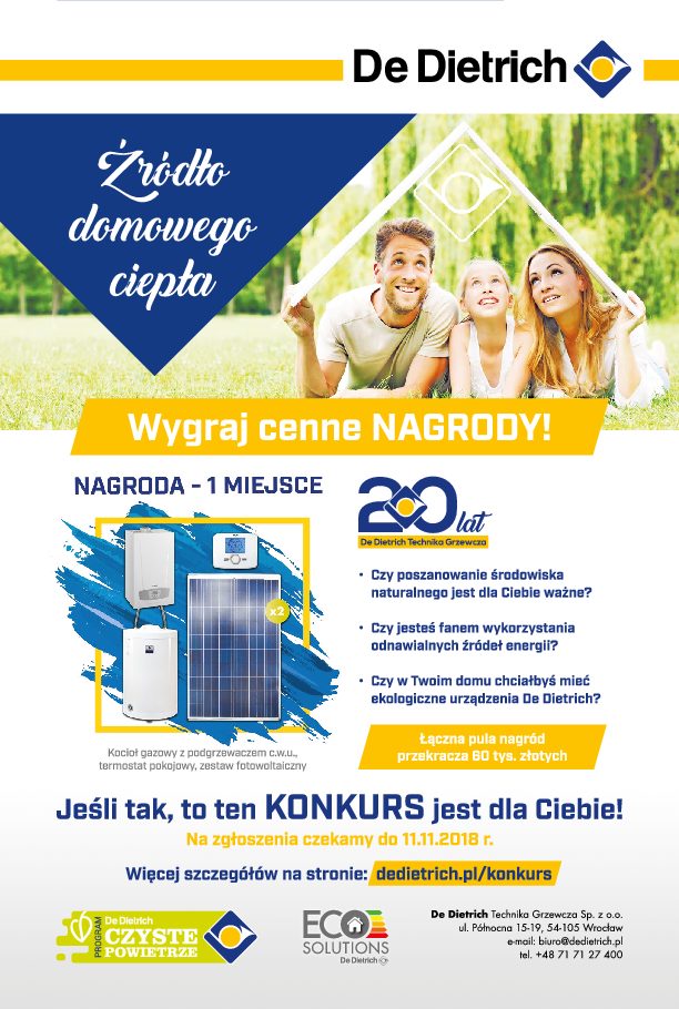 W związku z działaniami rządowymi w zakresie proekologicznego PROGRAMU CZYSTE POWIETRZE chcielibyśmy zainteresować Państwa konkursem „Źródło domowego ciepła”, jaki w ramach obchodów 20-lecia firmy De Dietrich Technika Grzewcza zorganizowaliśmy dla osób zainteresowanych wymianą starych, nieekologicznych źródeł ciepła w swoich domach. Starania firmy doceniła między innymi KRAJOWA AGENCJA POSZANOWANIA ENERGII, która objęła patronat konkurs. W jego ramach przewidziano 5 nagród o łącznej wartości ponad 60 tysięcy złotych. Wystarczy napisać krótki esej na temat konkursowy związany z ekologią w terminie do 11 listopada 2018 r. Dodatkowe informacje dotyczące konkursu zamieszczono na specjalnej stronie.