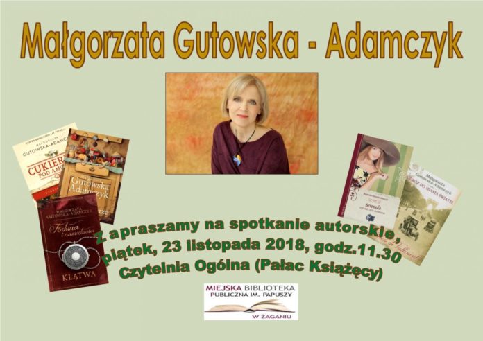 Miejska Biblioteka Publiczna im. Papuszy zaprasza w piątek 23 listopada o godz. 11.30 na spotkanie autorskie z powieściopisarką Małgorzatą Gutowską–Adamczyk.