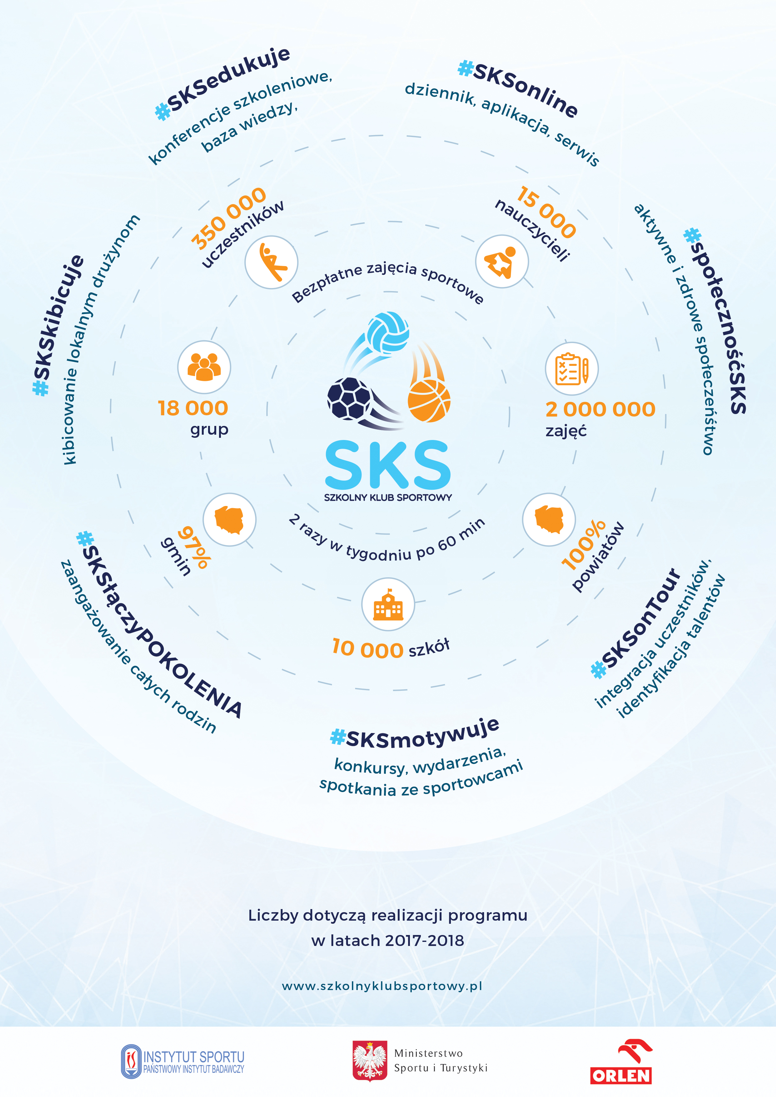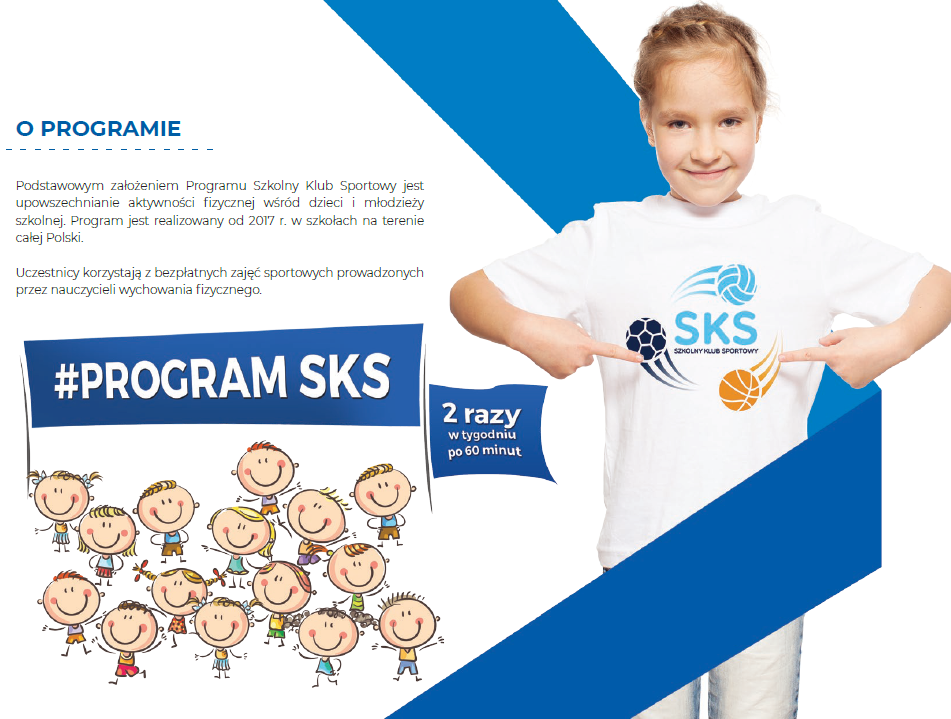 Program Szkolny Klub Sportowy to ogromna różnorodność proponowanych zajęć i możliwość spędzenia czasu wolnego w atrakcyjny sposób. W ramach programu realizowanych jest ok. 70 sportów, więc każdy może znaleźć coś dla siebie. Jednak SKS to nie tylko zajęcia sportowe w szkołach, SKS to ludzie, to społeczność, która zna wartość aktywności fizycznej i zaraża pasją do sportu!
