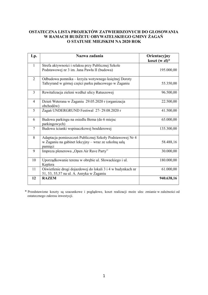 Zgodnie z harmonogramem Żagańskiego Budżetu Obywatelskiego 2020 publikujemy ostateczną listę projektów zatwierdzonych do głosowania. Równocześnie przypominamy, że głosowanie na poszczególne propozycje rozpocznie się 24 września i potrwa do 4 października. Wówczas opublikujemy odpowiedni formularz, zachęcając Państwa równocześnie do aktywności w wyborze zadania, które uważacie za konieczne do zrealizowania w Żaganiu w 2020 roku.