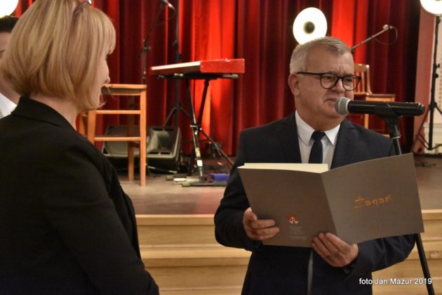 Zastępca Burmistrza Sebastian Kulesza wspólnie z Naczelnikiem Oświaty UM Mariuszem Krygłym podziękował nauczycielom za pasję i wytrwałość w codziennej pracy. Gospodarze miasta wspólnie wręczyli pamiątkowe dyplomy i wyróżnienia nagrodzonym nauczycielom oraz pracownikom szkół i przedszkoli. Prezes oddziału ZNP w Żaganiu Romana Błahuta wręczyła medal za długoletnie członkostwo w Związku Ryszardowi Szumińskiemu. Uroczystą galę z okazji Dnia Edukacji Narodowej zakończył koncert Mateusza Ziółko.