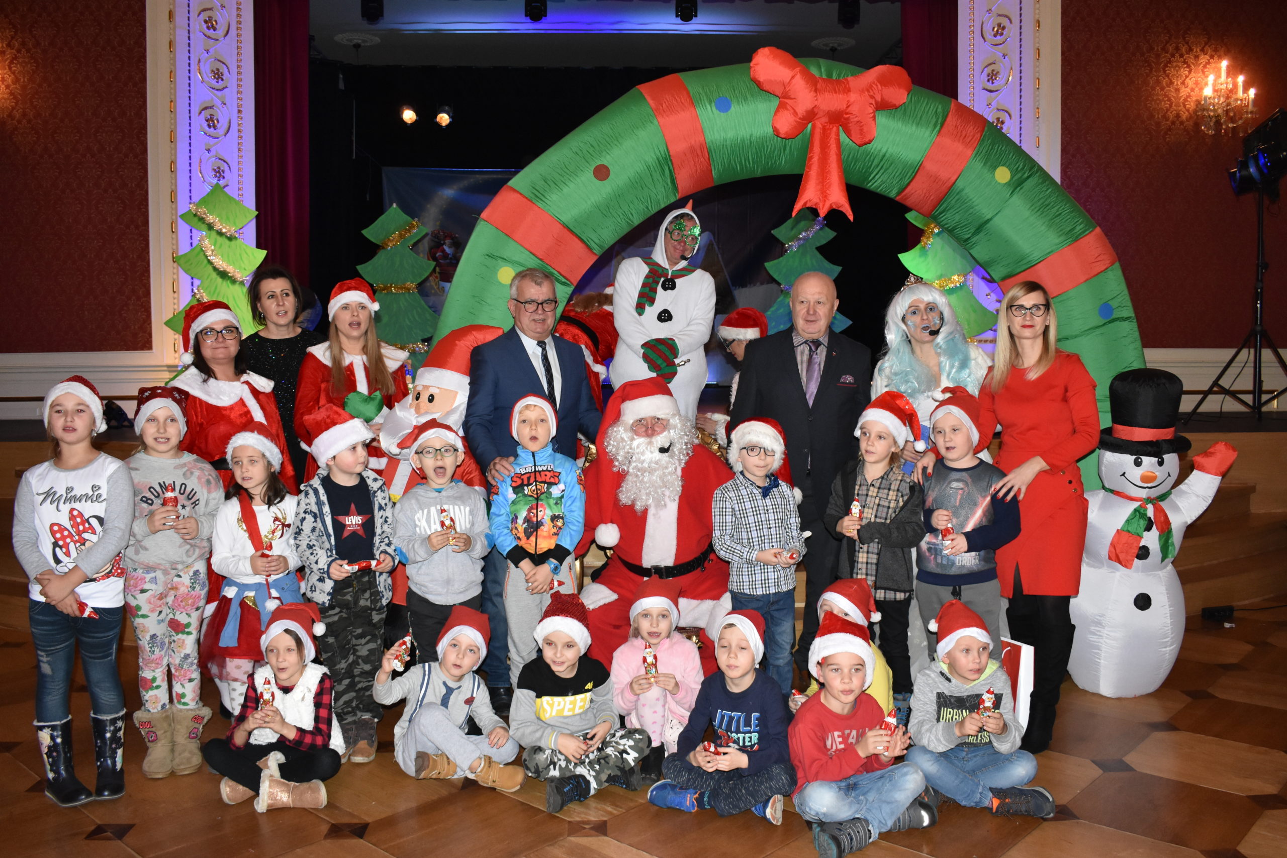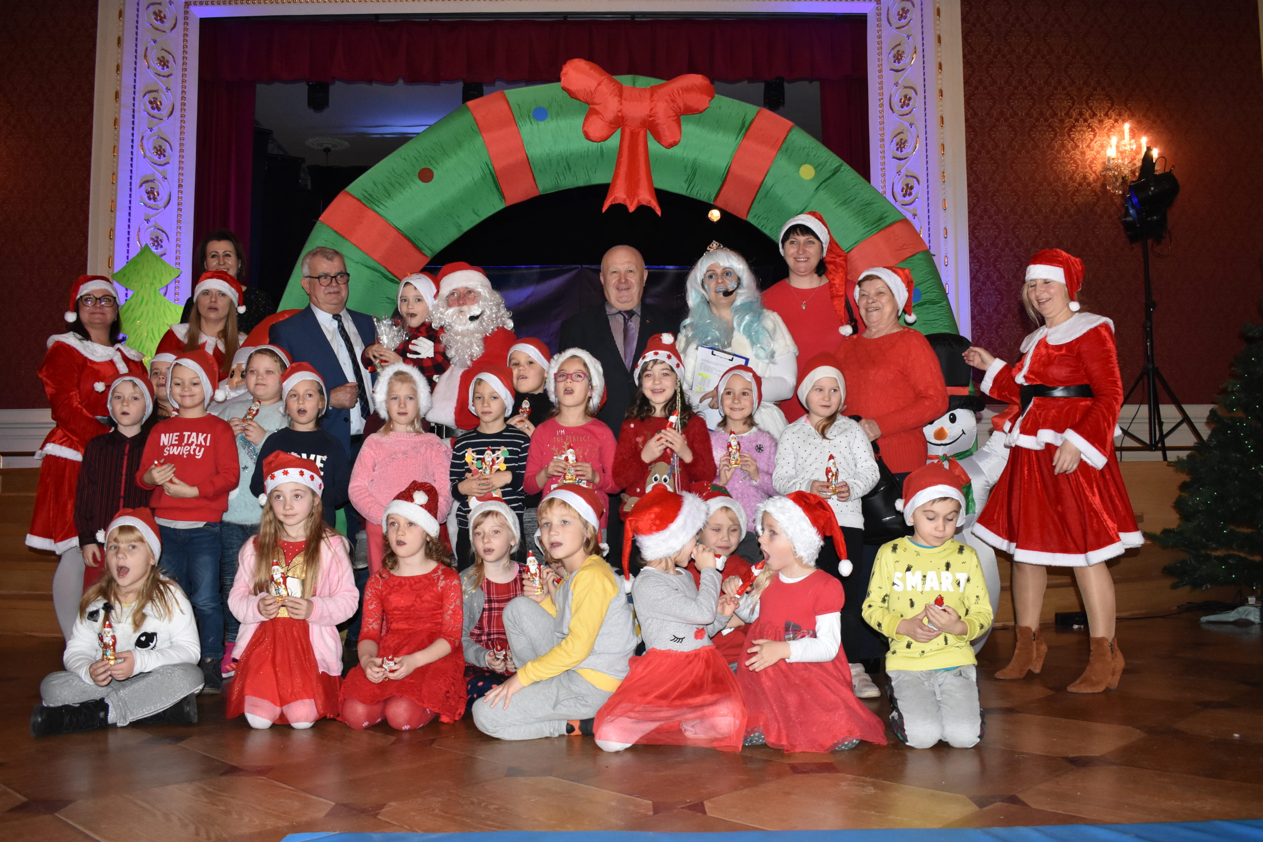 6 grudnia2019 roku do dzieci przedszkolnych z Żagania przyjechał Święty Mikołaj. Zanim dotarł na spotkanie, został zatrzymany przez Królową Śniegu. Aby uwolnić Mikołaja i otrzymać drobne upominki, nasze maluchy musiały wykonać wspólnie kilka zadań – rozwiązać rymowane zagadki, ruszyć w podróż pociągiem oraz stworzyć z siebie żywą orkiestrę. W trakcie spektaklu było wiele emocji, śmiechu, ale i obaw o uwięzionego Mikołaja. Na szczęście dzięki bałwankowi, pajacykowi i śnieżynce wszystko dobrze się skończyło i każde z dzieci otrzymało z rąk świętego słodki upominek. W rozdawaniu prezentów asystował Mikołajowi burmistrz Andrzej Katarzyniec oraz przewodniczący rady Adam Matwijów.