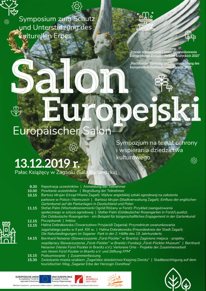 Salon Europejski realizowany jest w ramach projektu “Trwałe wzmocnienie i nowe ukierunkowanie Europejskiego Związku Parków Łużyckich 2021”. Projekt jest współfinansowany ze środków Europejskiego Funduszu Rozwoju Regionalnego w ramach Programu Współpracy INTERREG VA Brandenburgia – Polska 2014-2020.