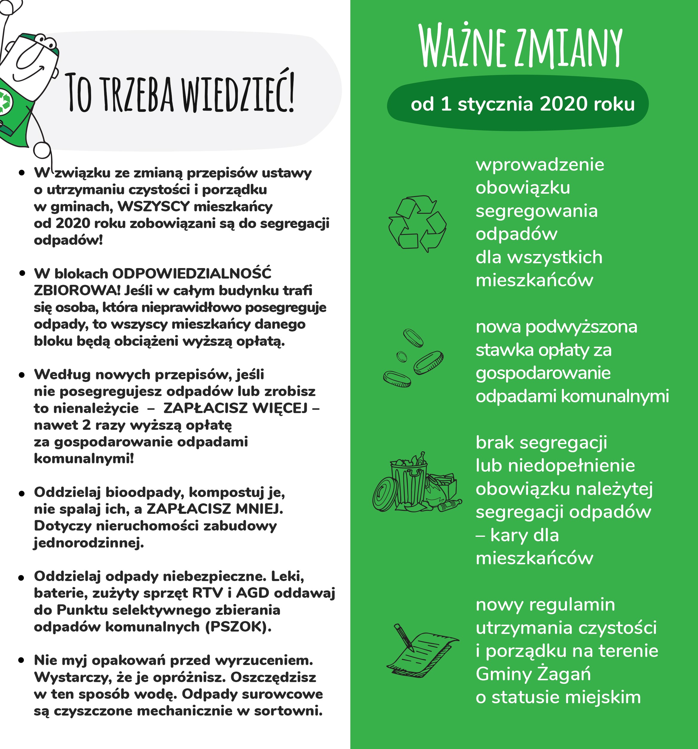 W związku z obowiązkiem segregacji odpadów, który od 1 stycznia 2020 roku objął wszystkich mieszkańców Polski, przypominamy o zasadach zbiórki odpadów na terenie Żagania.