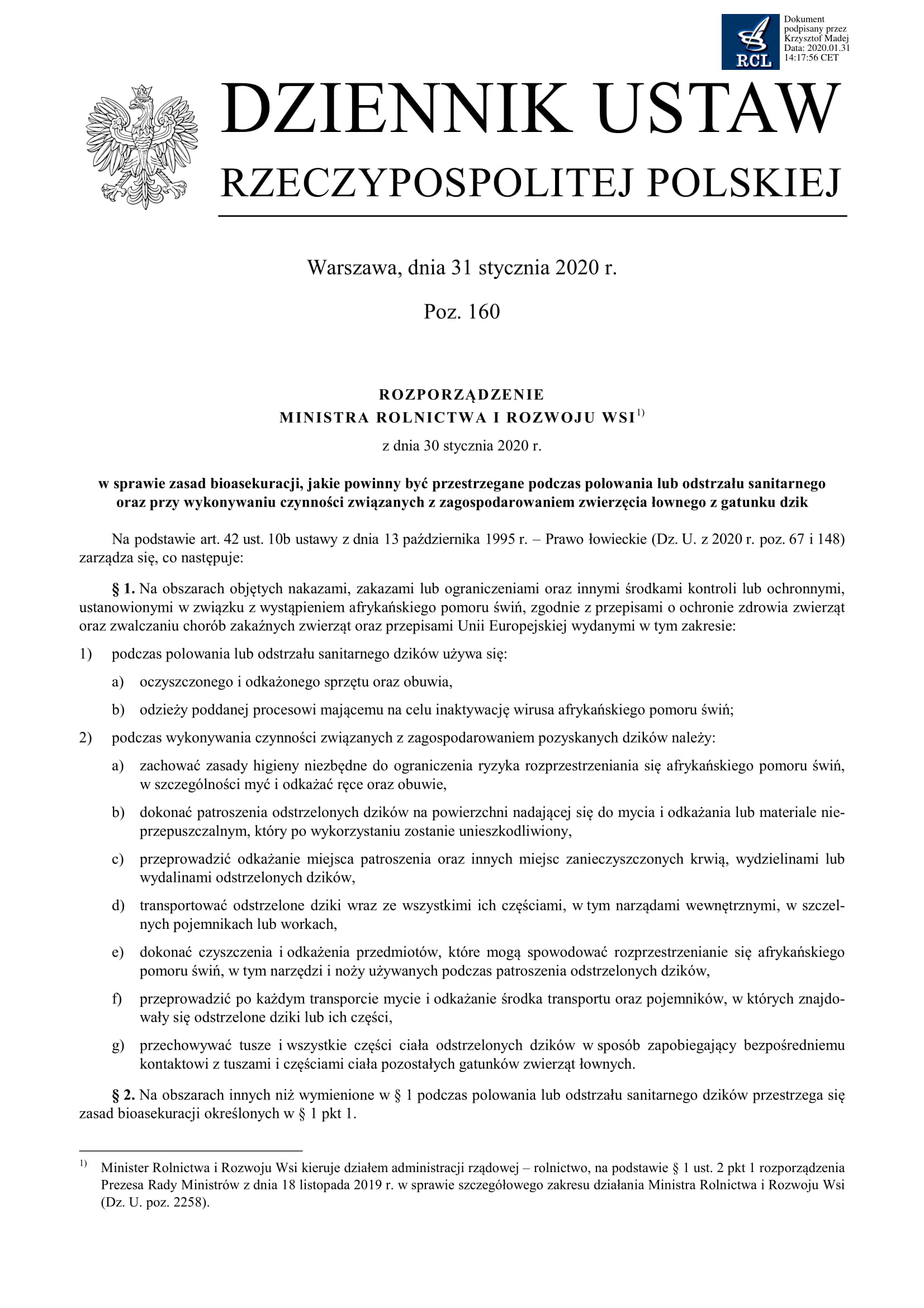 publikujemy obowiązujące rozporządzenie MRiRW z dnia 30 stycznia 2020 r. w sprawie zasad bioasekuracji, jakie powinny być przestrzegane podczas polowania lub odstrzału sanitarnego oraz przy wykonywaniu czynności związanych z zagospodarowaniem dzików (Dz. U. poz. 160).