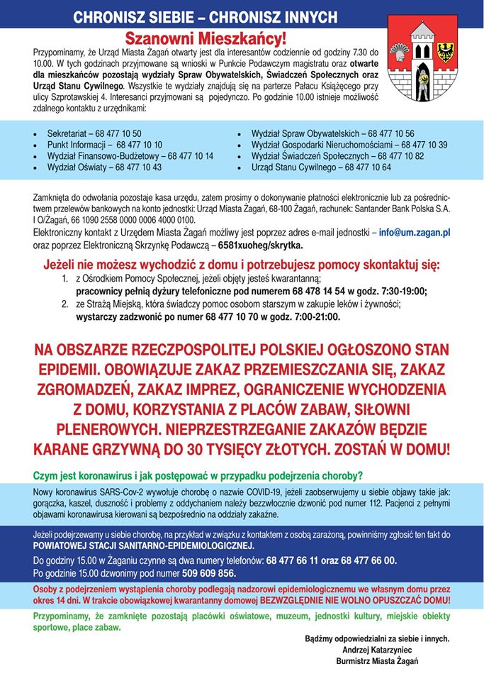 Miejski Zakład Komunikacyjny myje, dezynfekuje i ozonuje autobusy. Z materiałów powierzonych przez miasto spółka MPOiRD dezynfekuje przystanki autobusowe. Straż Miejska w Żaganiu stale prowadzi pomoc osobom starszym, dokonując zakupu leków i żywności według przekazanych potrzeb. Od soboty nasi strażnicy rozpoczną również wspólne patrole z funkcjonariuszami policji, kontrolując m.in. osoby przebywające na domowych kwarantannach.