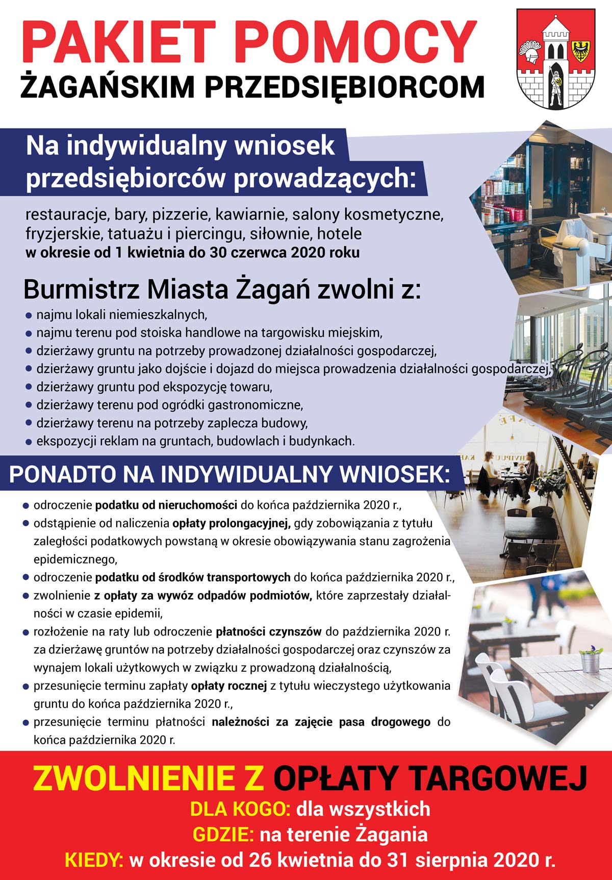 W dalszej części spotkania burmistrz Andrzej Katarzyniec zaprezentował Żagański Pakiet Pomocy Przedsiębiorcom, omawiając szczegółowo możliwości, jakie przygotowało miasto w ramach przeciwdziałania skutkom epidemii. Pomoc w pierwszym zakresie skierowana została do małych firm i osób prowadzących jednoosobowe działalności gospodarcze, właścicieli małych punktów handlowych, gastronomicznych i usługowych. Tych, którzy z uwagi na panującą sytuację epidemiczną zmuszeni zostali do zamknięcia punktów handlowych zwolniono z płatności czynszów za swoje lokale i stoiska targowe, wprowadzono możliwość przesunięcia w czasie terminów zobowiązań podatkowych, zniesiono naliczanie opłaty prolongacyjnej, wprowadzono zwolnienia z dzierżaw za ogródki gastronomiczne czy ekspozycję towarów.