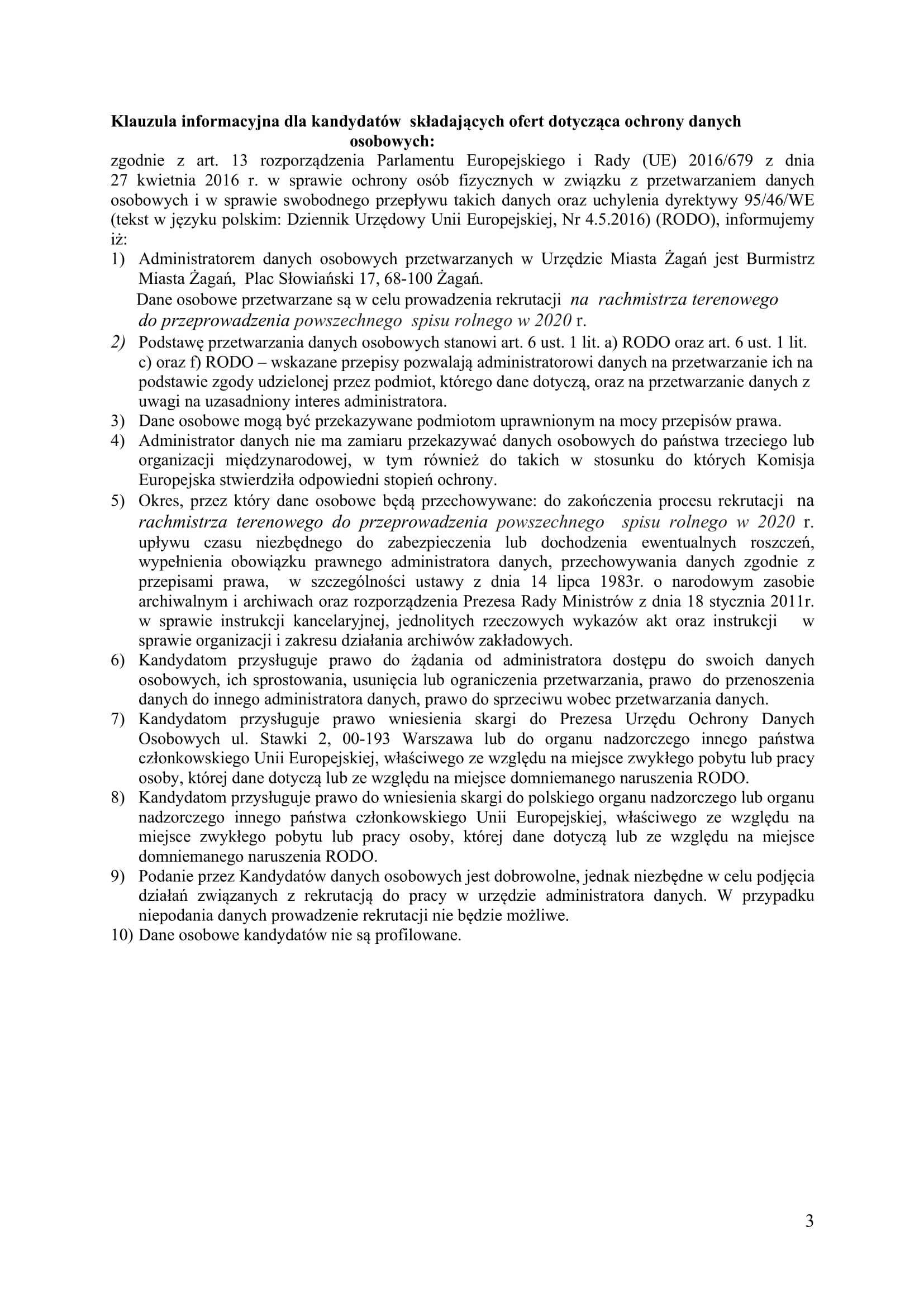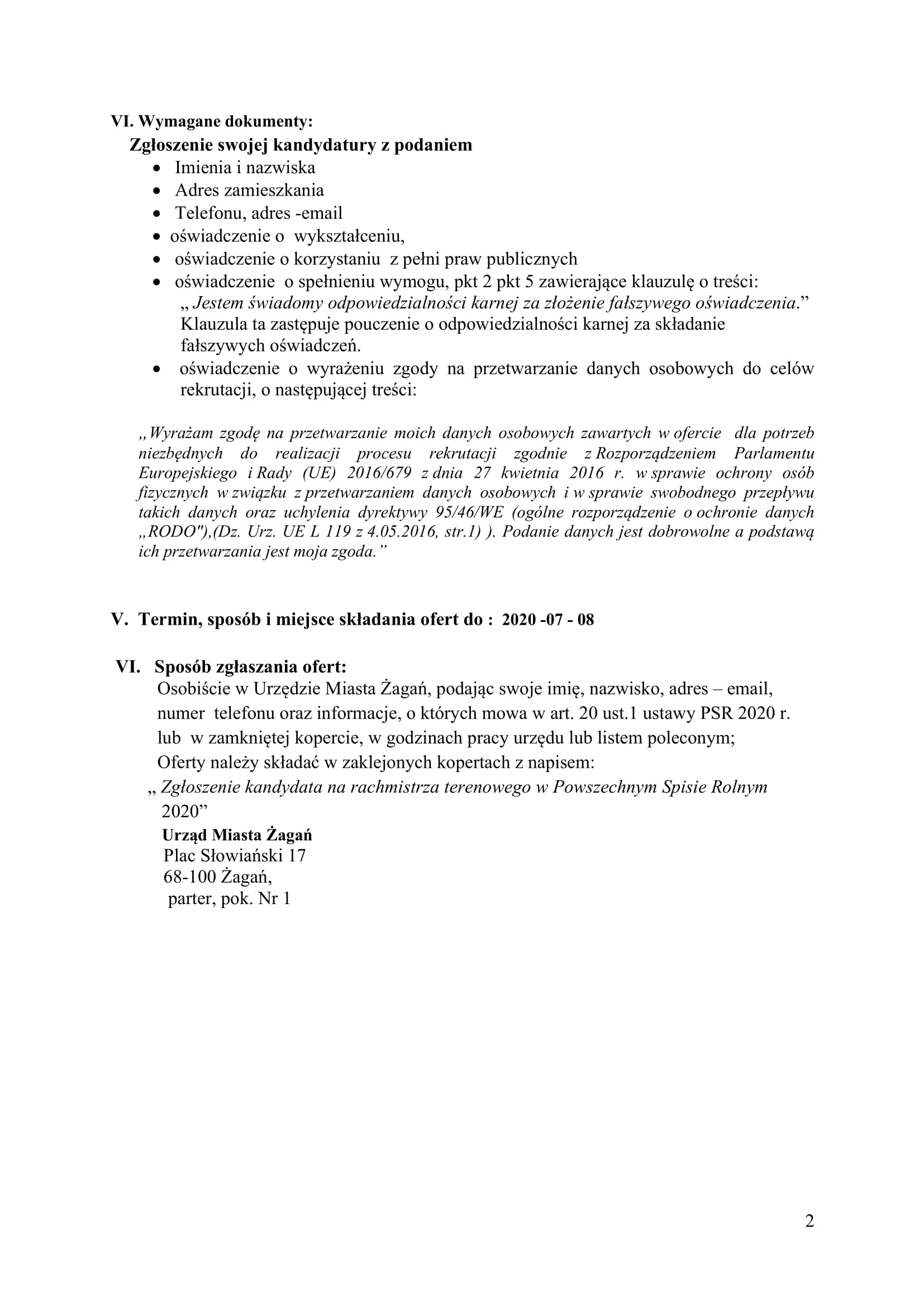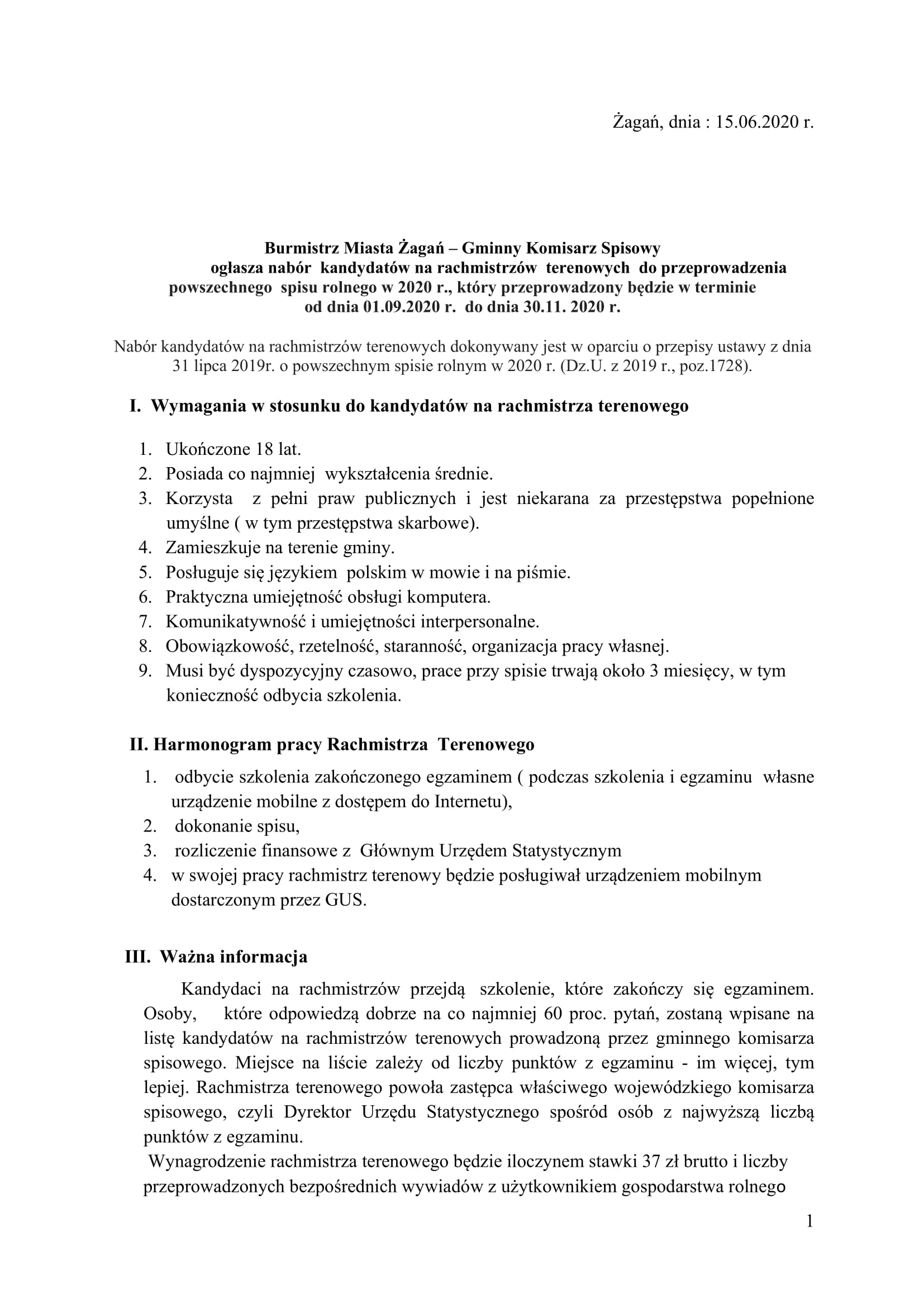 Gminny Komisarz Spisowy ogłasza nabór kandydatów na rachmistrzów terenowych do przeprowadzenia powszechnego spisu rolnego w 2020 r. w terminie od dnia 1 września 2020 r. do 30 listopada 2020 r.  Nabór ofert potrwa do 8 lipca 2020 r. Szczegółowe informacje, w tym wymagania wobec kandydatów na rachmistrzów, dostępne są na stronie BIP Urzędu Miasta Żagań.