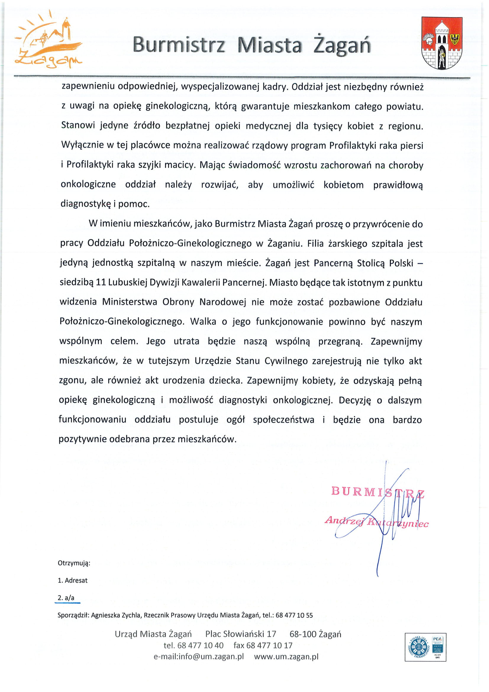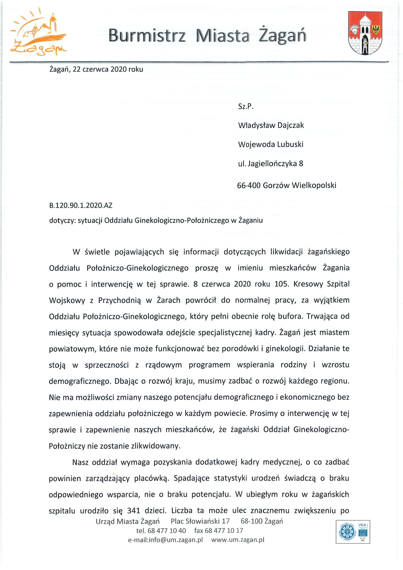 Wojewoda Lubuski wysłuchał postulatu władz miasta i zaproponował kolejne spotkanie dotyczące docelowej koncepcji sprawowania opieki położniczo-ginekologicznej, w którym udział wezmą przedstawiciele samorządu żagańskiego, Narodowego Funduszu Zdrowia, 105. Kresowego Szpitala Wojskowego w Żarach oraz konsultanci wojewódzcy w dziedzinie ginekologii i położnictwa oraz neonatologii. Rozmowy prowadzone przez wszystkie odpowiedzialne za funkcjonowanie oddziału podmioty pozwolą wypracować stanowisko w tej sprawie.
