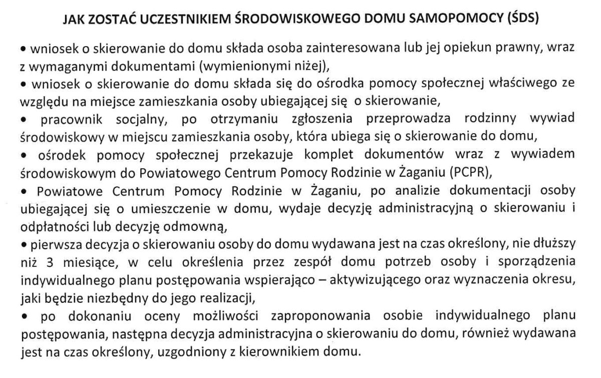 • Decyzję o skierowaniu do Środowiskowego Domu Samopomocy oraz objęcie ofertą usług świadczonych przez placówkę podejmuje Powiatowe Centrum Pomocy Rodzinie z siedzibą w Żaganiu przy ul. Śląskiej 1.