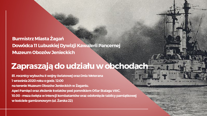 Burmistrz Miasta Żagań, Dowódca 11 Lubuskiej Dywizji Kawalerii Pancernej oraz Muzeum Obozów Jenieckich zapraszają 1 września na uroczystość z okazji 81. rocznicy wybuchu II wojny światowej oraz Dnia Weterana. Obchody rozpocznie msza święta o godzinie 10.00 połączona z odsłonięciem tablicy pamiątkowej w Kościele Garnizonowym przy ulicy Żarskiej. Uroczystości przeniosą się następnie do Muzeum Obozów Jenieckich, gdzie o godzinie 12.00 rozpocznie się Apel Pamięci.