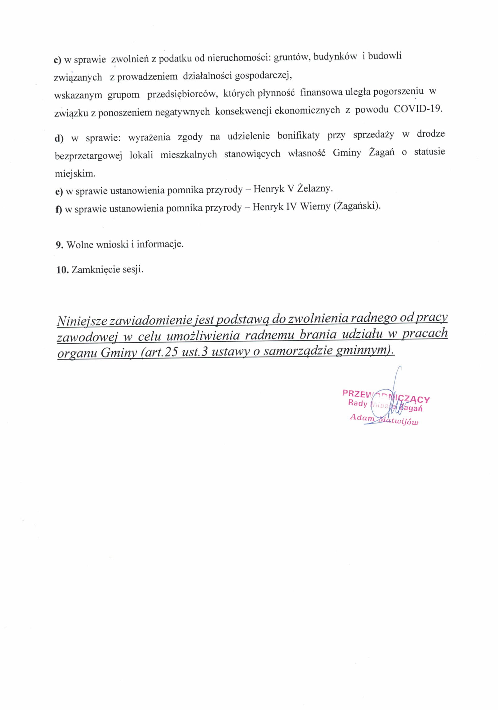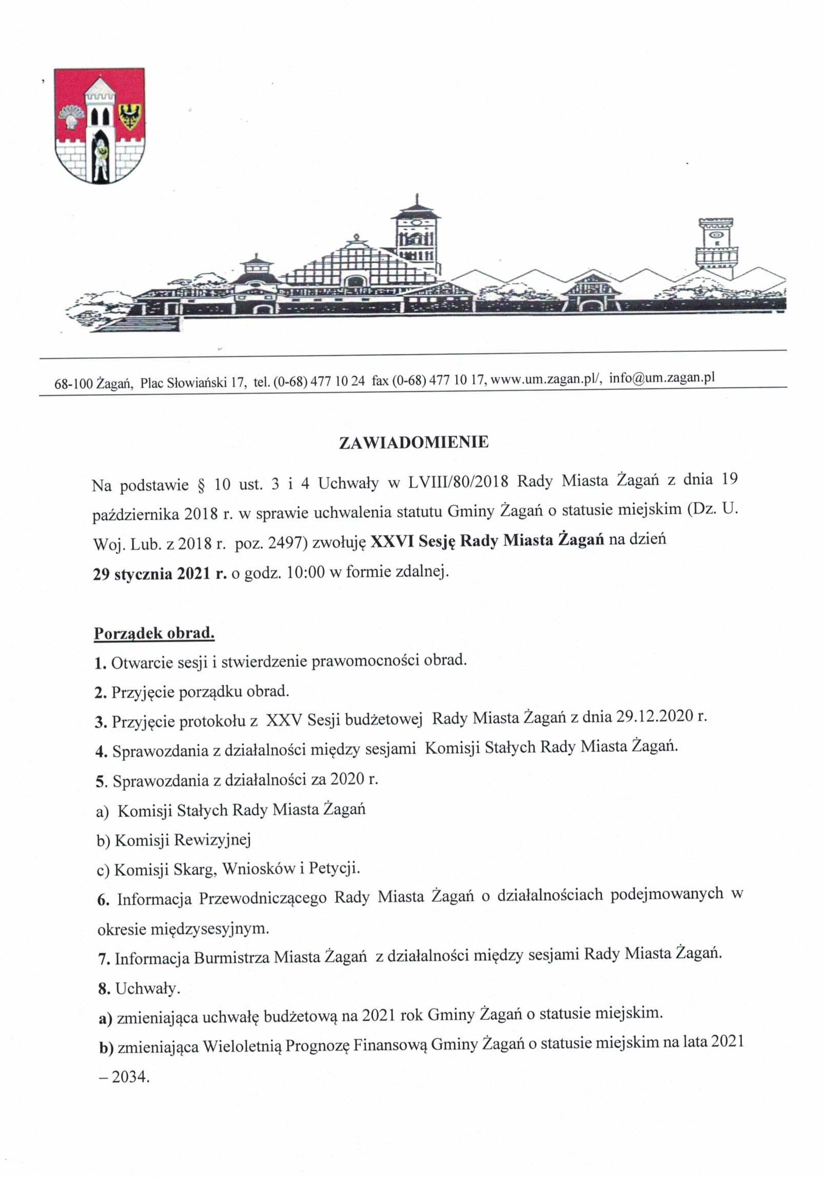 Home WIADOMOŚCI Zawiadomienie o XXVI sesji Rady Miasta Żagań WIADOMOŚCI Zawiadomienie o XXVI sesji Rady Miasta Żagań 2021.01.21 Informujemy, że 29 stycznia 2021 roku o godzinie 10.00 odbędzie się XXVI sesja Rady Miasta Żagań w formie zdalnej. Zobacz równieżMORE FROM AUTHOR Żagańska Karta Mieszkańca Oświadczenie Burmistrza Miasta Żagań w sprawie oświaty Ruszył nabór wniosków do miejskiego programu wymiany kotłów na paliwa stałe