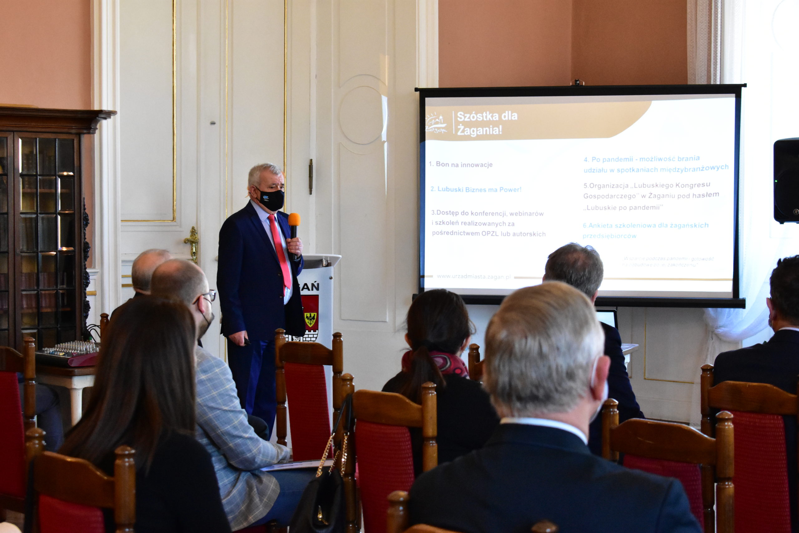 Burmistrz Andrzej Katarzyniec zaprezentował szczegółowe działania zaplanowane w ramach „Szóstki dla Żagania”. Będą to zarówno dofinansowania na rozwój prowadzonej już działalności (nastawione przede wszystkim na innowacyjność), jak również wsparcie dla ludzi młodych, pozbawionych zatrudnienia w wyniku pandemii i gotowych rozpocząć własną działalność. Będą to również szkolenia, których potrzebę zasygnalizują żagańscy przedsiębiorcy. Dodatkowo Żagań stanie się miejscem spotkań przedsiębiorców oraz wspólnych paneli dyskusyjnych. Wymiana doświadczeń stanowi ważny element rozwoju całego lokalnego rynku.
