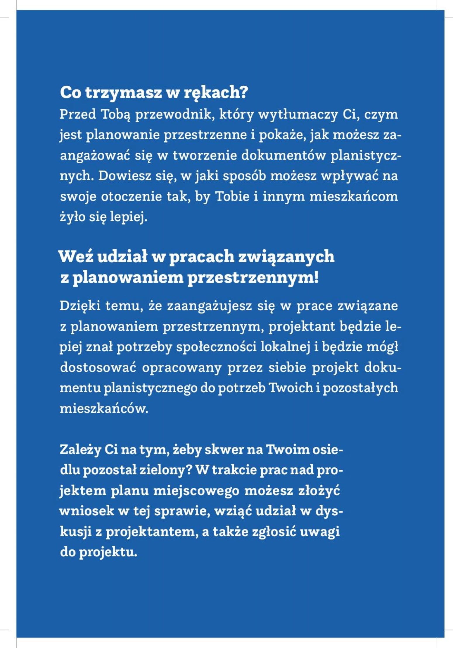 Zanim rozpoczniemy nasze prace nad planem osiedla Bema-Sosnowa zachęcamy do przeczytania “Przewodnika” opracowanego w ramach projektu “Przestrzeń dla partycypacji”, realizowanego obecnie przez Fundację Stocznia, Pracownię Zrównoważonego Rozwoju oraz Związek Miast Polskich.