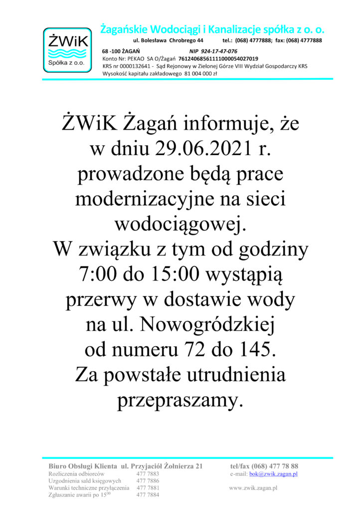 ŻWiK Żagań informuje, że w dniu 29.06.2021 r. prowadzone będą prace modernizacyjne na sieci wodociągowej.