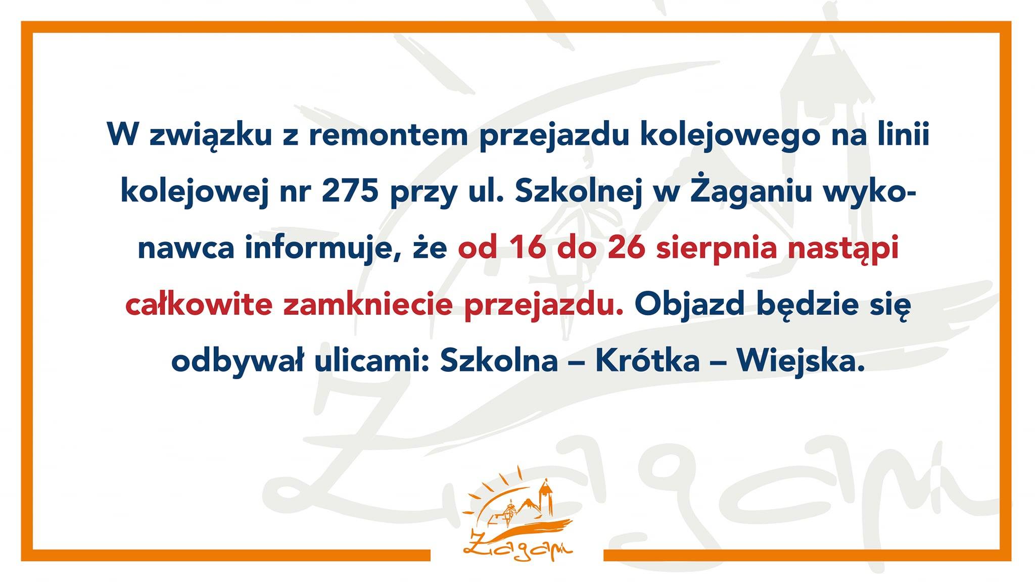 W związku z remontem przejazdu kolejowego na linii kolejowej nr 275 przy ul. Szkolnej w Żaganiu wykonawca informuje, że od 16 do 26 sierpnia, nastąpi całkowite zamkniecie przejazdu. Objazd będzie się odbywał ulicami: Szkolna – Krótka – Wiejska.