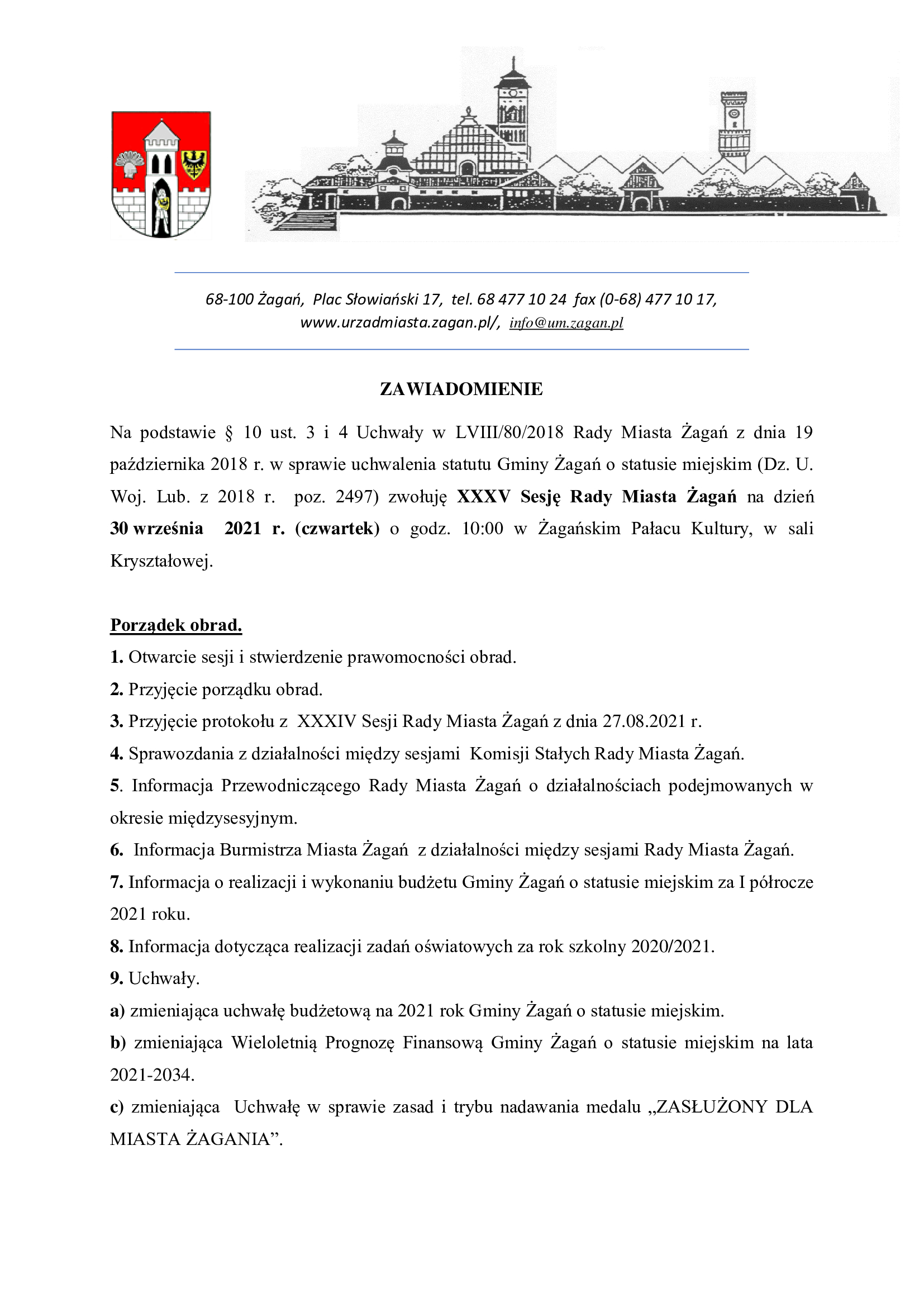 Informujemy, że XXXV sesja Rady Miasta Żagań odbędzie się 30 września 2021 roku w sali Kryształowej Żagańskiego Pałacu Kultury. Oto planowany porządek obrad