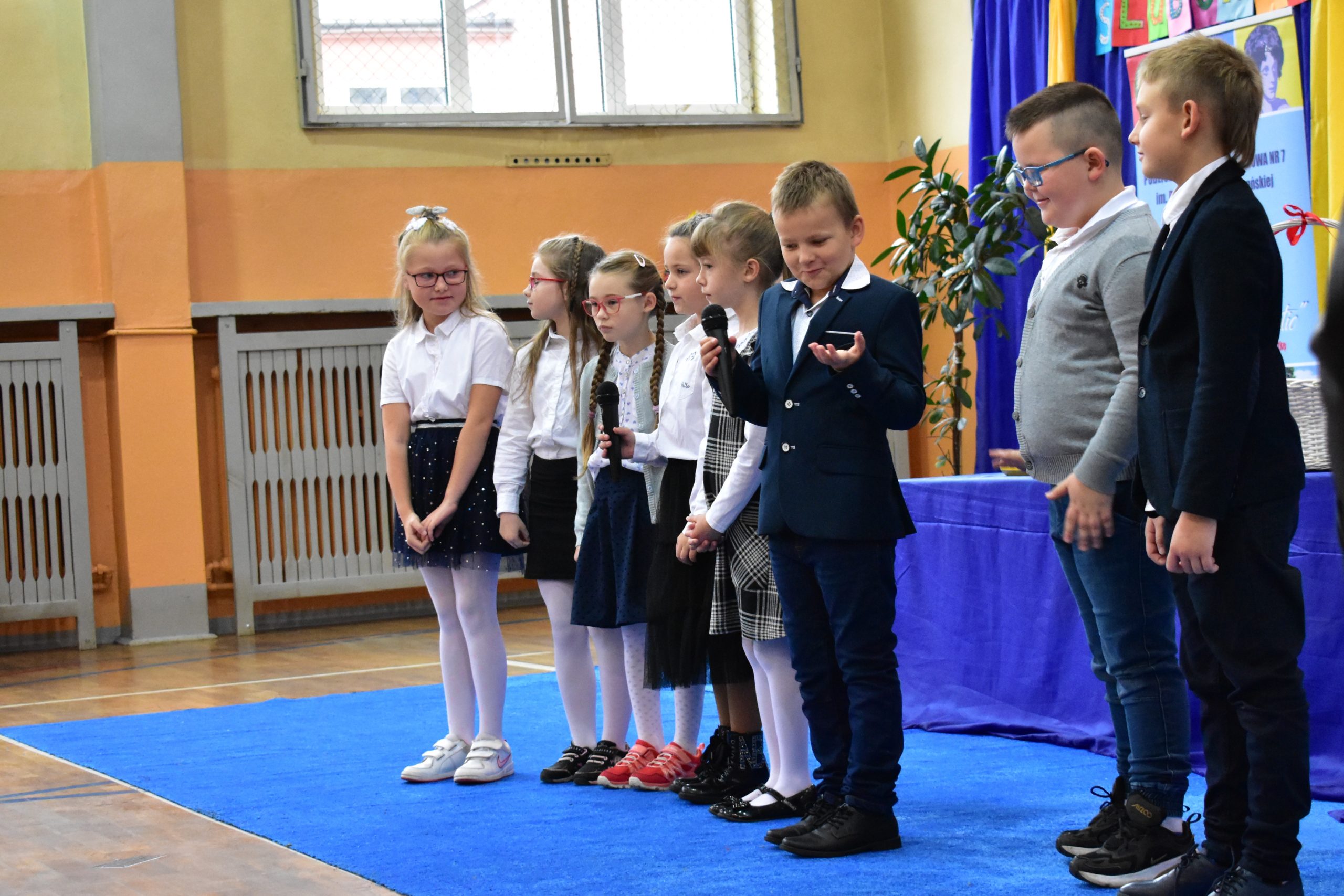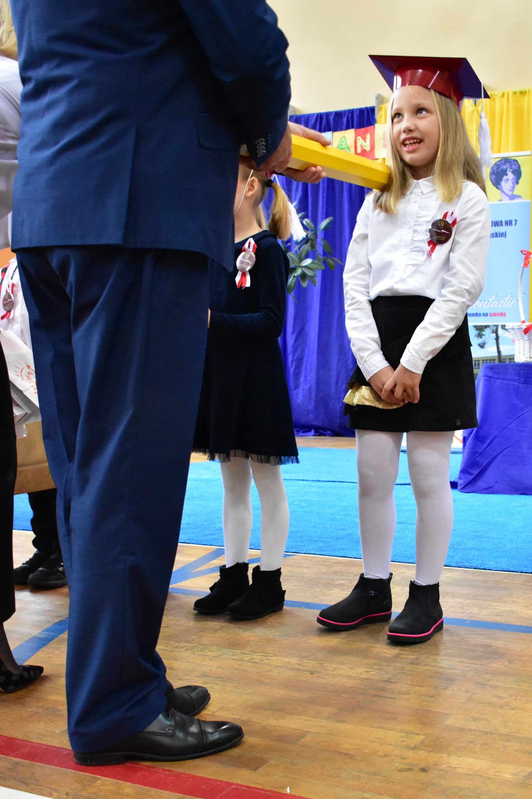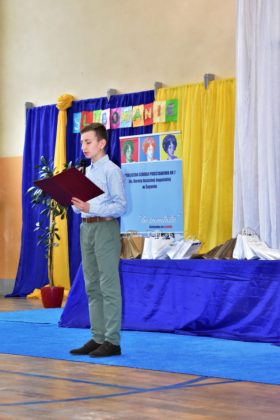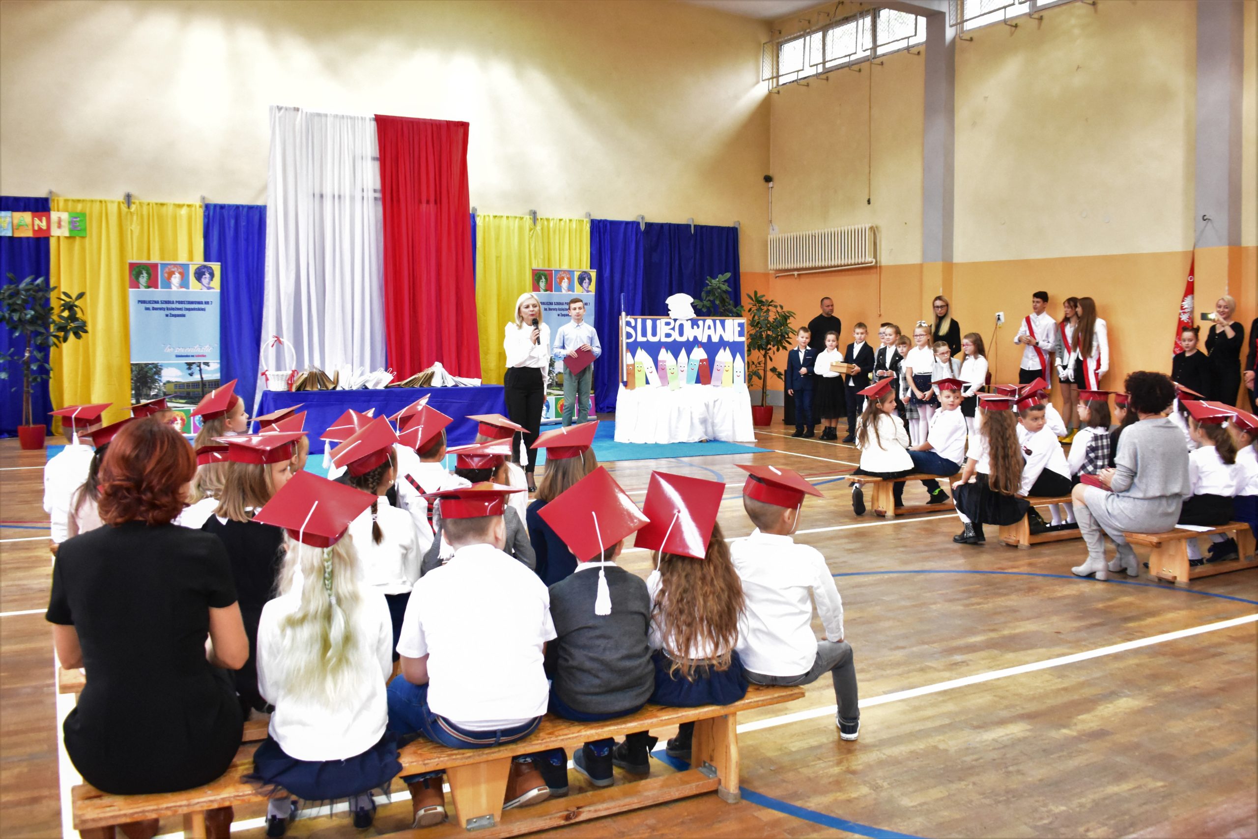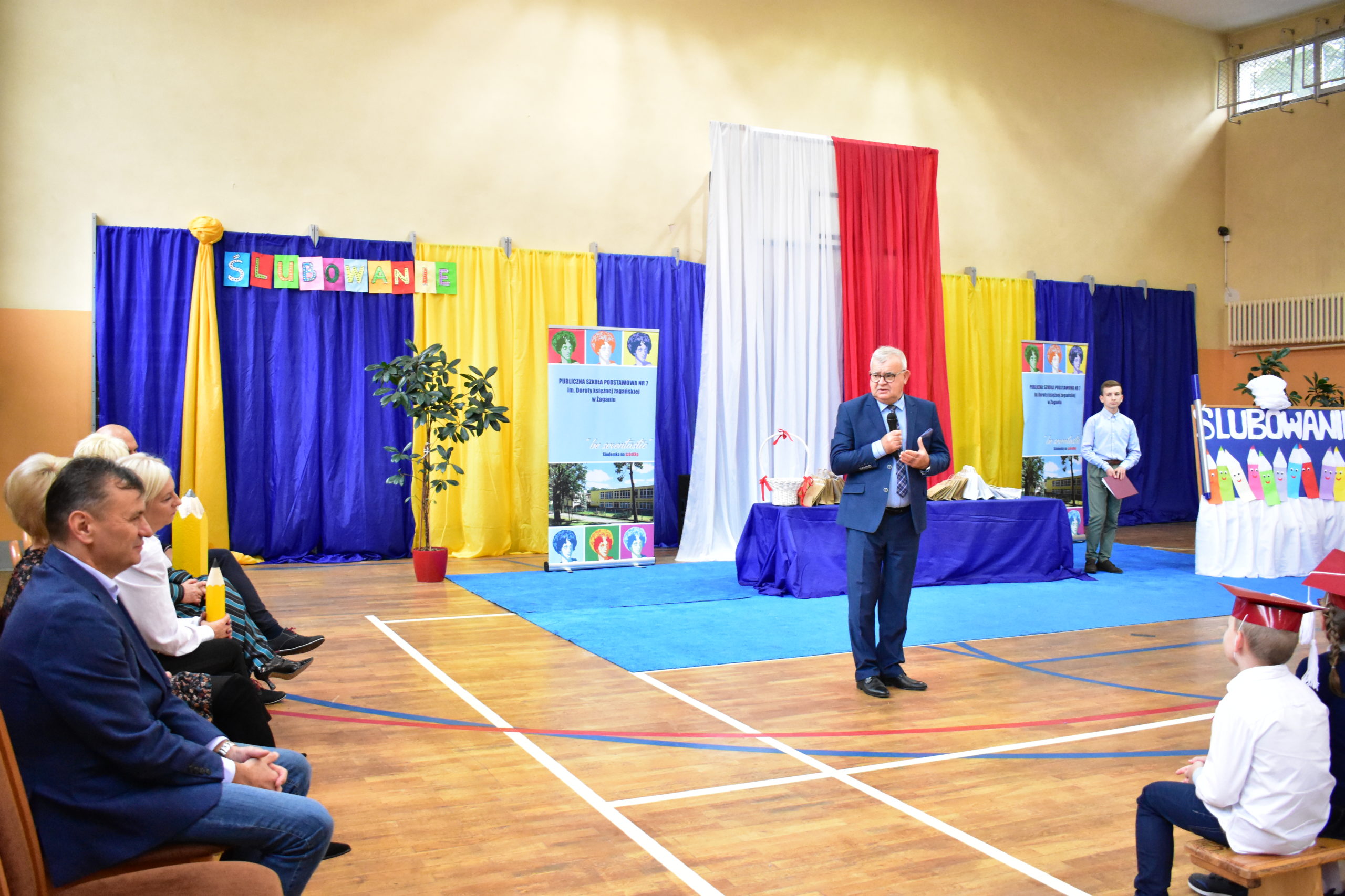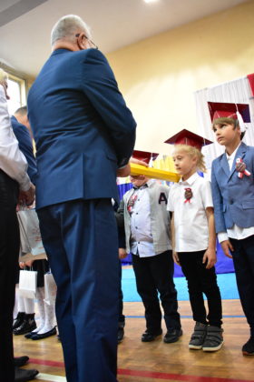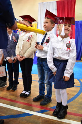 14 października 2021 roku odbyło się również pasowanie na uczniów w Publicznej Szkole Podstawowej nr 7. Zebranych rodziców i gości powitała dyrektor Dorota Stebelska, zapewniając dzieci, że w budynku szkoły czeka na nich mnóstwo przygód i szczerych przyjaźni. Pani dyrektor zapytała również, kto pomaga dzieciom w lekcjach. Wszystkim wskazanym przez pierwszoklasistów osobom podziękowała za wysiłek, który wkładają w edukację dzieci. Burmistrz Andrzej Katarzyniec pogratulował rodzicom pociech i zapytał, czy jest na sali ktoś, komu nie chciało się dzisiaj wstawać? Podniesione ręce widoczne były wszędzie, również wśród rodziców i grona pedagogicznego.