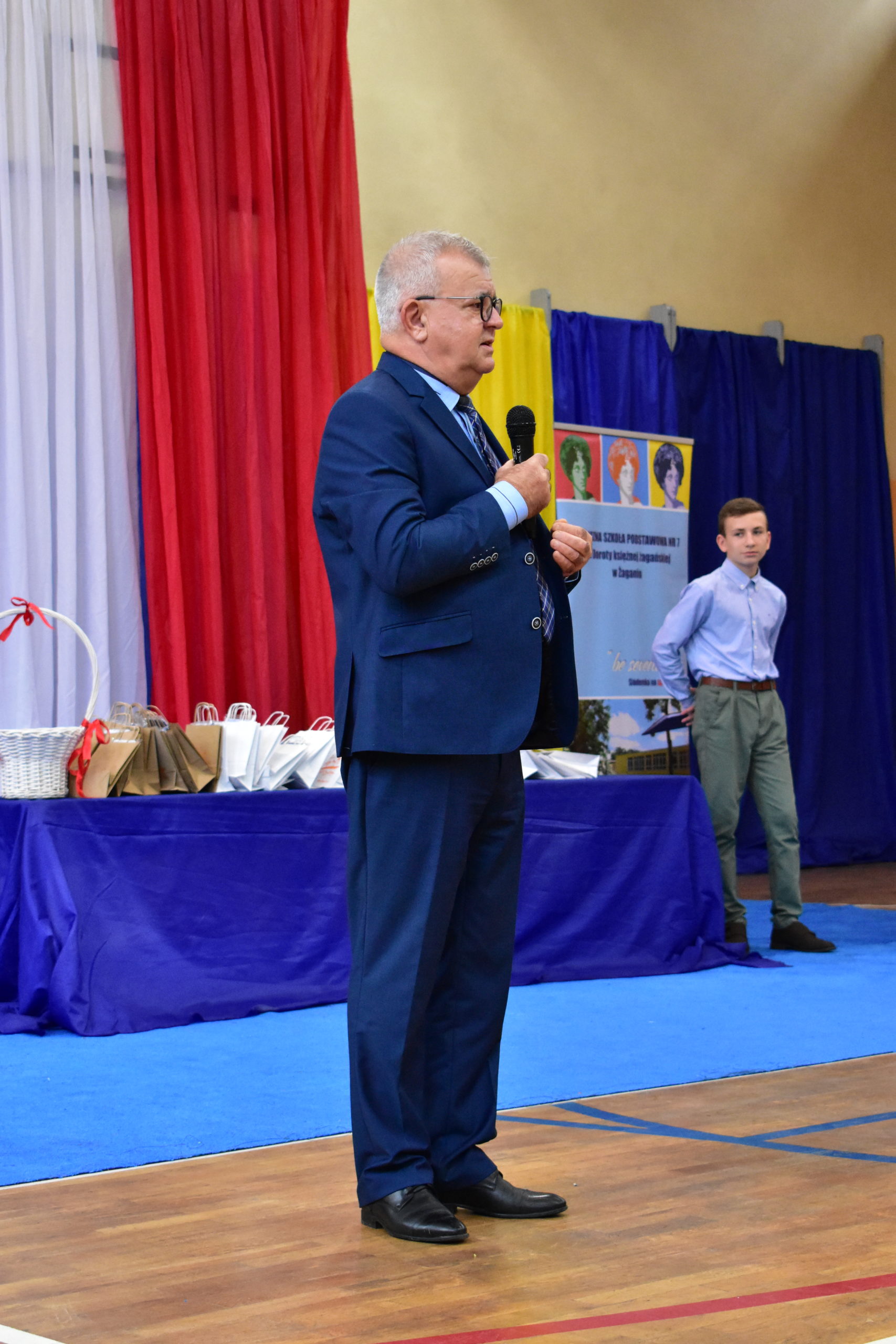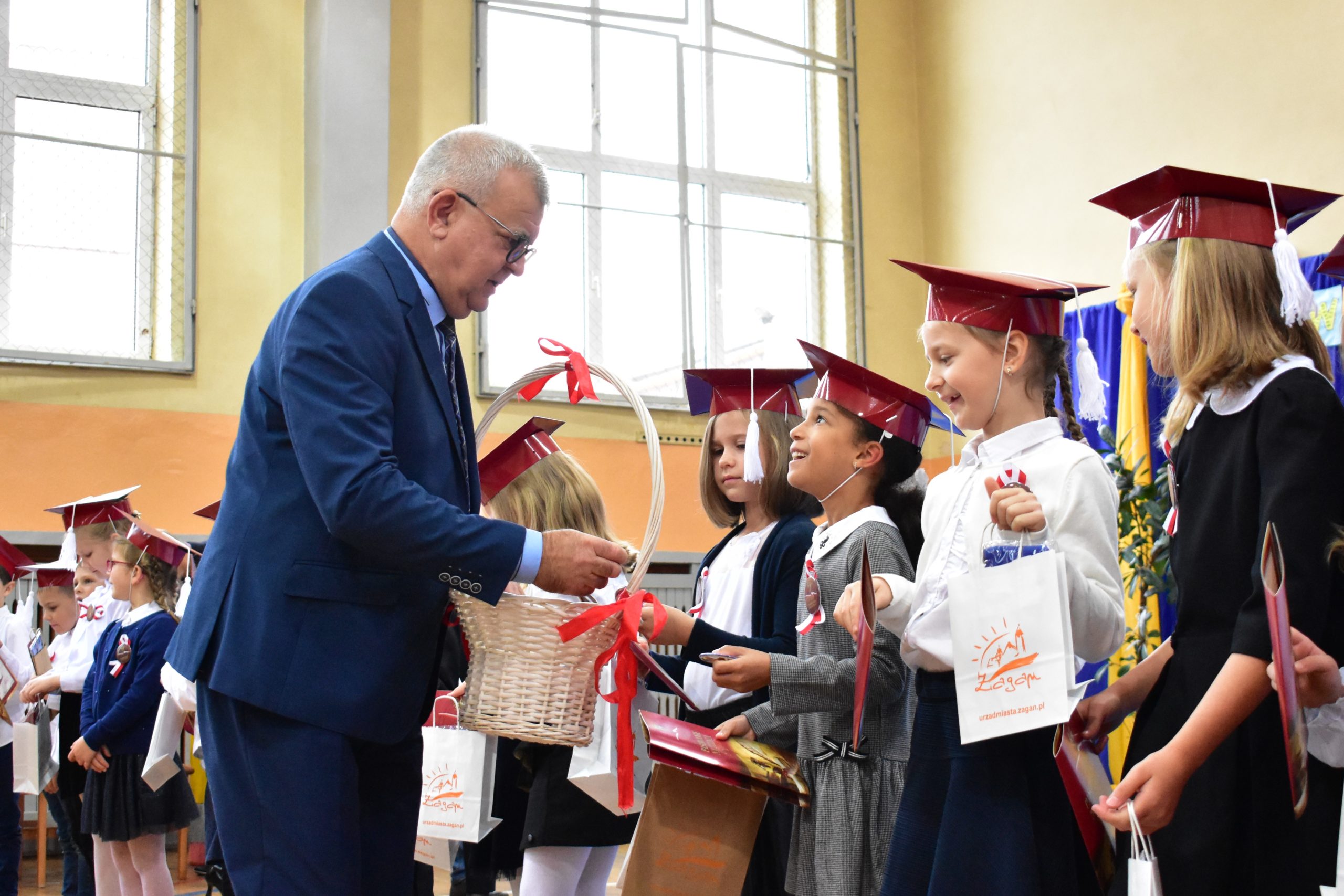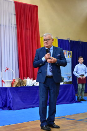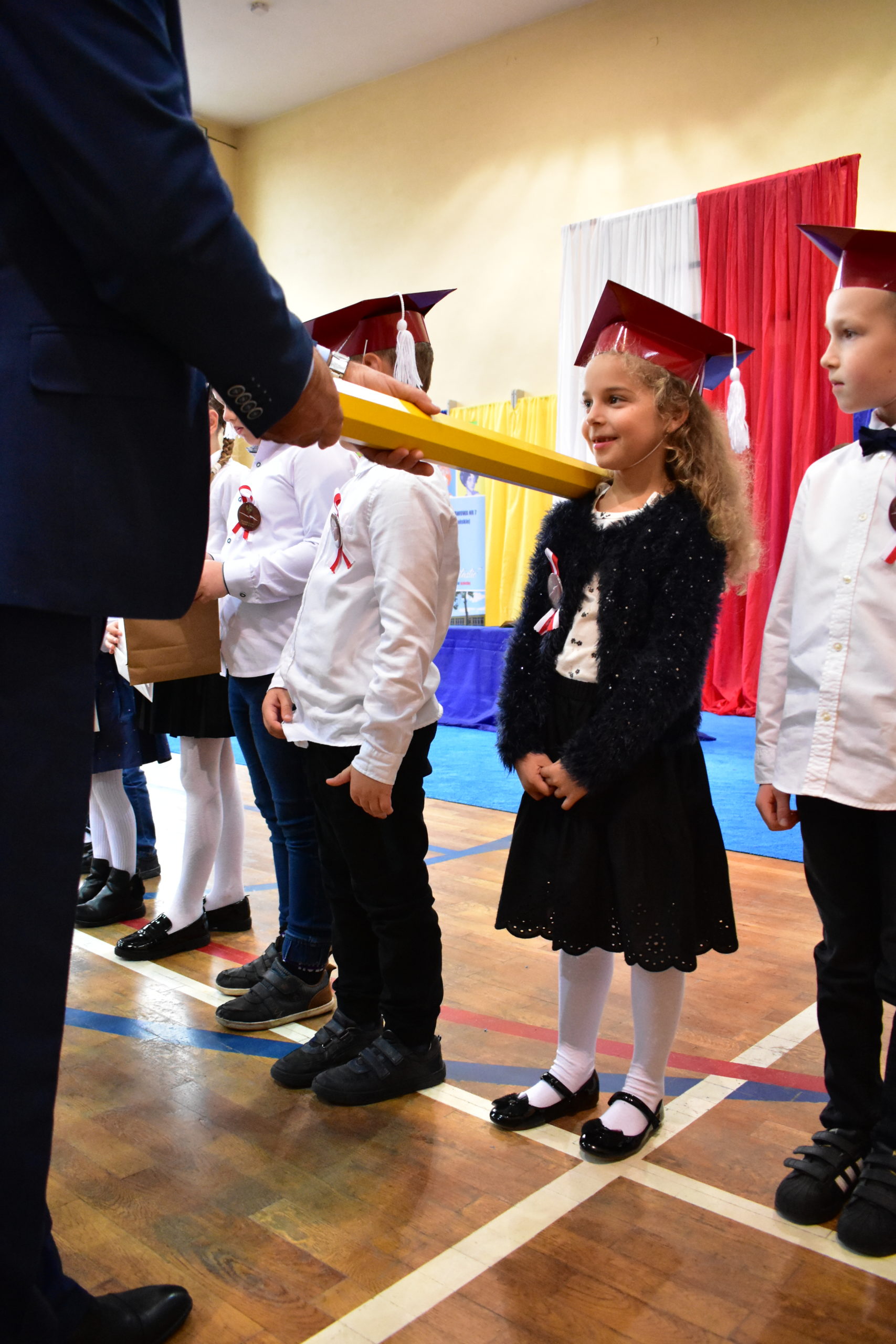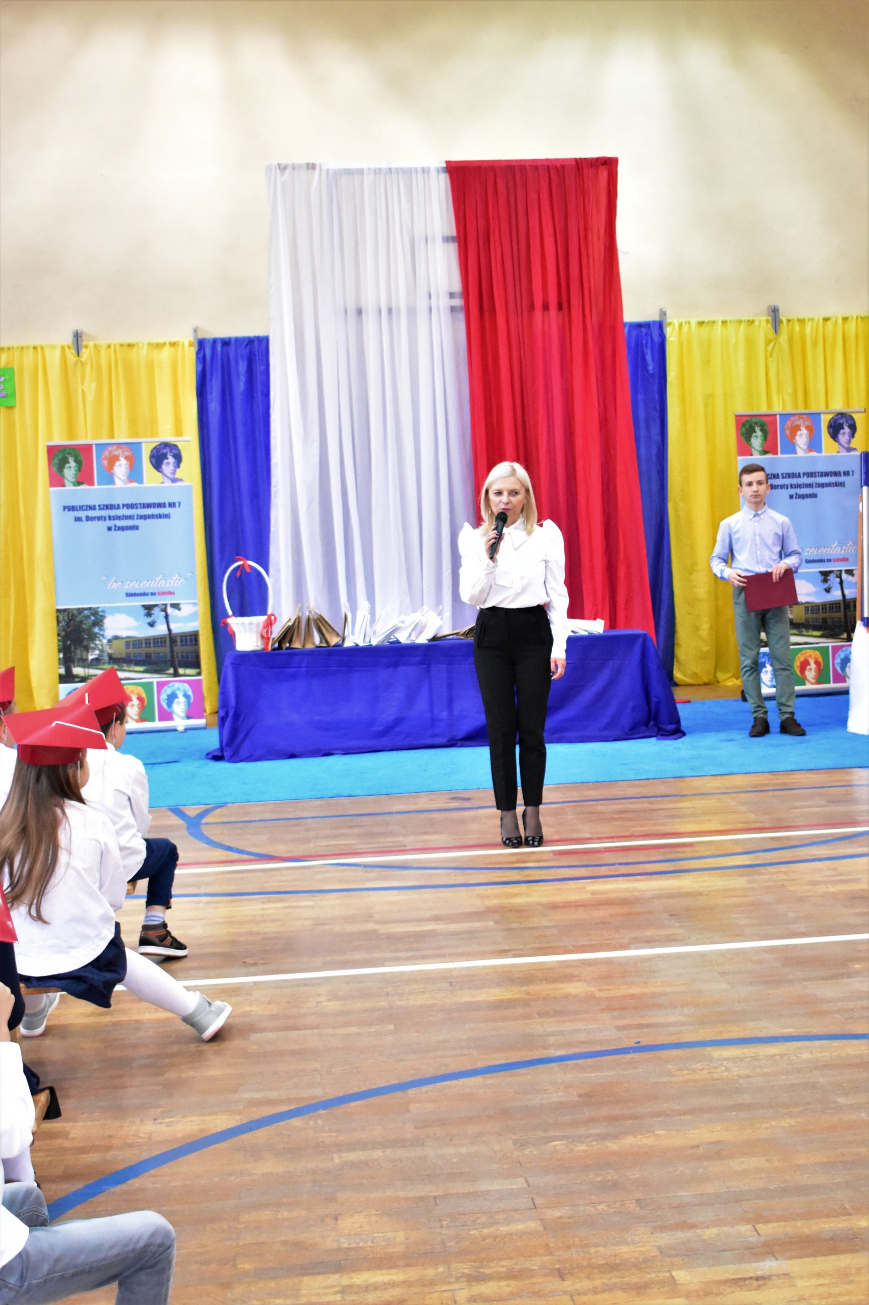 14 października 2021 roku odbyło się również pasowanie na uczniów w Publicznej Szkole Podstawowej nr 7. Zebranych rodziców i gości powitała dyrektor Dorota Stebelska, zapewniając dzieci, że w budynku szkoły czeka na nich mnóstwo przygód i szczerych przyjaźni. Pani dyrektor zapytała również, kto pomaga dzieciom w lekcjach. Wszystkim wskazanym przez pierwszoklasistów osobom podziękowała za wysiłek, który wkładają w edukację dzieci. Burmistrz Andrzej Katarzyniec pogratulował rodzicom pociech i zapytał, czy jest na sali ktoś, komu nie chciało się dzisiaj wstawać? Podniesione ręce widoczne były wszędzie, również wśród rodziców i grona pedagogicznego.
