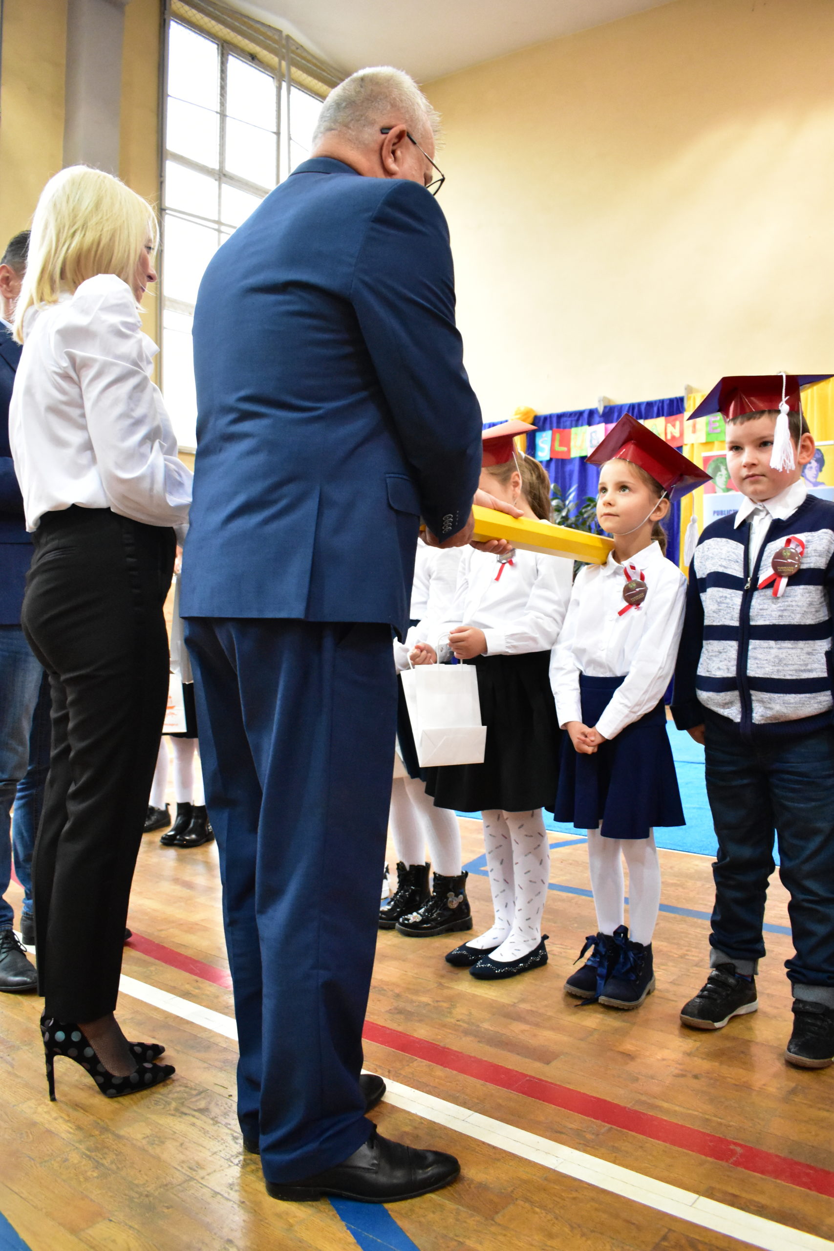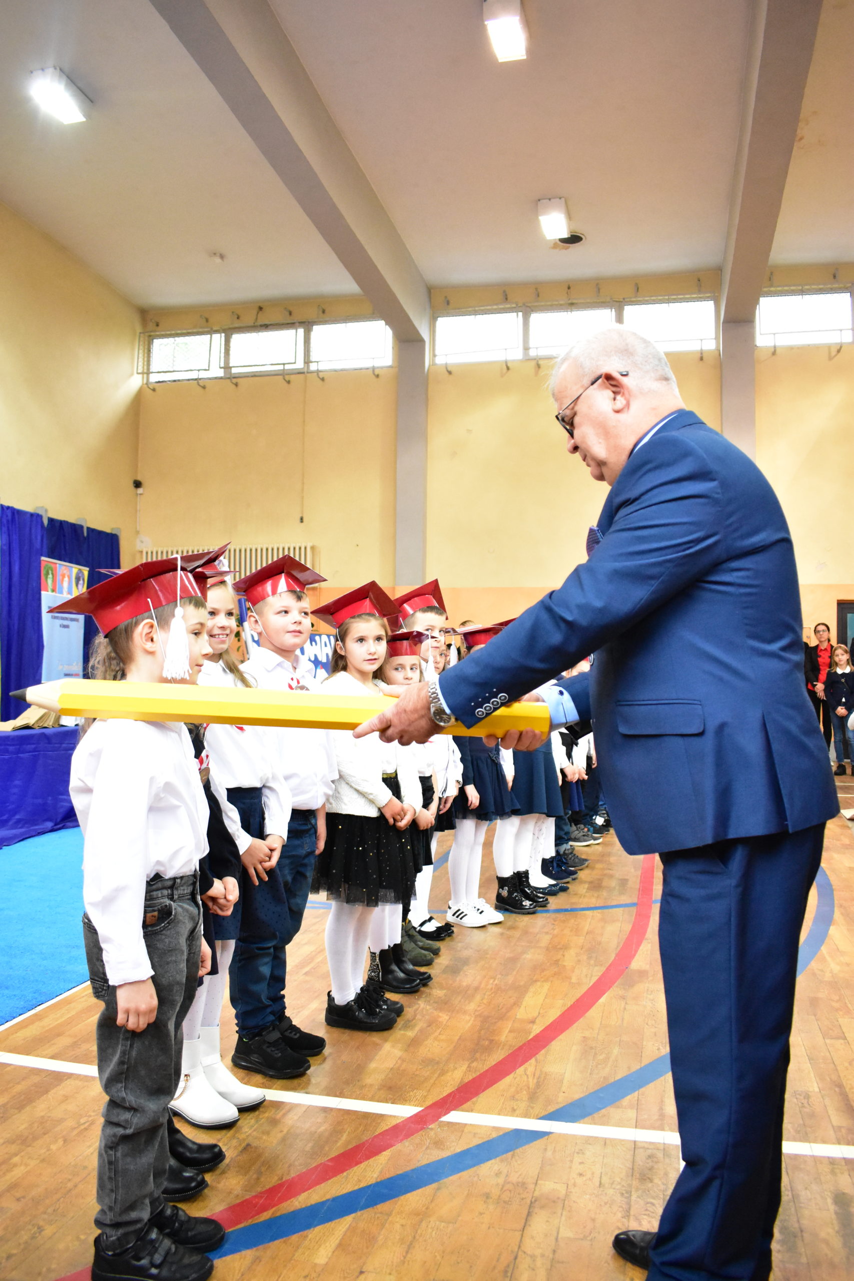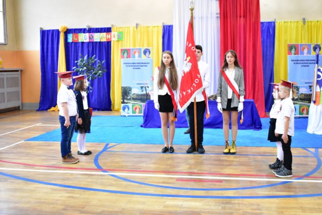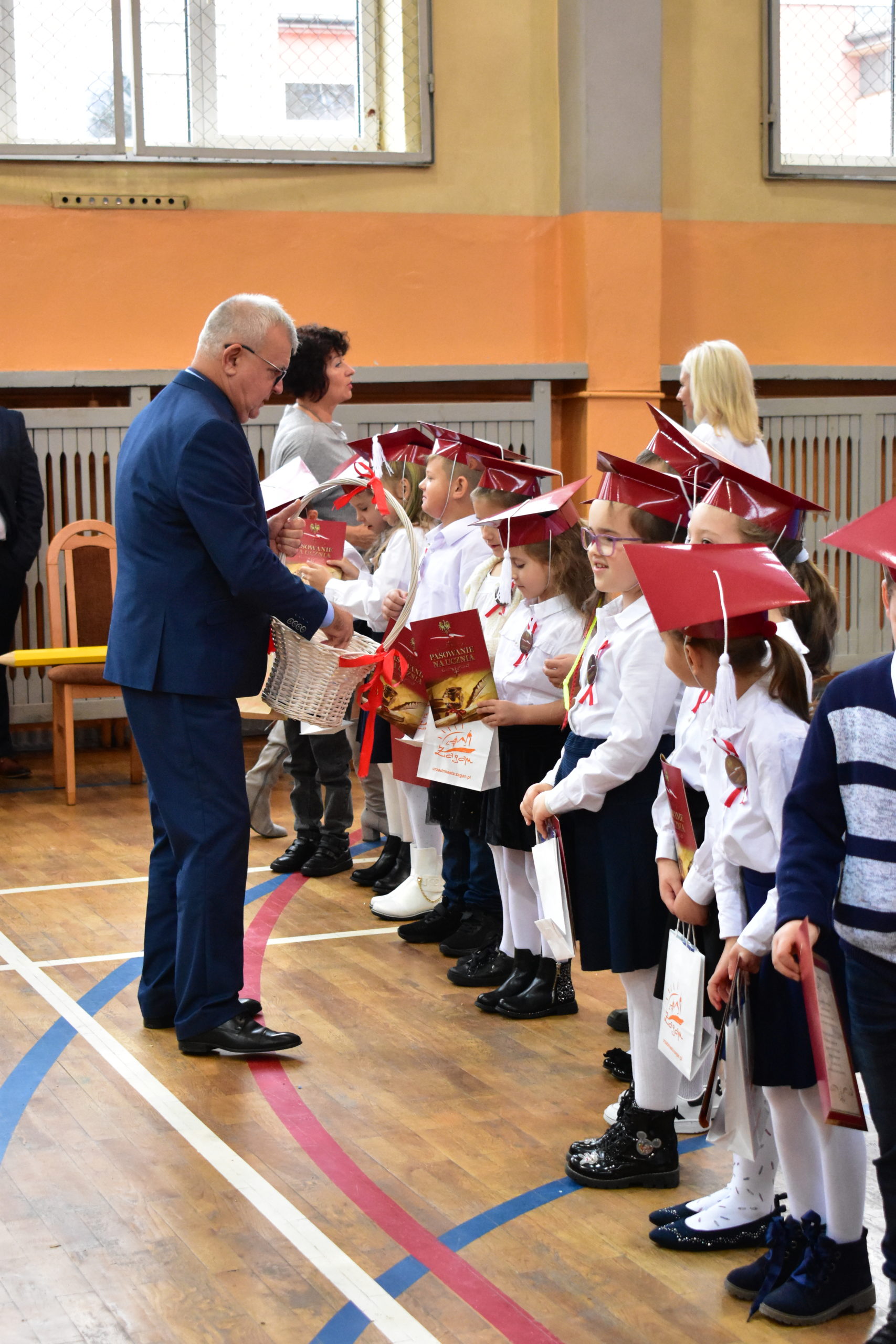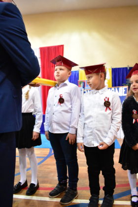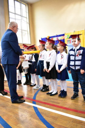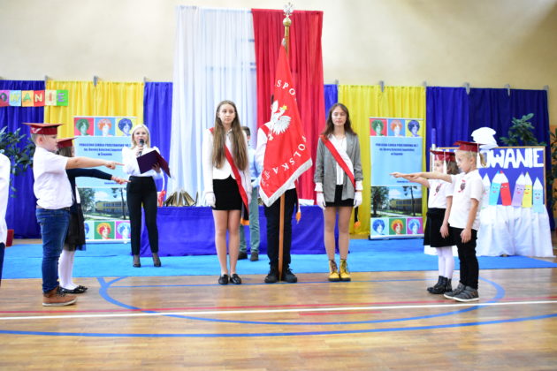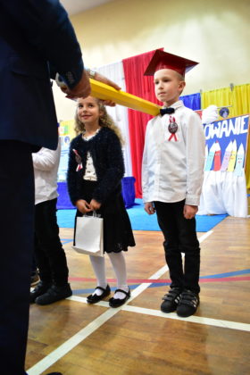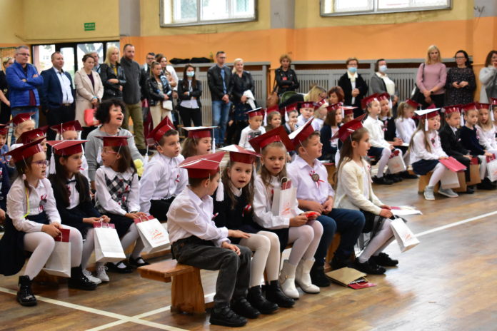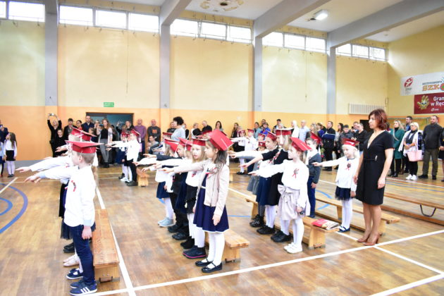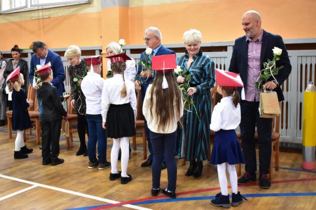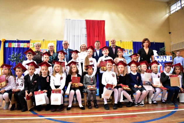 Uroczystość poprzedził krótki występ artystyczny. Przyszli uczniowie rozwiązywali zagadki, aby odzyskać ołówek potrzebny do pasowania. Dzieci podały prawidłowe rozwiązania, wprowadzono poczet sztandarowy, dzieci złożyły ślubowanie. Każdego pierwszoklasistę pasował na ucznia burmistrz Andrzej Katarzyniec. Dyrektor szkoły Dorota Stebelskaoraz naczelnik oświaty Mariusz Krugły wręczyli dzieciom drobne upominki. Każdy nowy uczeń otrzymał również tarczę szkolną.