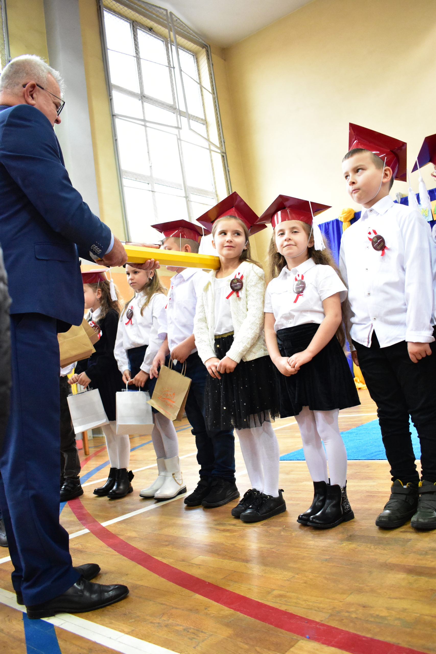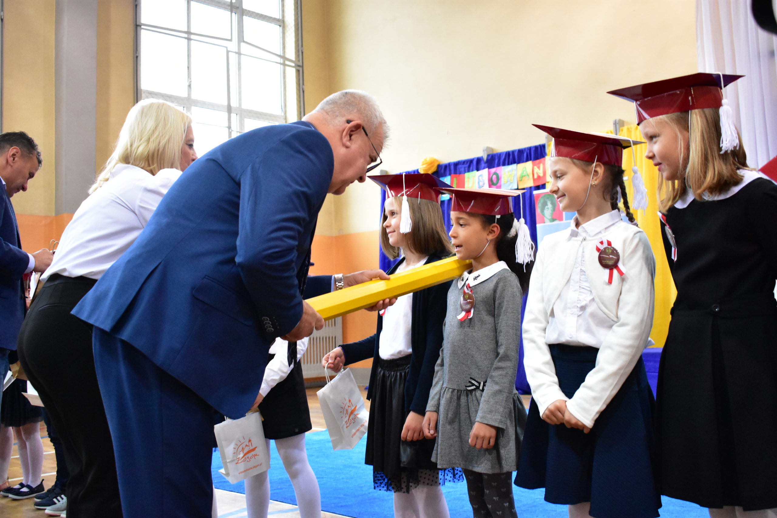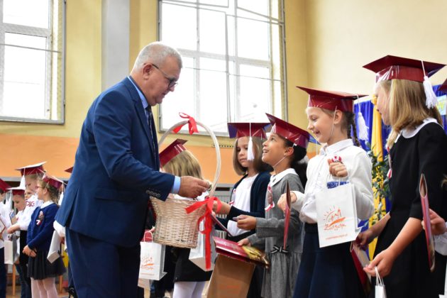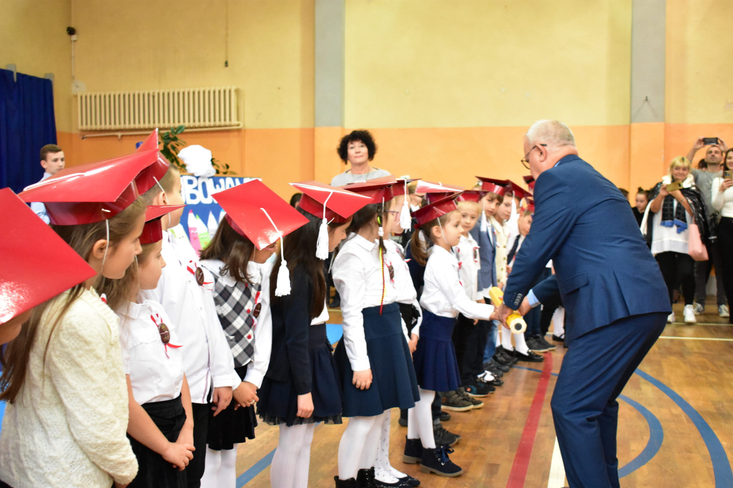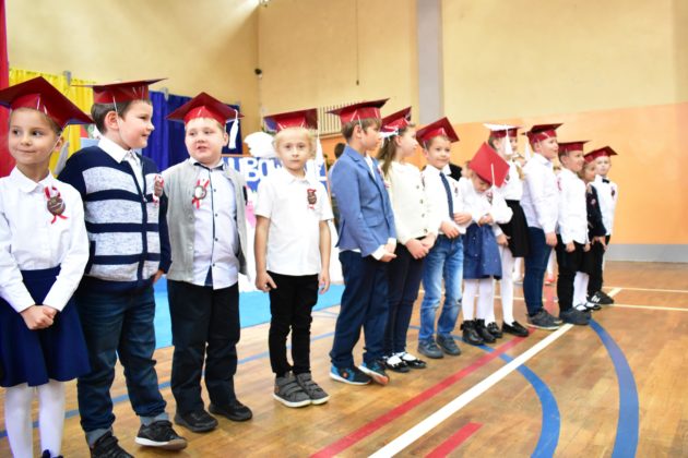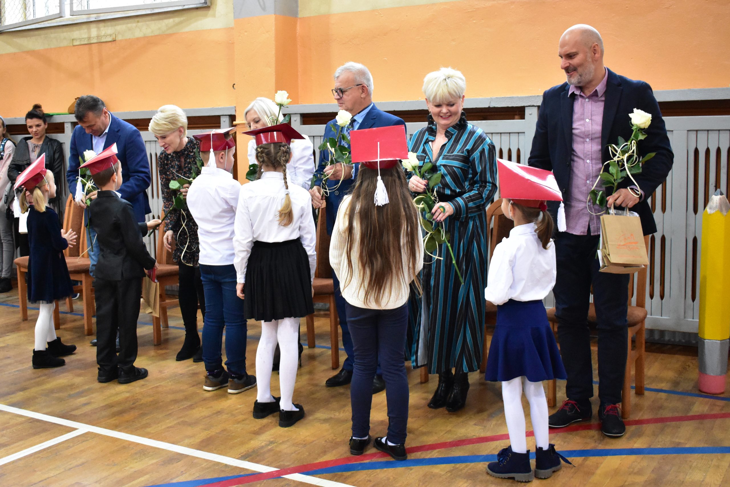 Uroczystość poprzedził krótki występ artystyczny. Przyszli uczniowie rozwiązywali zagadki, aby odzyskać ołówek potrzebny do pasowania. Dzieci podały prawidłowe rozwiązania, wprowadzono poczet sztandarowy, dzieci złożyły ślubowanie. Każdego pierwszoklasistę pasował na ucznia burmistrz Andrzej Katarzyniec. Dyrektor szkoły Dorota Stebelskaoraz naczelnik oświaty Mariusz Krugły wręczyli dzieciom drobne upominki. Każdy nowy uczeń otrzymał również tarczę szkolną.