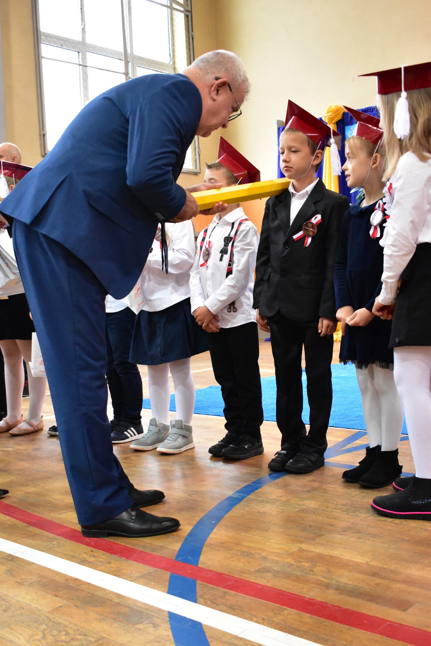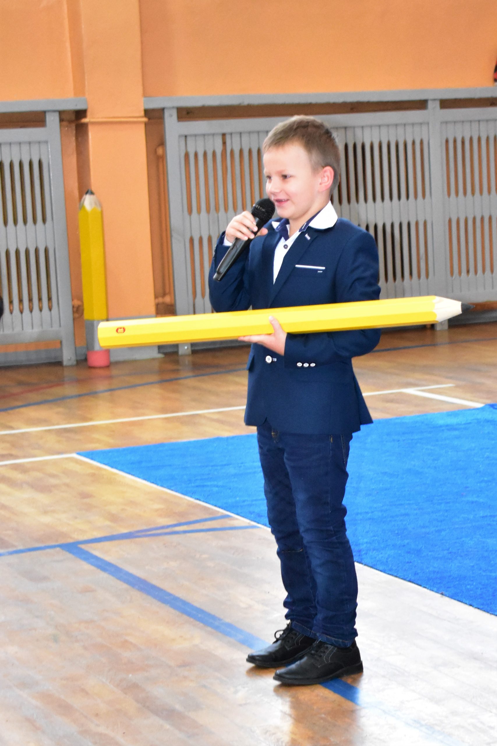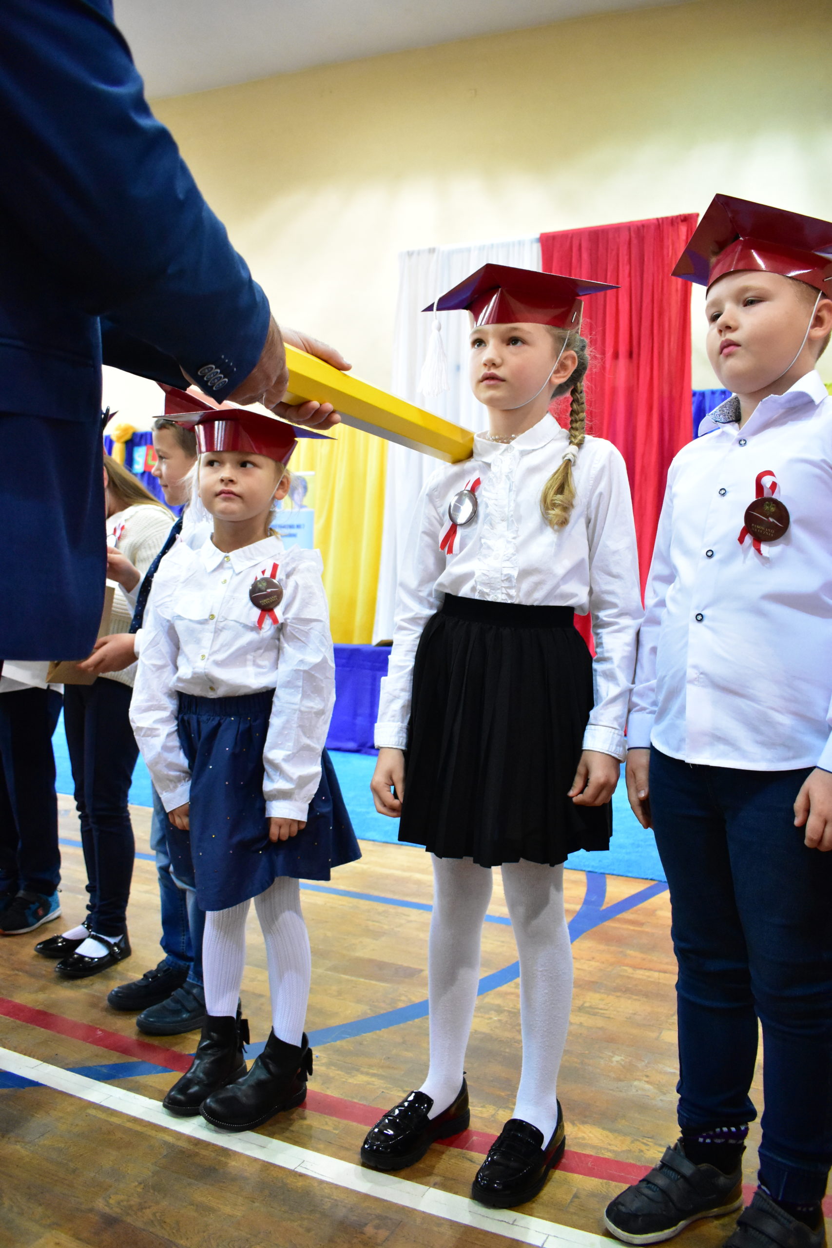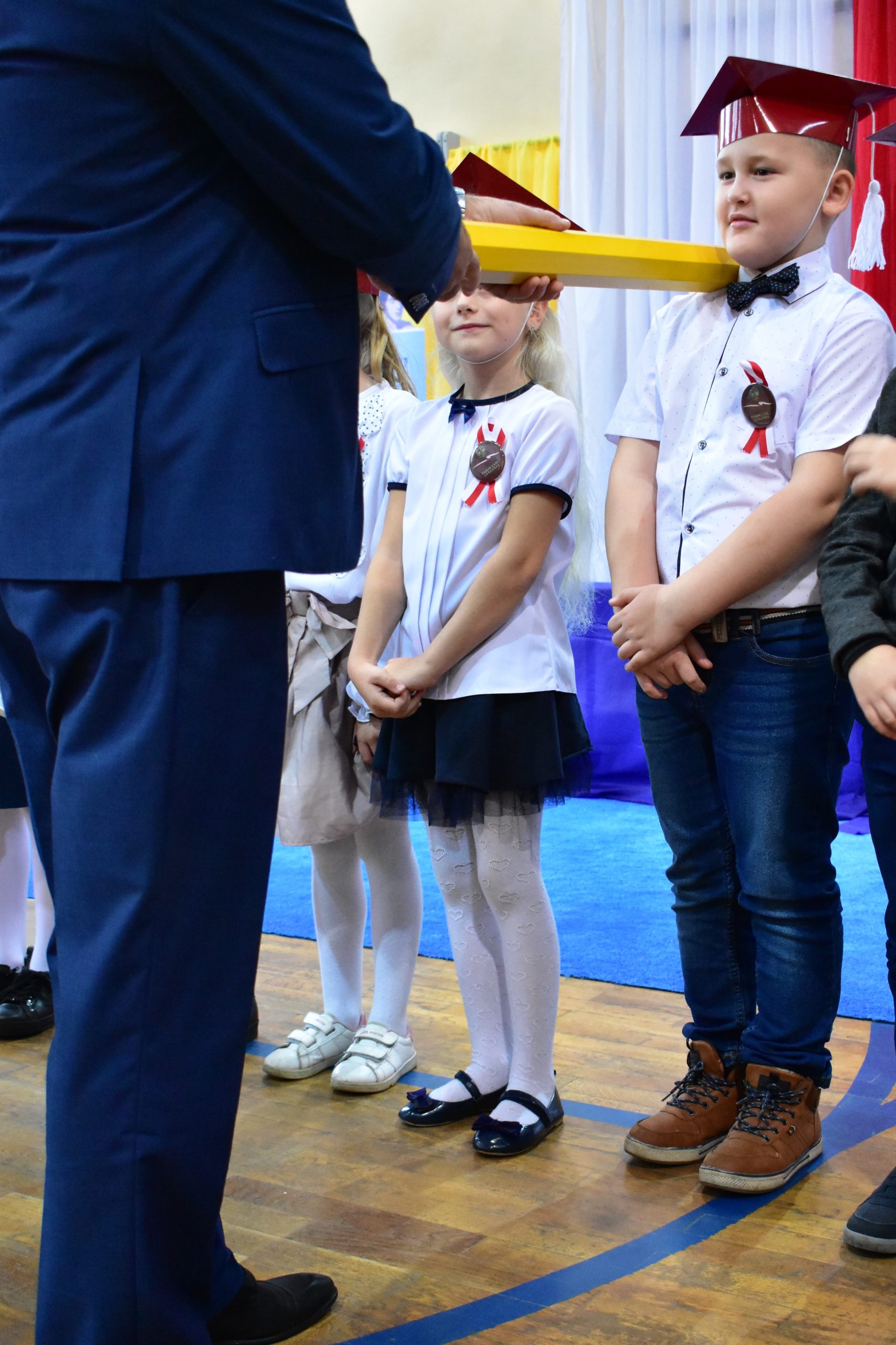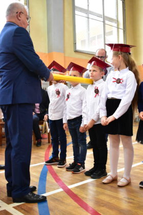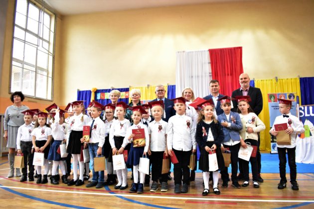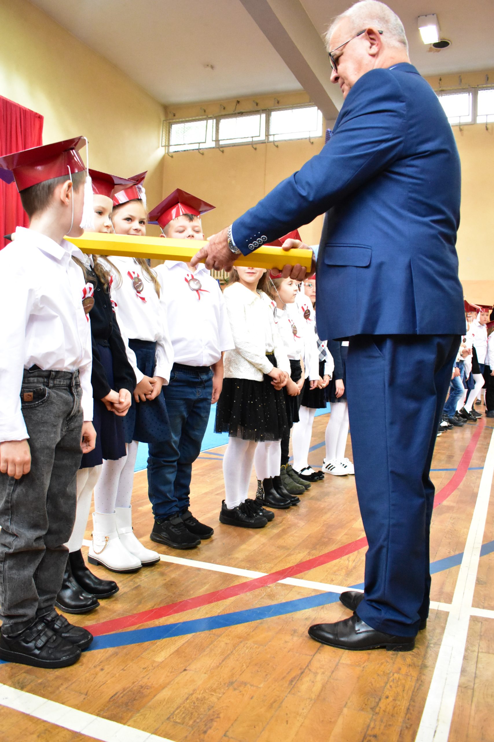 Uroczystość poprzedził krótki występ artystyczny. Przyszli uczniowie rozwiązywali zagadki, aby odzyskać ołówek potrzebny do pasowania. Dzieci podały prawidłowe rozwiązania, wprowadzono poczet sztandarowy, dzieci złożyły ślubowanie. Każdego pierwszoklasistę pasował na ucznia burmistrz Andrzej Katarzyniec. Dyrektor szkoły Dorota Stebelskaoraz naczelnik oświaty Mariusz Krugły wręczyli dzieciom drobne upominki. Każdy nowy uczeń otrzymał również tarczę szkolną.