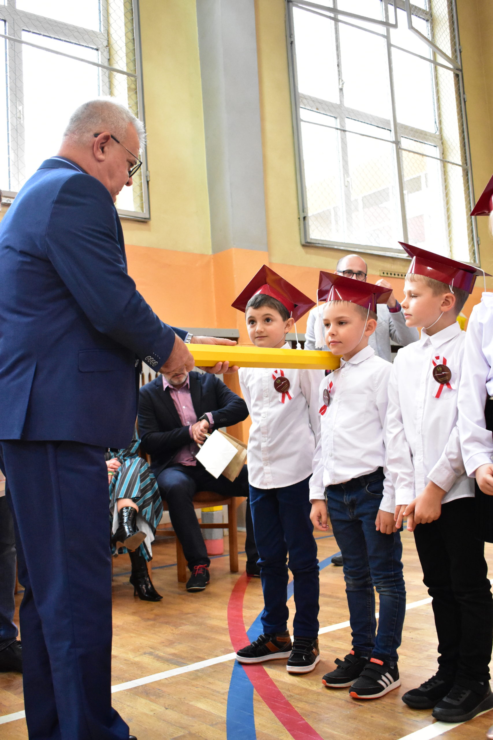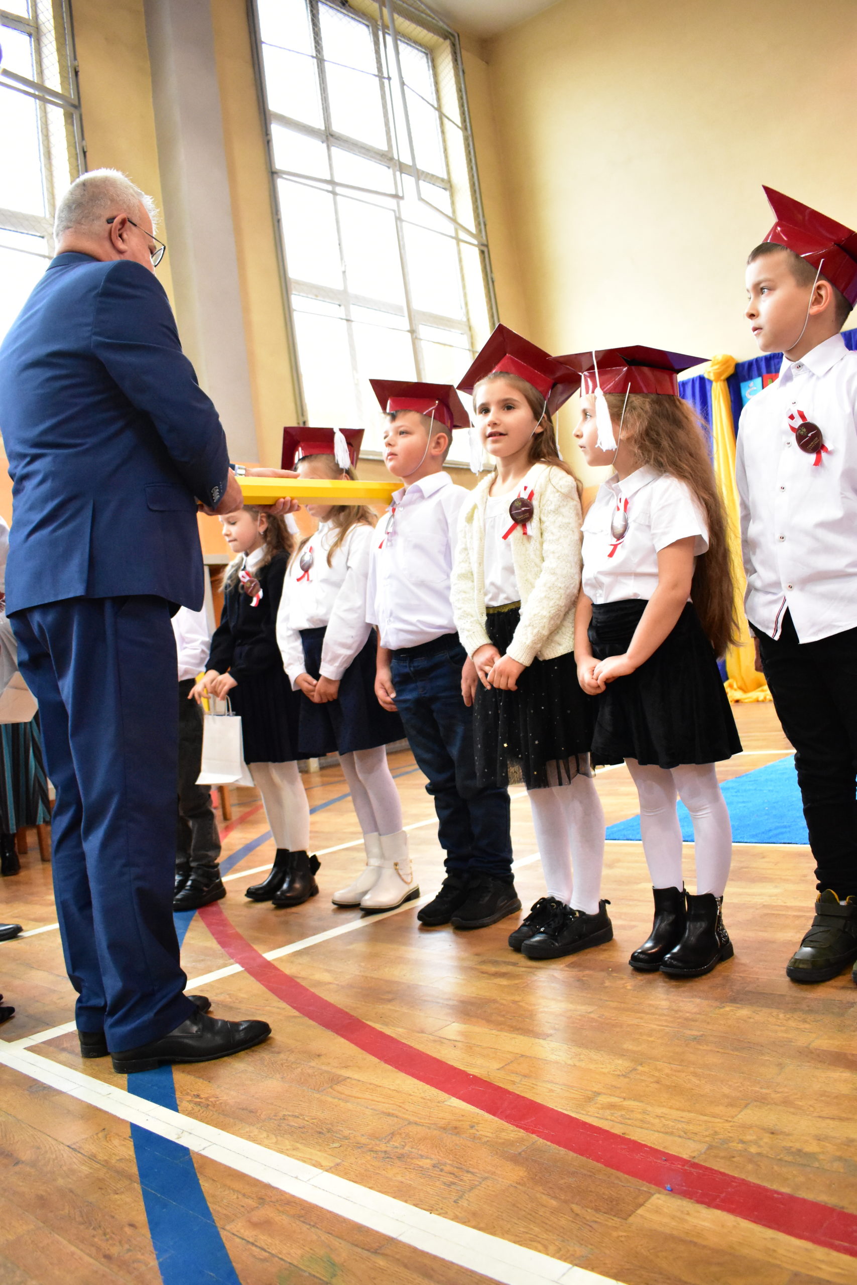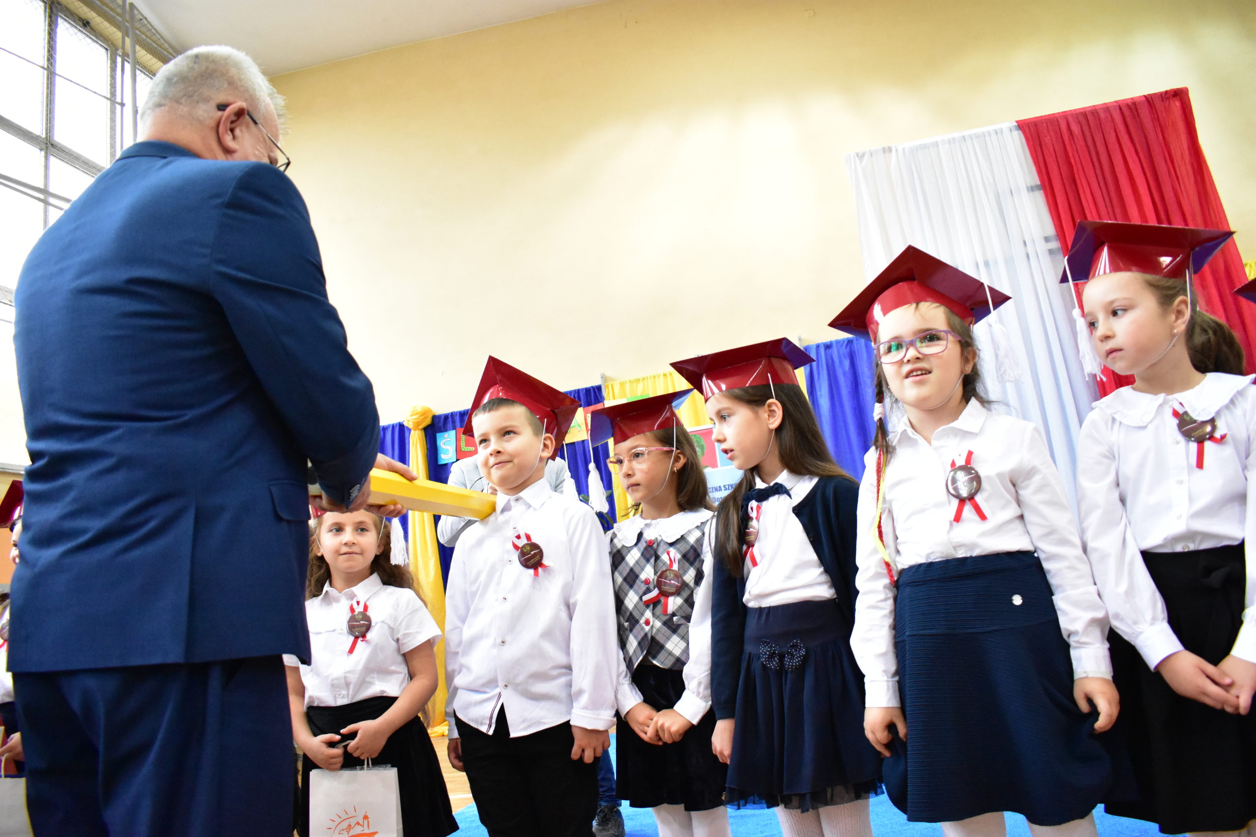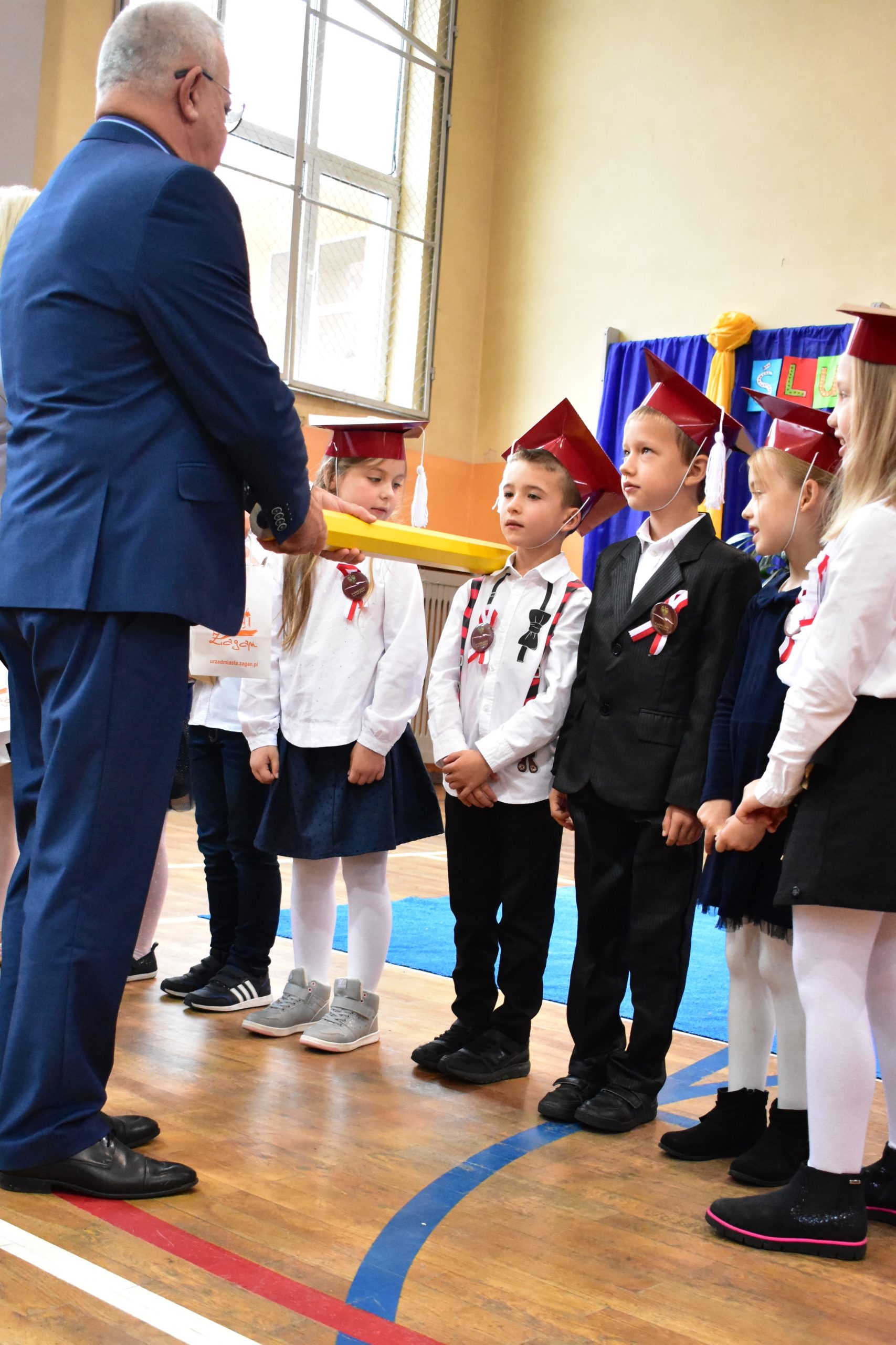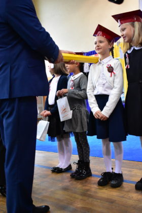Uroczystość poprzedził krótki występ artystyczny. Przyszli uczniowie rozwiązywali zagadki, aby odzyskać ołówek potrzebny do pasowania. Dzieci podały prawidłowe rozwiązania, wprowadzono poczet sztandarowy, dzieci złożyły ślubowanie. Każdego pierwszoklasistę pasował na ucznia burmistrz Andrzej Katarzyniec. Dyrektor szkoły Dorota Stebelskaoraz naczelnik oświaty Mariusz Krugły wręczyli dzieciom drobne upominki. Każdy nowy uczeń otrzymał również tarczę szkolną.