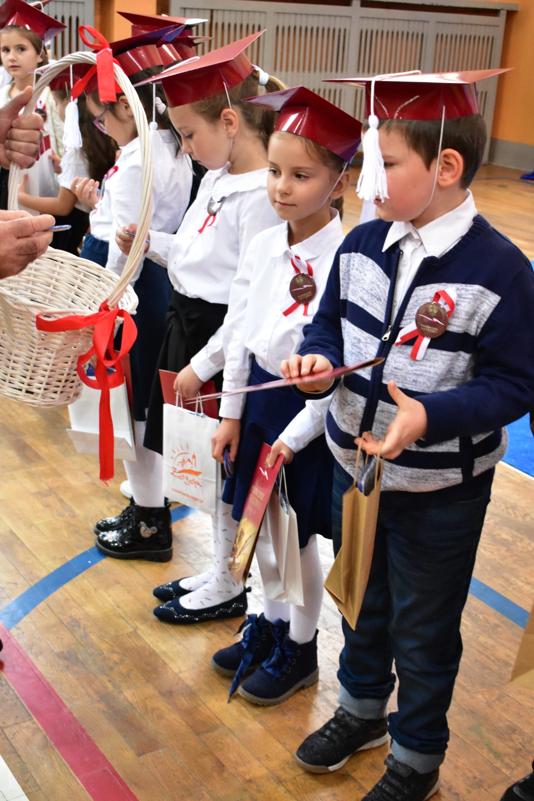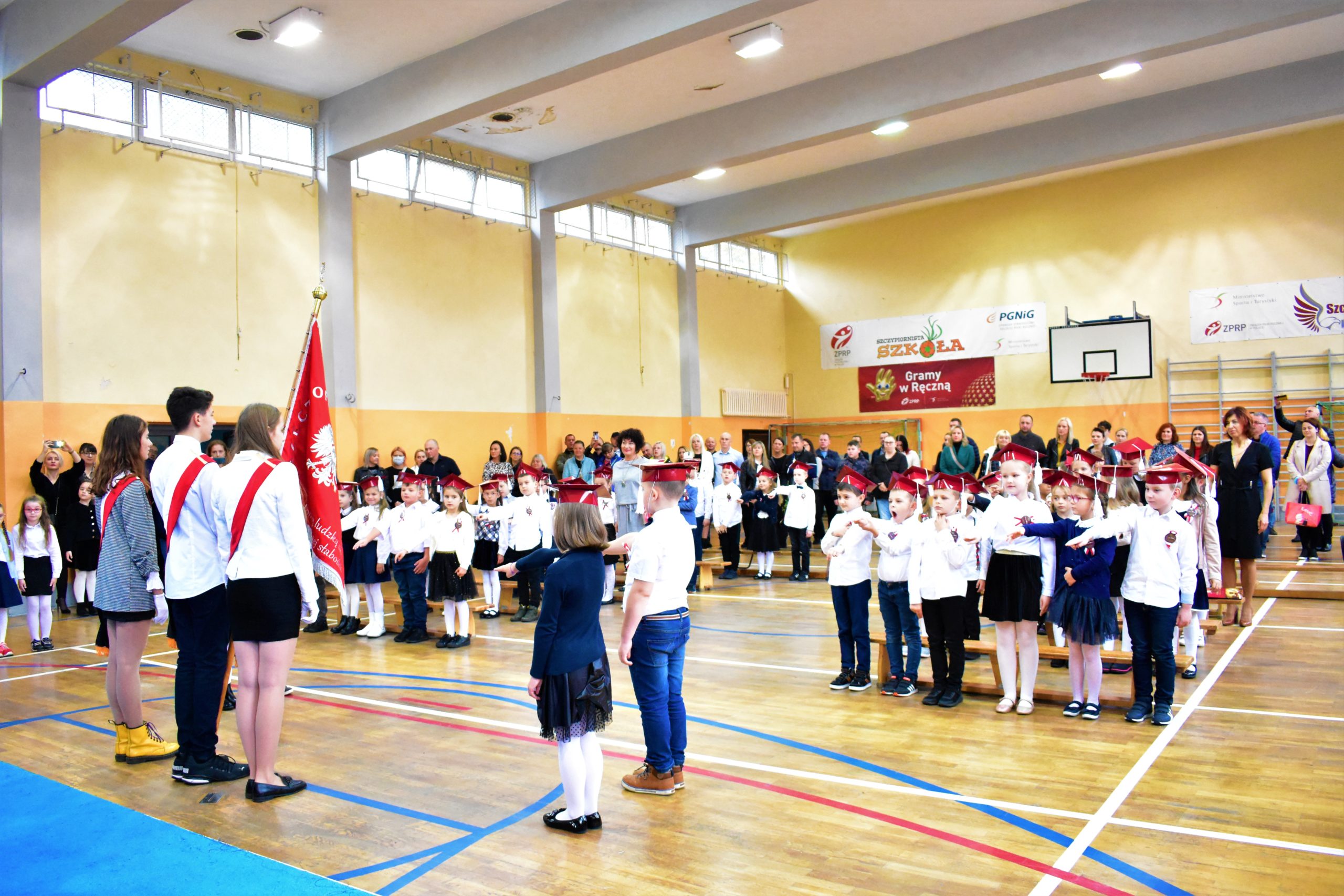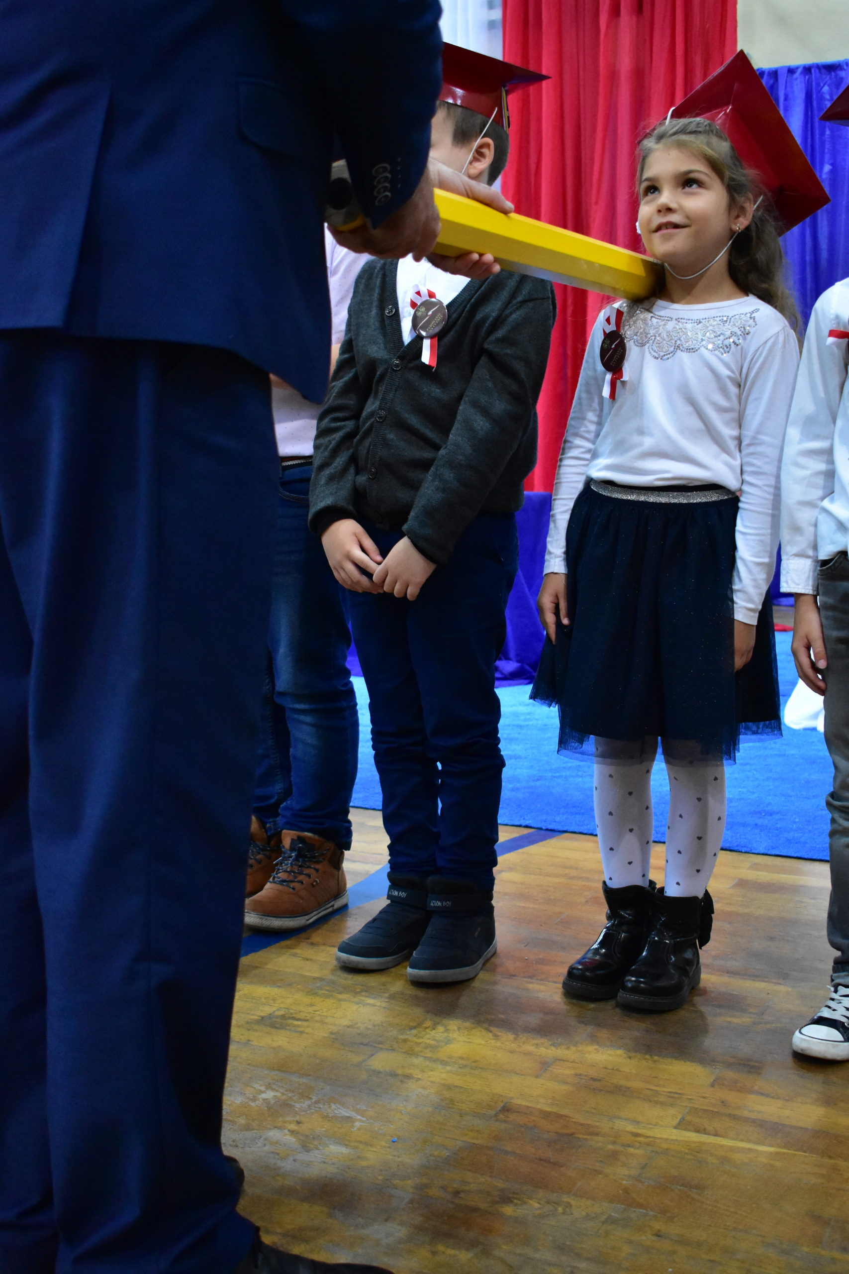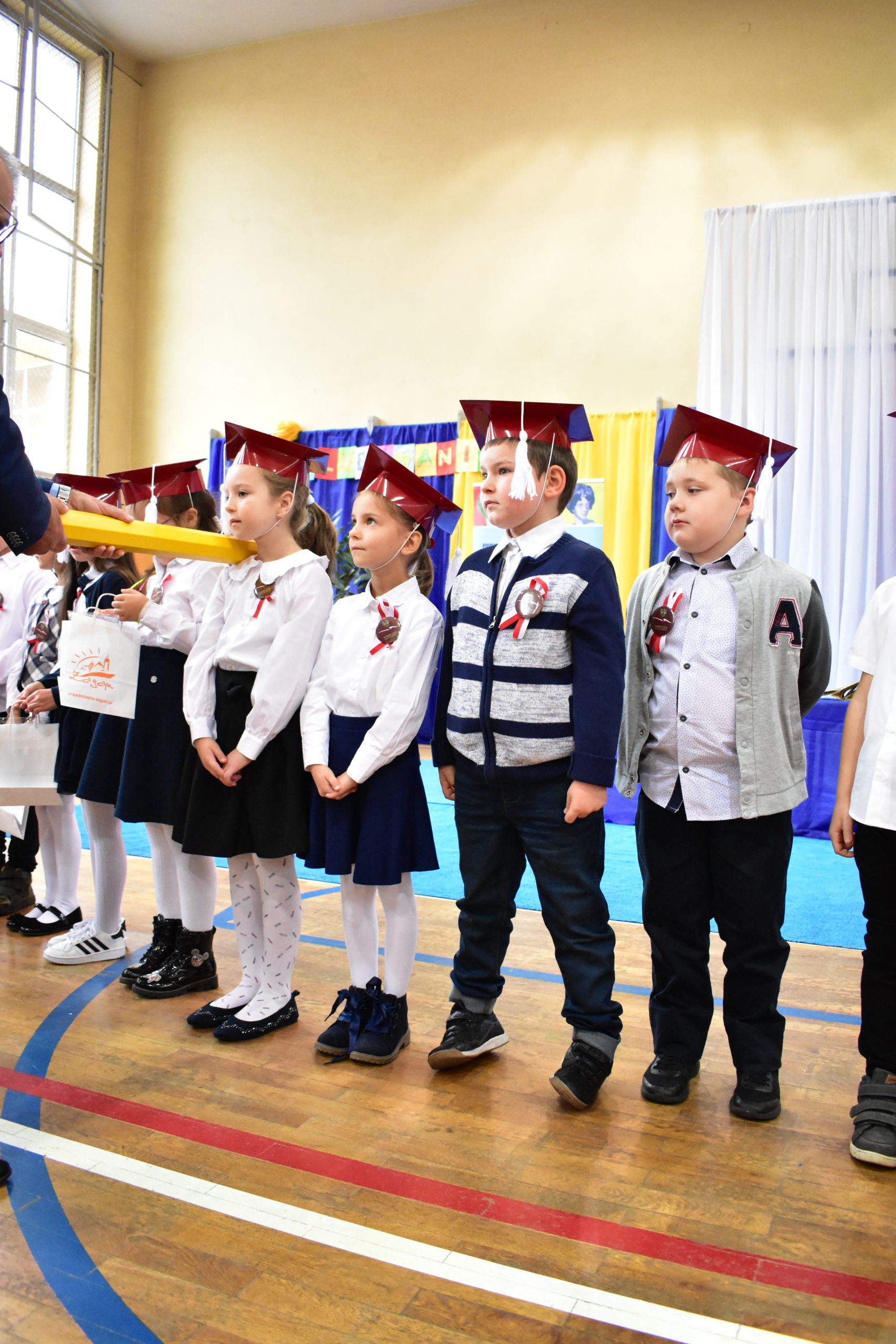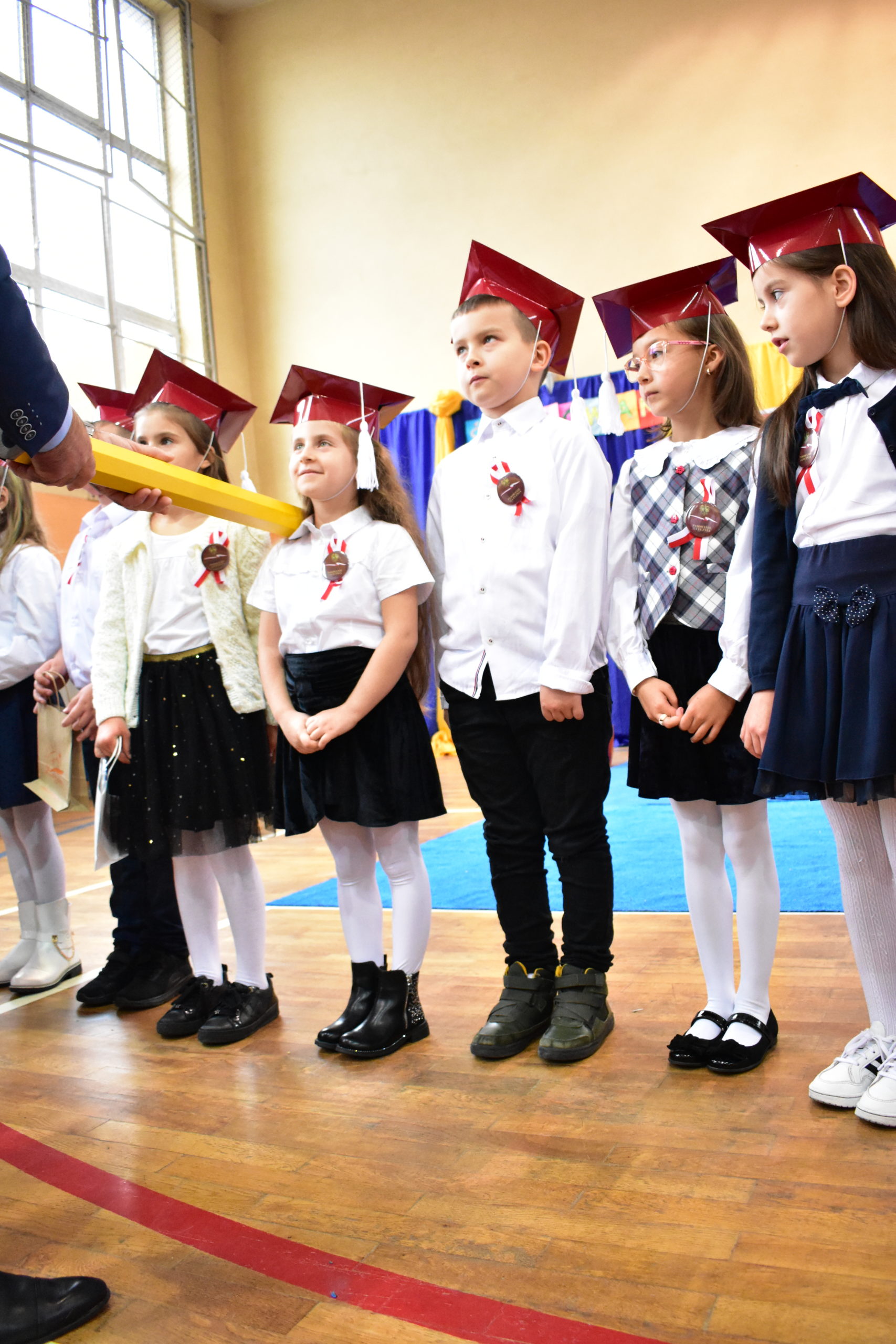 Uroczystość poprzedził krótki występ artystyczny. Przyszli uczniowie rozwiązywali zagadki, aby odzyskać ołówek potrzebny do pasowania. Dzieci podały prawidłowe rozwiązania, wprowadzono poczet sztandarowy, dzieci złożyły ślubowanie. Każdego pierwszoklasistę pasował na ucznia burmistrz Andrzej Katarzyniec. Dyrektor szkoły Dorota Stebelskaoraz naczelnik oświaty Mariusz Krugły wręczyli dzieciom drobne upominki. Każdy nowy uczeń otrzymał również tarczę szkolną.