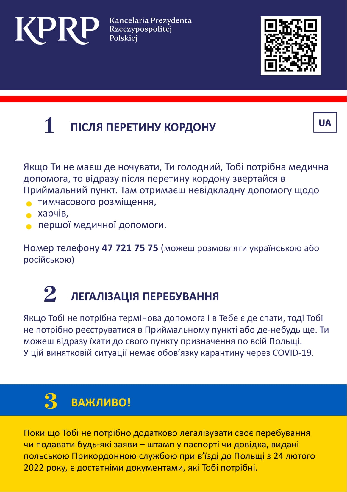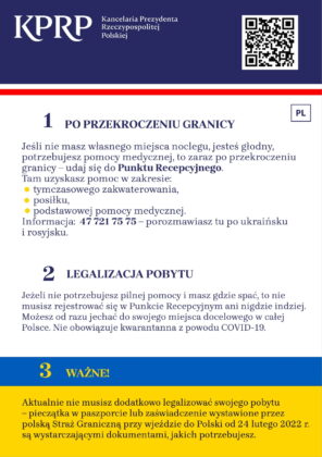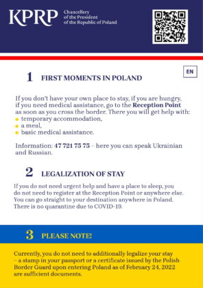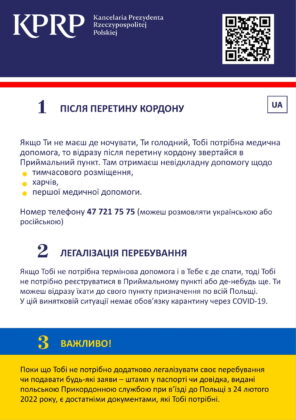 Publikujemy przystępne i czytelne ulotki  informacyjne dla uchodźców wojennych z Ukrainy, którzy przekroczyli granicę Polski. Ulotka ma ułatwić uchodźcom funkcjonowanie w pierwszych godzinach i dniach pobytu w naszym kraju.