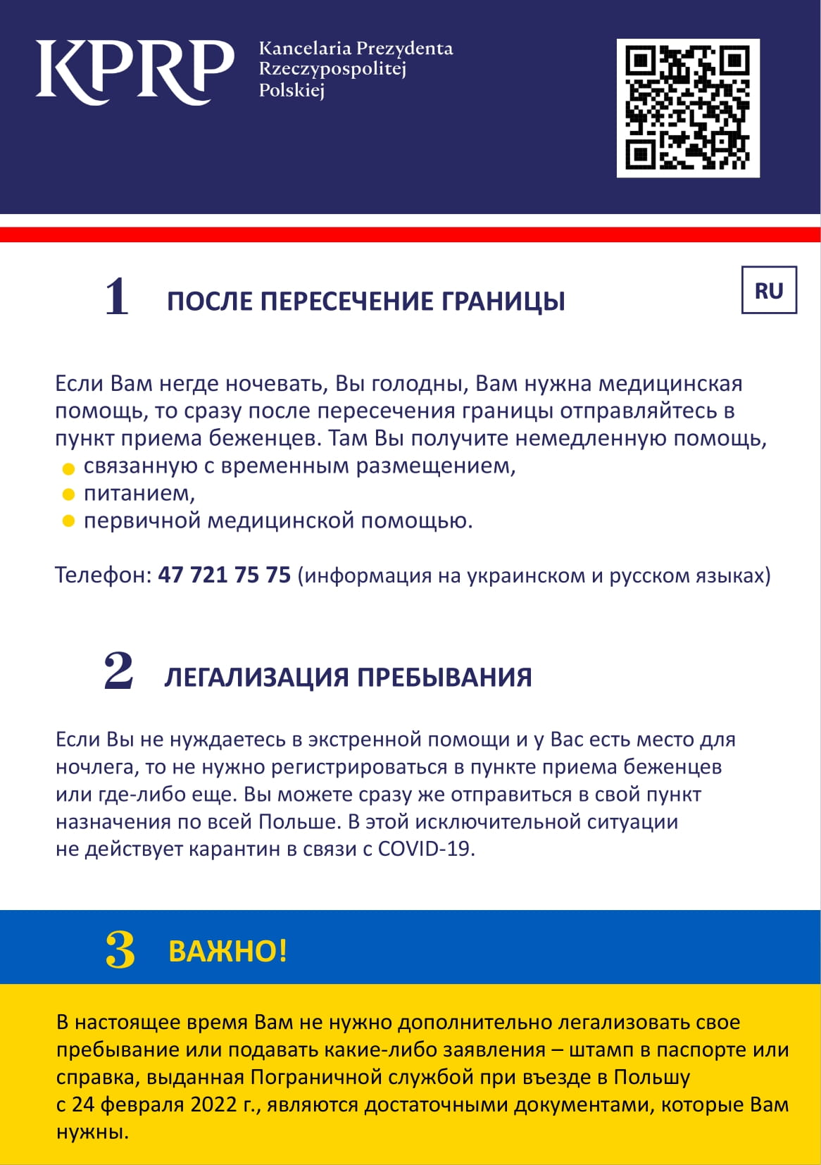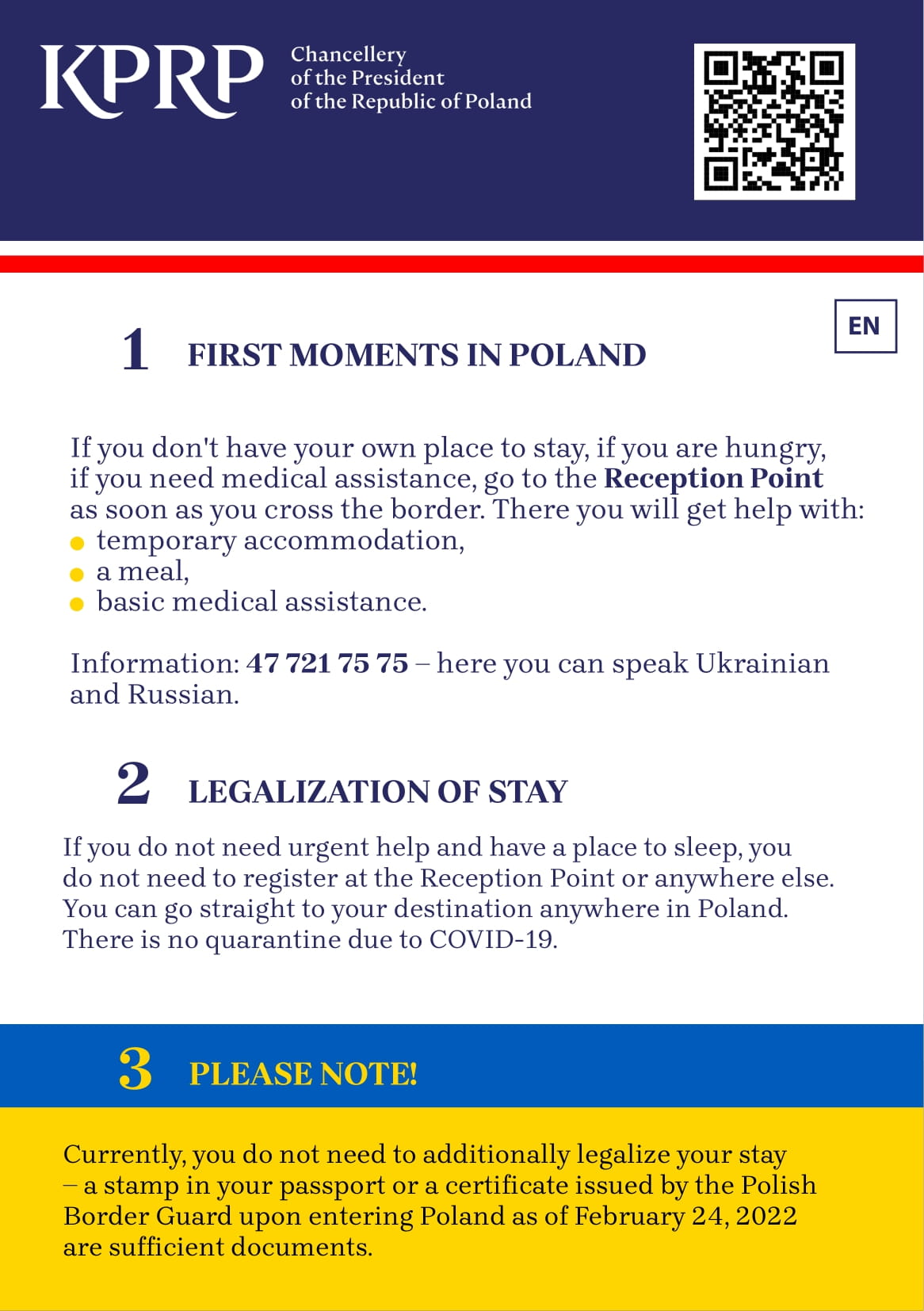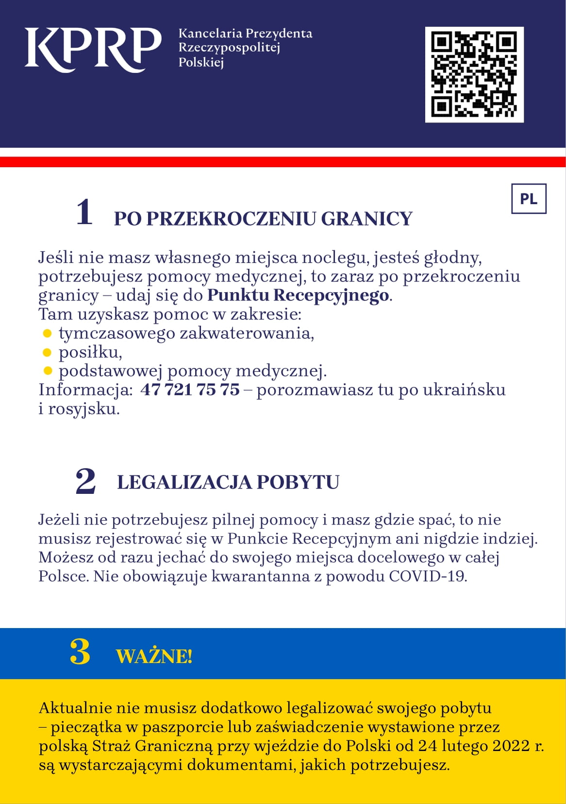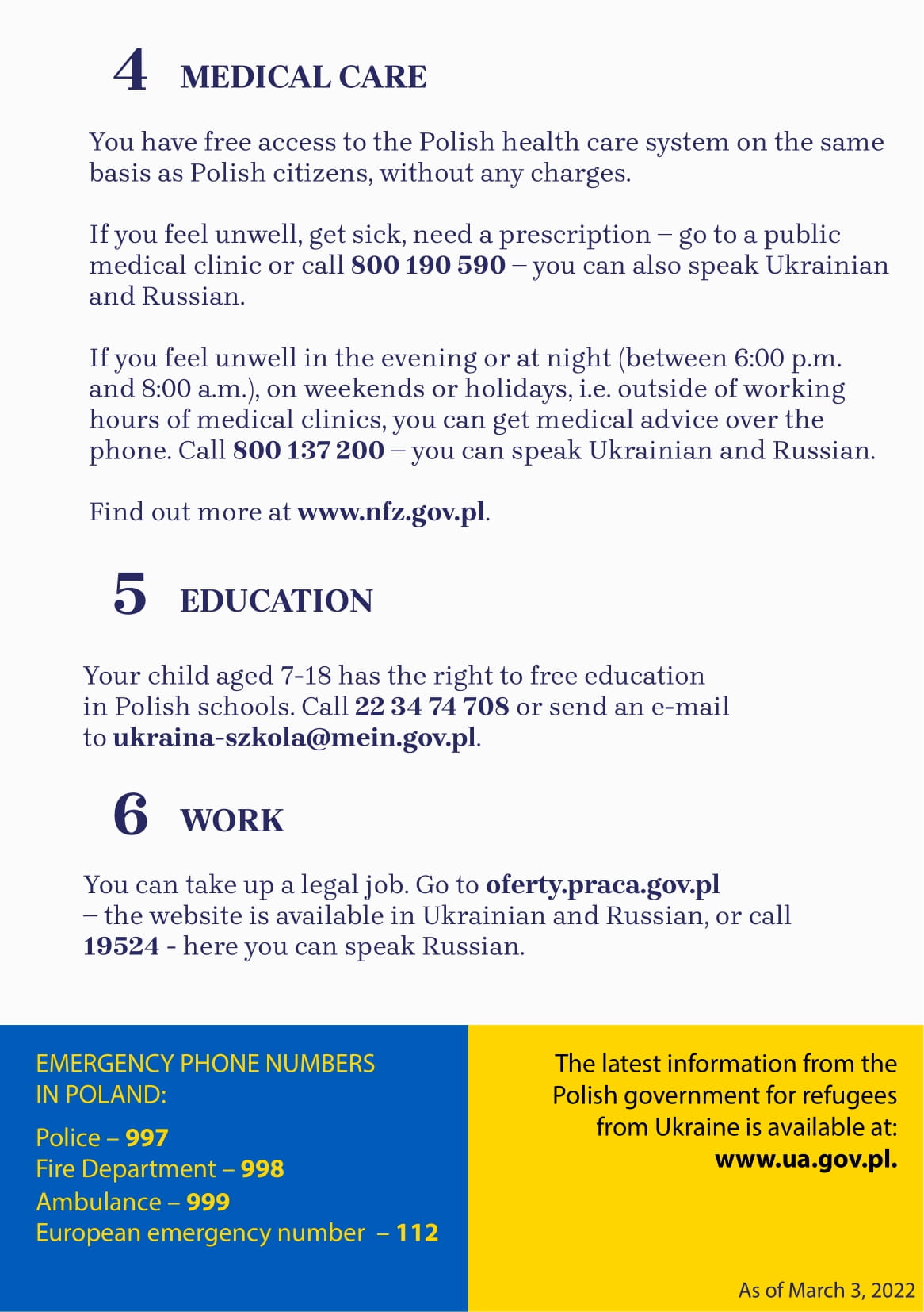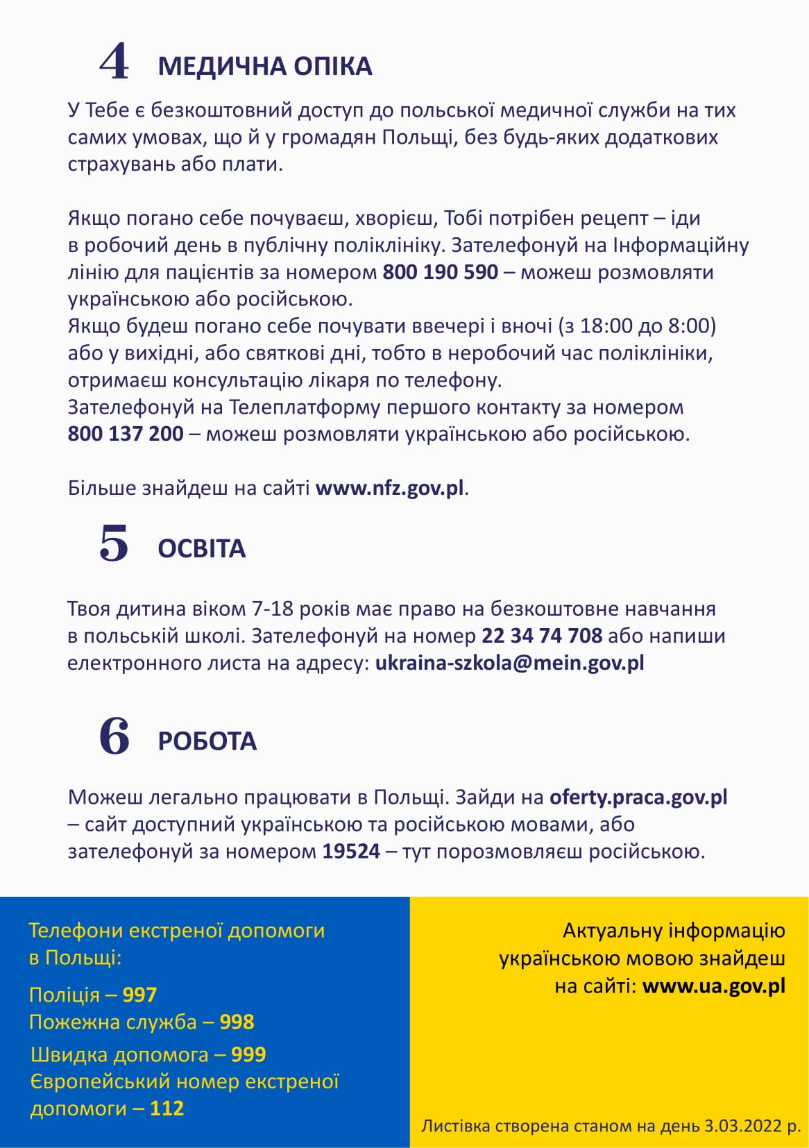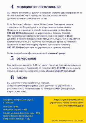 W ulotce znajdują się podstawowe wiadomości o punktach recepcyjnych, opiece medycznej, a także o możliwości poszukiwania pracy, edukacji dla dzieci oraz legalizacji pobytu wraz z telefonami i adresami internetowymi, pod którymi można uzyskać więcej informacji.