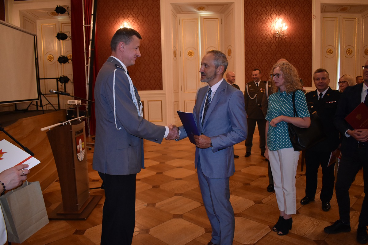 W tym roku uroczystość Powiatowych Obchodów Święta Policji w 103. rocznicę powołania Policji Państwowej odbyła się w czwartek (21 lipca) w Sali Kryształowej Pałacu Książęcego w Żaganiu. W uroczystej zbiórce udział wziął Zastępca Komendanta Wojewódzkiego Policji w Gorzowie Wielkopolskim młodszy inspektor Szymon Sędzik. W obchodach udział wzięli funkcjonariusze oraz pracownicy cywilni żagańskiej jednostki, kadra kierownicza, Zastępca Burmistrza Żagania Sebastian Kulesza, Starosta Powiatu Żagańskiego Henryk Janowicz, samorządowcy, przedstawiciele służb mundurowych oraz instytucji, które na co dzień współpracują z Komendą Powiatową Policji w Żaganiu.