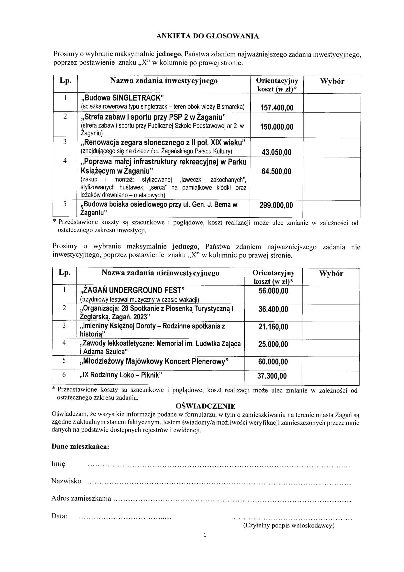 Oto lista zadań zakwalifikowanych do głosowania w ramach Żagańskiego Budżetu Obywatelskiego 2023: