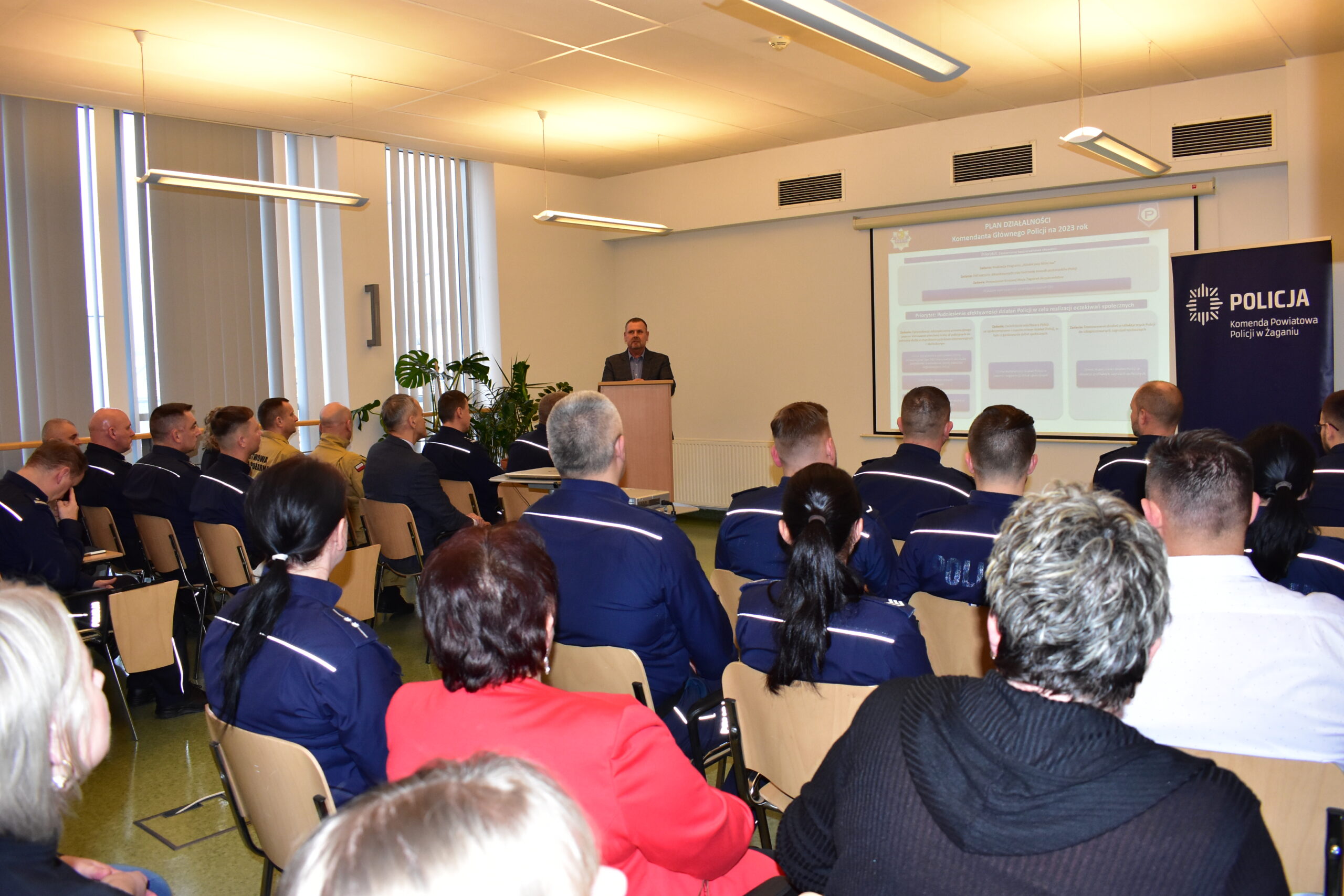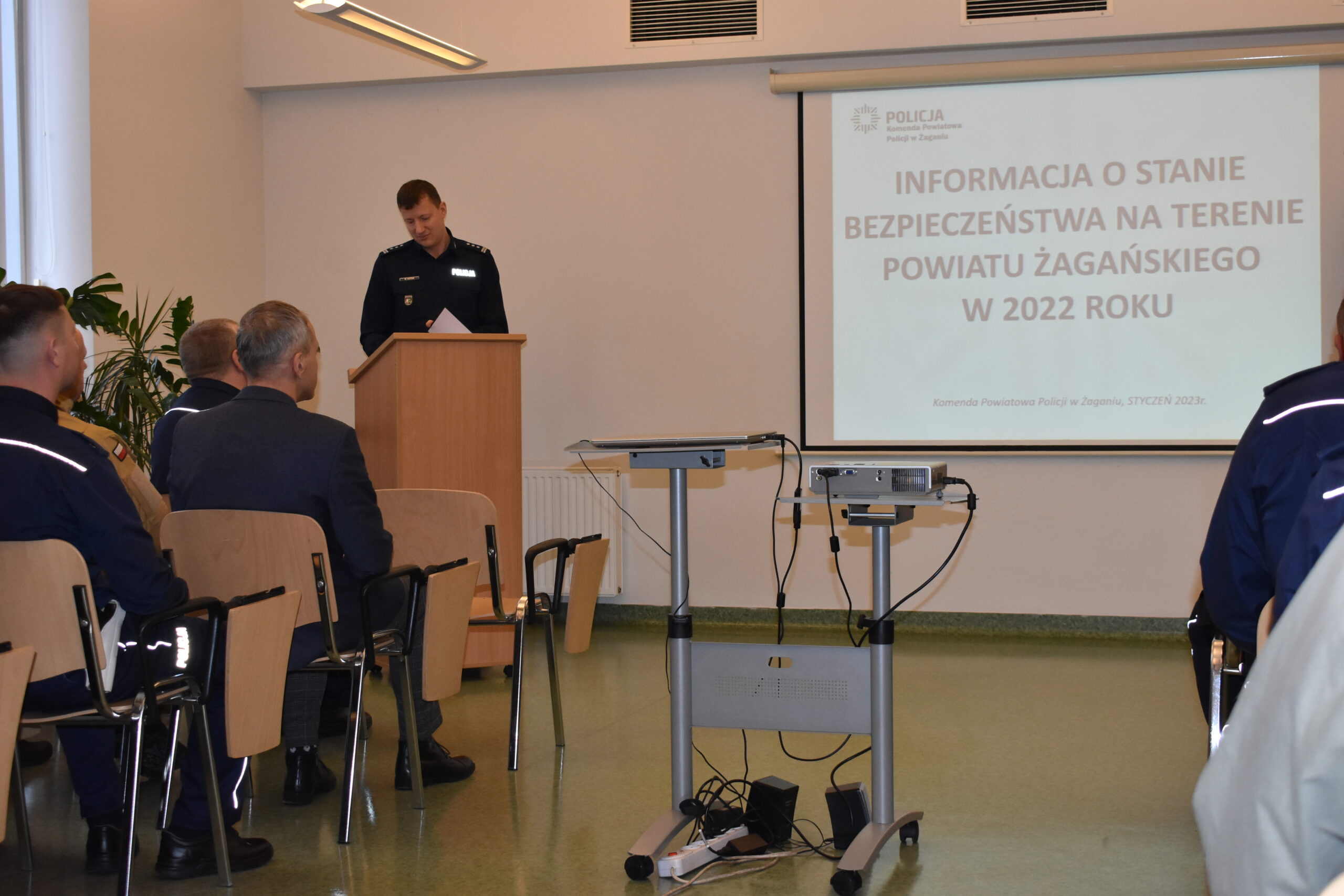 Zastępca burmistrza Sebastian Kulesza wziął udział w odprawie poświęconej ocenie stanu bezpieczeństwa na terenie powiatu żagańskiego. Sprawozdanie z działalności naszej policji przedstawił zaproszonym gościom Komendant Powiatowy Policji w Żaganiu, młodszy inspektor Marcin Sapun. W obecności Pierwszego Zastępcy Komendanta Wojewódzkiego Policji w Gorzowie Wielkopolskim inspektora Bogdana Piotrowskiego, przedstawicieli lokalnych służb mundurowych i prokuratury, starosty żagańskiego Henryka Janowicza oraz oficerów naszej komendy zaprezentowano najważniejsze z ubiegłorocznych interwencji oraz statystyki dotyczące podejmowanych działań. Zaprezentowano również potrzeby żagańskiej komendy. Największym problemem okazują się braki etatowe, mające ogromny wpływ na system pracy i ilość pełnionych dyżurów.
