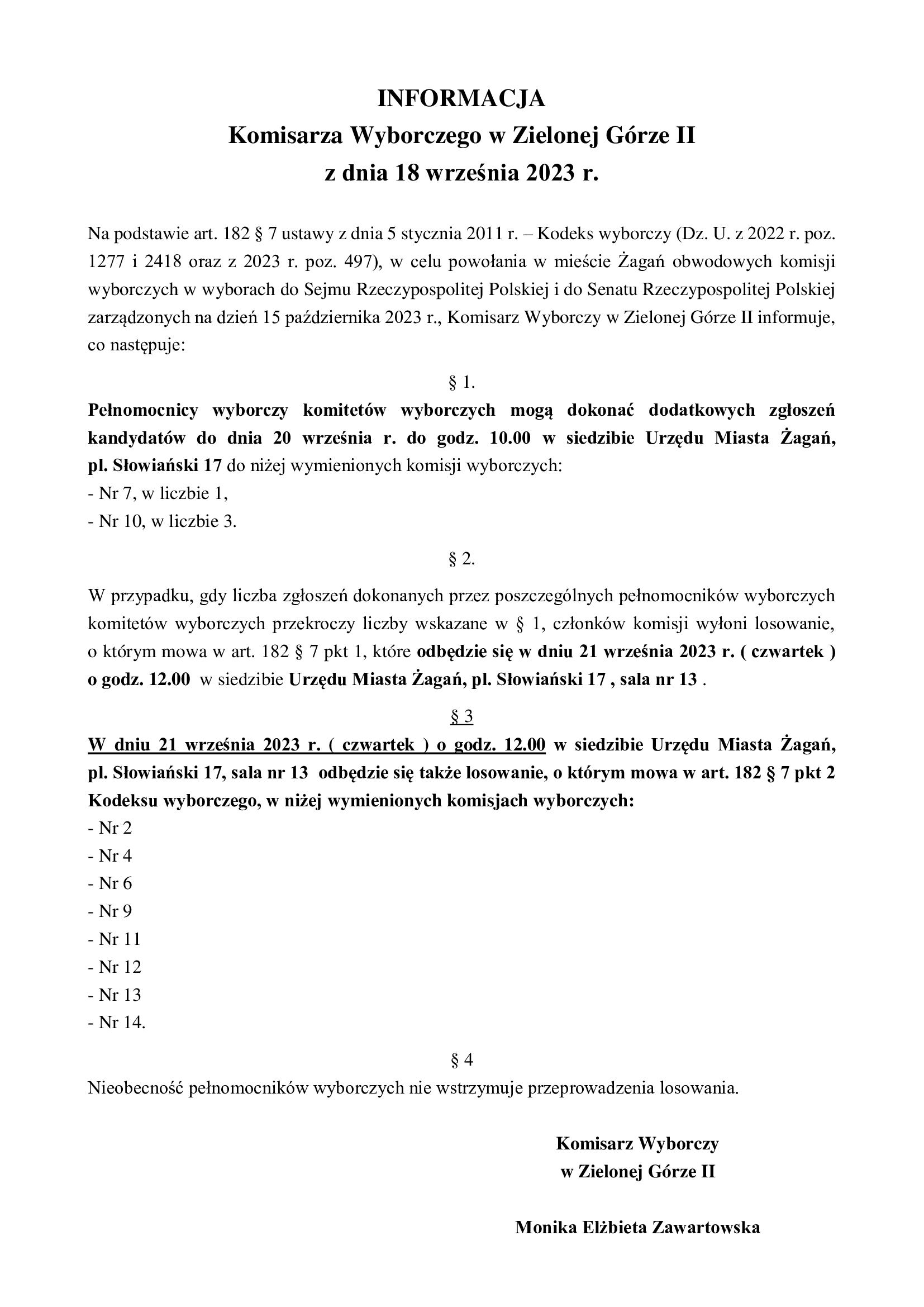 Komisarz Wyborczy w Zielonej Górze informuje, że pełnomocnicy wyborczy komitetów wyborczych mogą dokonać dodatkowych zgłoszeń kandydatów do dnia 20 września r. do godz. 10.00 w siedzibie Urzędu Miasta Żagań, pl. Słowiański 17 do niżej wymienionych komisji wyborczych: