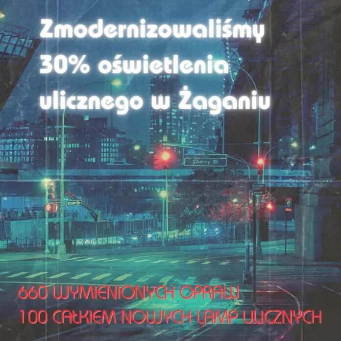 Na ulicy Keplera, Brackiej, Długiej, Skarbowej, Bema, Sportowej, na parkingu przy Jana III Sobieskiego, Libelta, Dworcowej, Bocznej i Dolnej, Żelaznej, Myśliwskiej, Księżnej Żaganny, Przyjaciół Żołnierza, Jarzębinowej, Asnyka, Świętej Barbary, Paderewskiego, Sienkiewicza, Nocznickiego, Kochanowskiego, Żarskiej, Nowogródzkiej, Armii Krajowej, Jana Pawła II, Staszica, obwodnica Żagania do Bożnowa, Piłsudskiego, Prusa, Cicha, Wojska Polskiego, Świętej Cecylii, Ratuszowej, Dąbrowskiego, Narutowicza, Łukasiewicza, Żwirki i Wigury, Robotniczej, Spokojnej, Wodnej, Chrobrego, Pomorskiej, Jarzębinowej, na rondzie 800-lecia. Na modernizację oświetlenia ulicznego w Żaganiu zabezpieczyliśmy ponad 1 milion 240 tysięcy złotych.