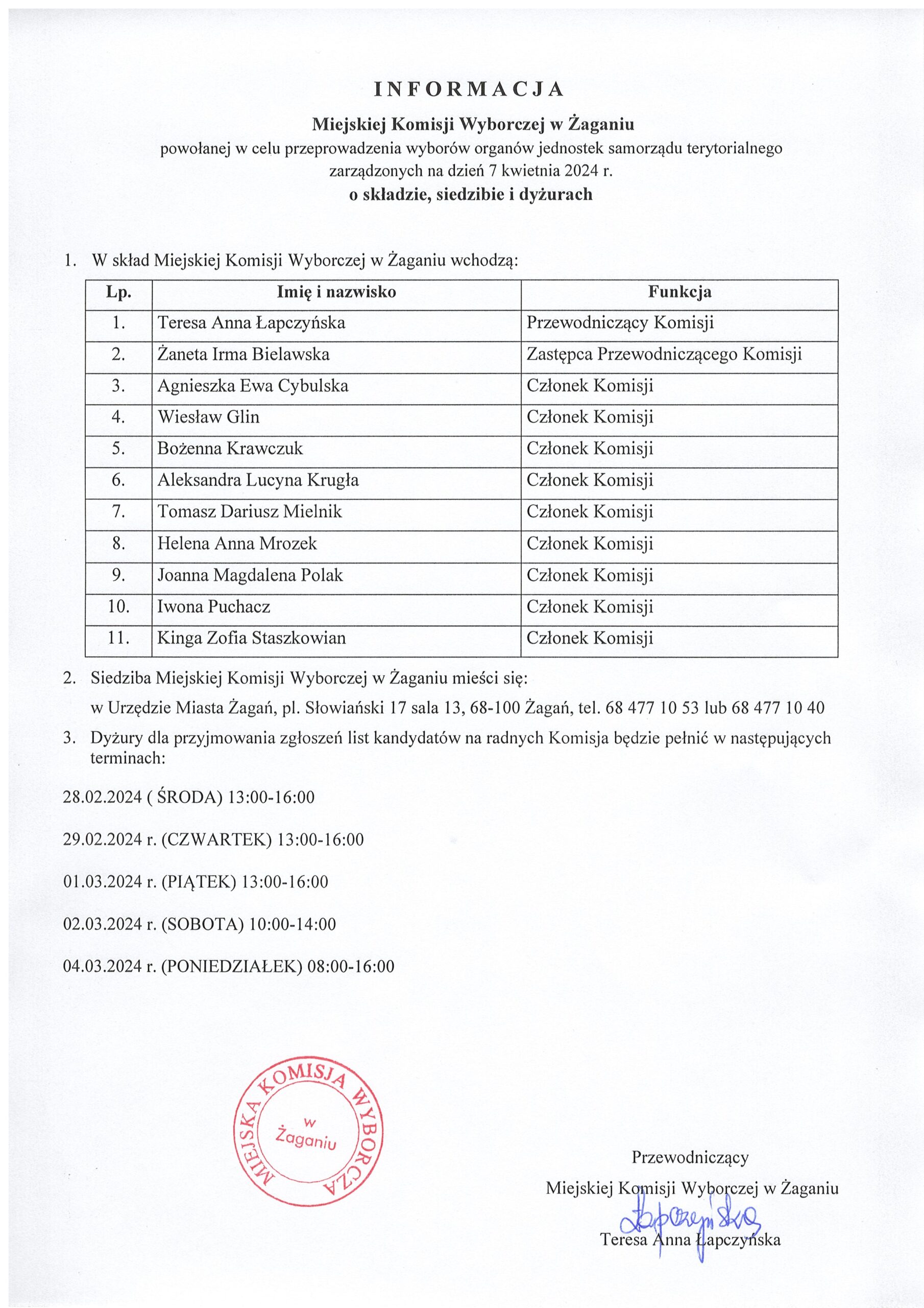 Informujemy, że Miejska Komisja Wyborcza w Żaganiu, która dyżurować będzie w siedzibie Urzędu Miasta Żagań od jutra (od 28 lutego 2024 roku), przyjmować będzie zgłoszenia list kandydatów na radnych w następujących terminach: