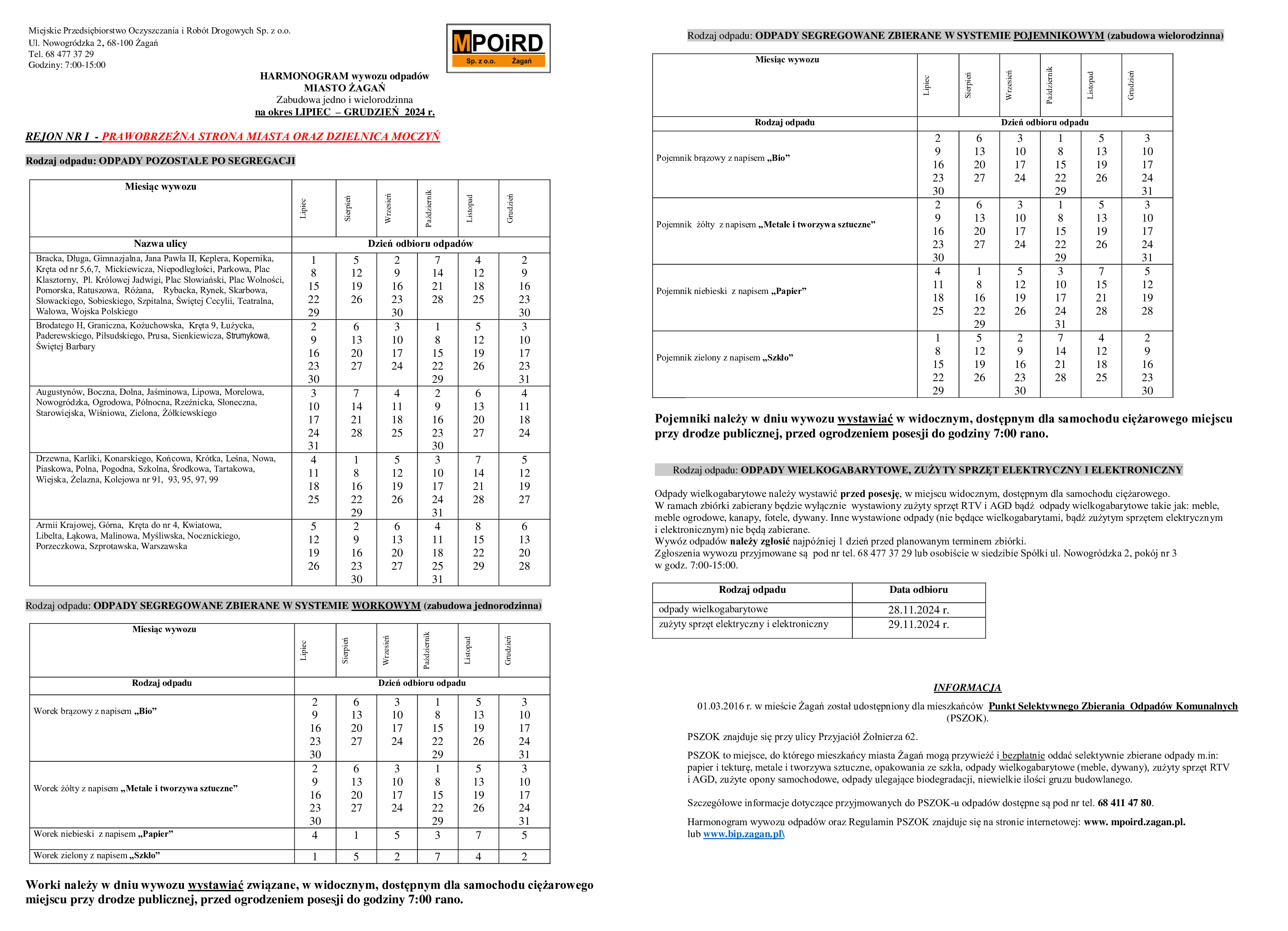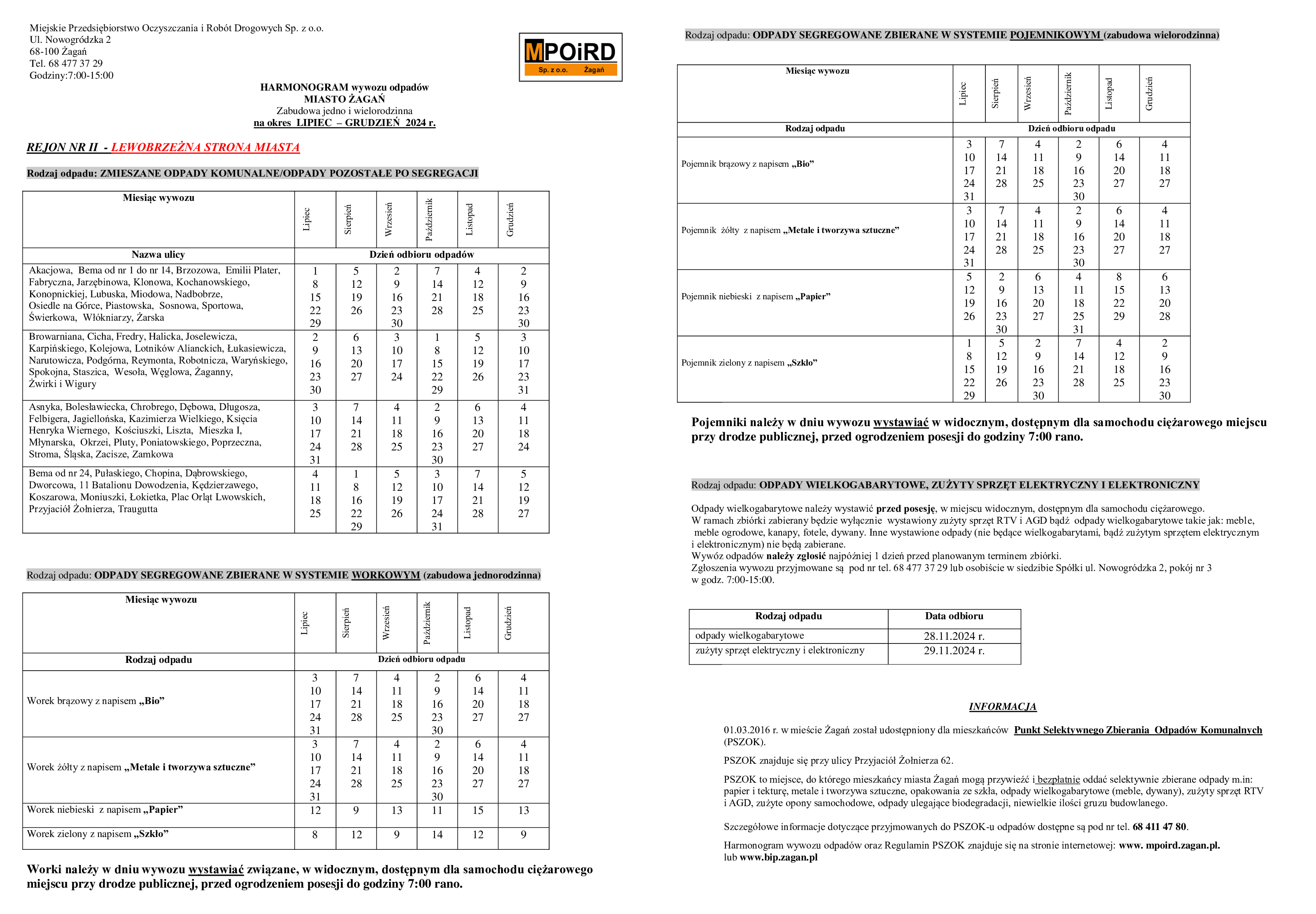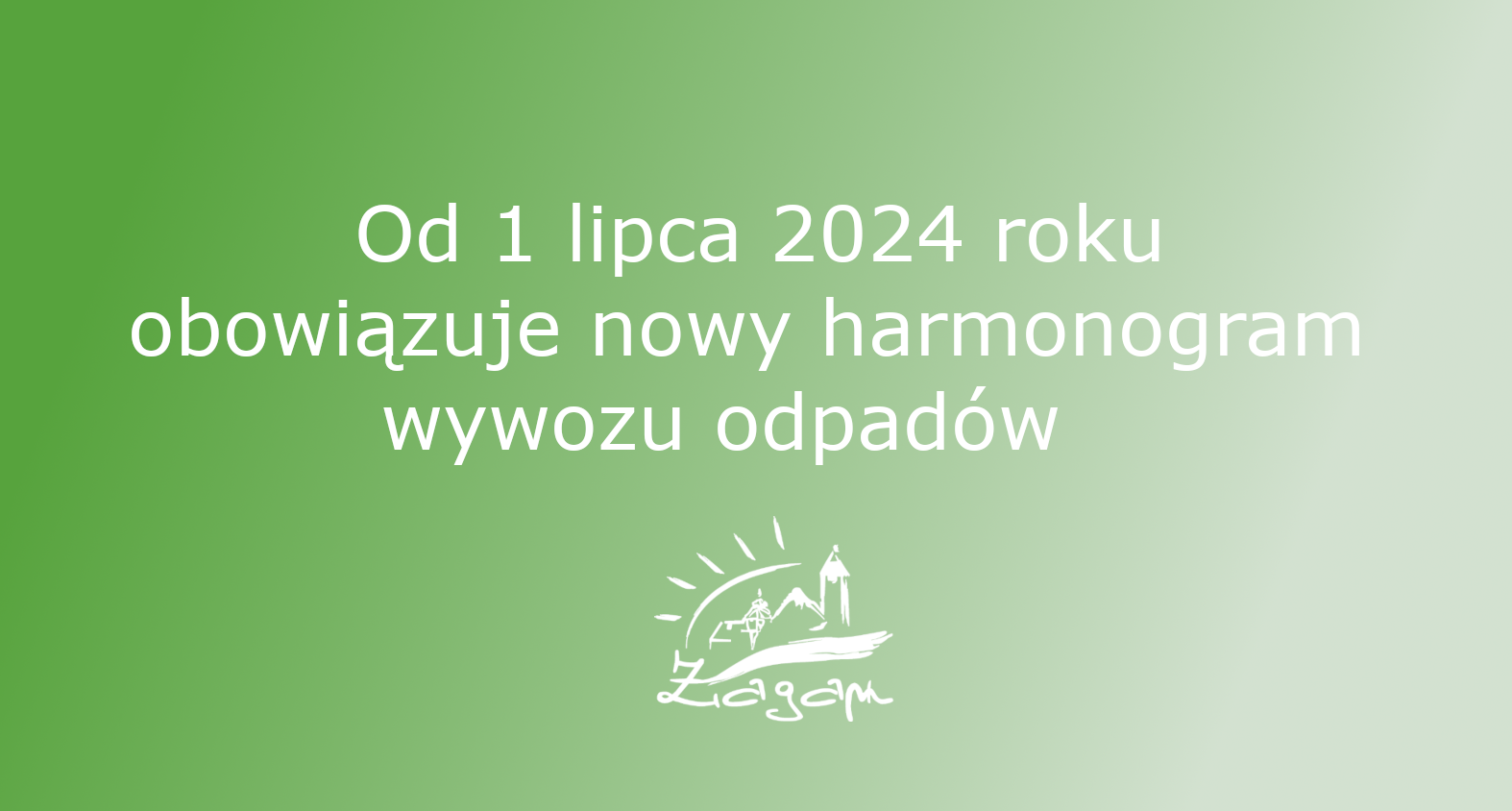 informujemy, że od 1 lipca do końca grudnia 2024 roku obowiązuje nowy harmonogram wywozu odpadów z terenu Miasta Żagań.