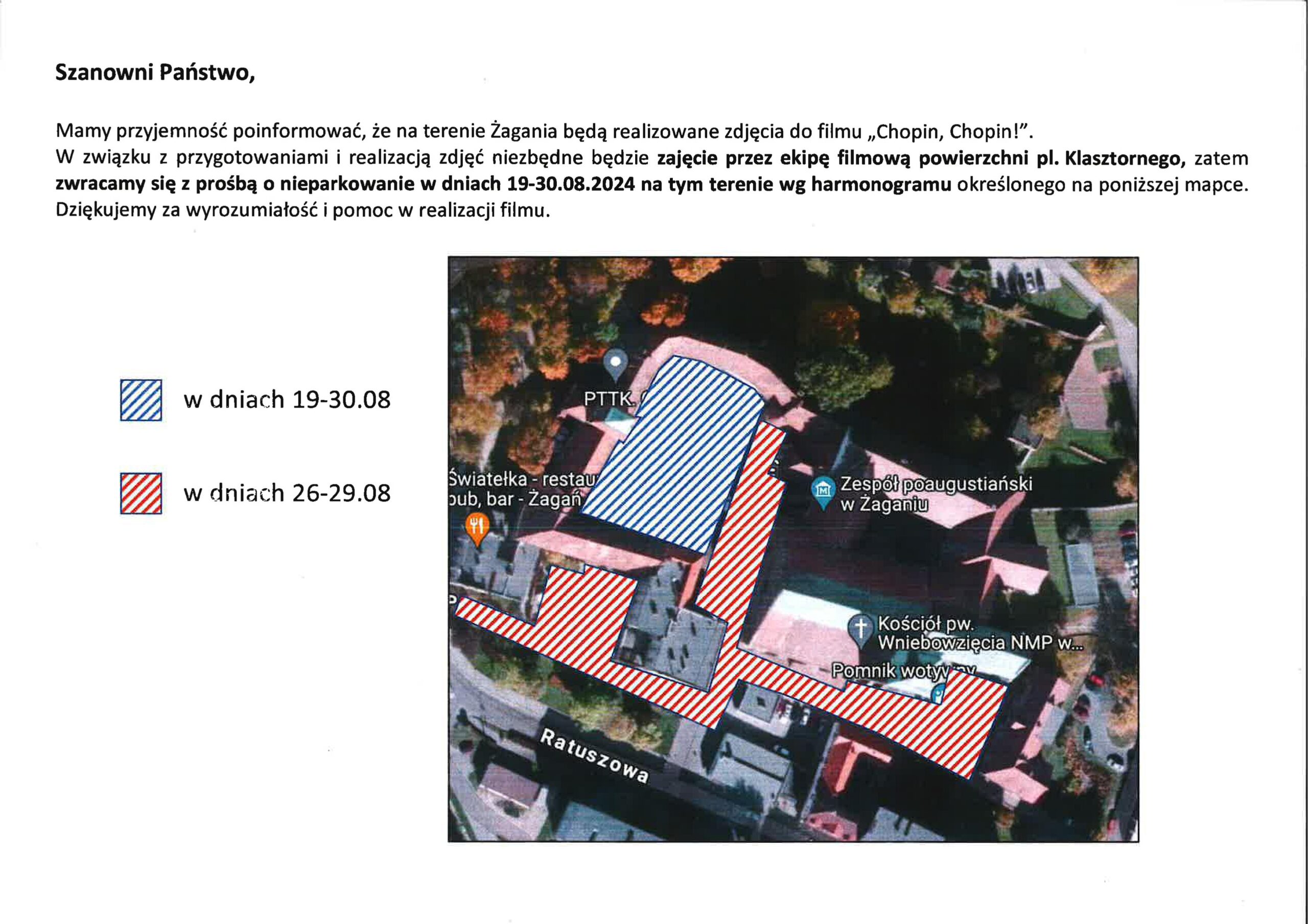 W związku z realizacją zdjęć do filmu fabularnego “Chopin, Chopin!” w dniach 19-30.08.2024 zostanie wprowadzona czasowa zmiana organizacji ruchu w okolicy pl. Klasztornego i ul. Ratuszowej w Żaganiu.