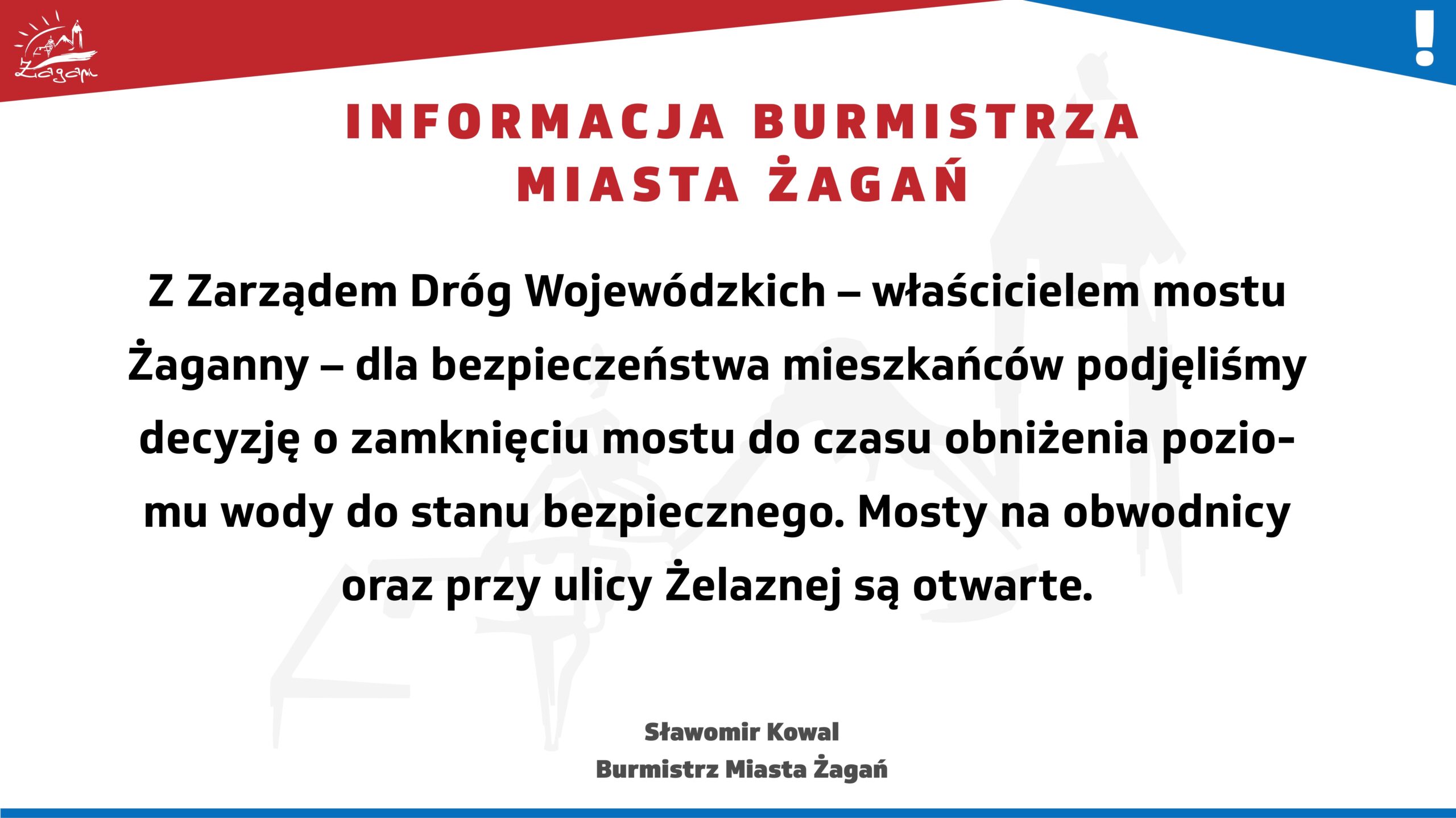 Home KOMUNIKATY Zamknięcie mostu Żaganny KOMUNIKATYURZĄD MIASTAWIADOMOŚCI Zamknięcie mostu Żaganny 2024.09.18 Zamykamy most Żaganny dla bezpieczeństwa mieszkańców do czasu obniżenia poziomu wody do stanu bezpiecznego. Zobacz równieżMORE FROM AUTHOR Żagańska Karta Mieszkańca Oświadczenie Burmistrza Miasta Żagań w sprawie oświaty Ruszył nabór wniosków do miejskiego programu wymiany kotłów na paliwa stałe