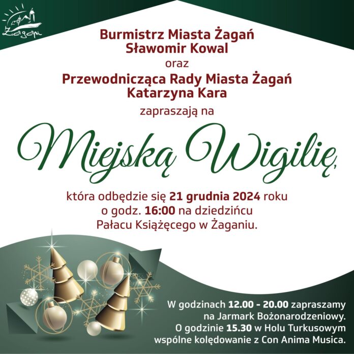 Serdecznie zapraszamy wszystkich mieszkańców Żagania na Miejską Wigilię, która odbędzie się 21 grudnia o godzinie 16:00 na dziedzińcu Pałacu Książęcego.