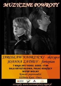 7 maja (niedziela) o godz. 17:00 w Sali Kryształowej Pałacu Książęcego odbędzie się niepowtarzalny koncert „Muzyczne Powroty” w wykonaniu Jarosława Nadrzyckiego (skrzypce) i Joanny Zathey (fortepian). Wstęp wolny - zapraszamy! Program koncertu "Muzyczne powroty" Jarosława Nadrzyckiego (skrzypce) oraz Joanny Zathey (fortepian): Johannes Brahms Scherzo c-moll Johannes Brahms I Sonata na skrzypce i fortepian G – […]
