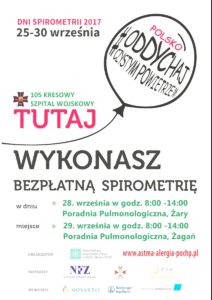 W ramach akcji "Zdrowe płuca Lubuszan" 105 Kresowy Szpital Wojskowy zaprasza na mieszkańców na dni spirometrii, w ramach których 29 września 2017 roku w godzinach od 8.00 do 14.00 w żagańskiej Poradni Pulmonologicznej można wykonać bezpłatne badanie.