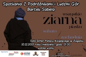 Zapraszamy w niedzielę, 10 grudnia o godz. 17.00 na pokaz slajdów: „Wszystkie ziarna piasku. Sahara Zachodnia” autorstwa Bartka Sabeli. Pokaz odbędzie się w ramach cyklicznych spotkań „Spotkania z Podróżnikami i Ludźmi Gór”. Sala Inter, Pałac Książęcy w Żaganiu – wstęp wolny